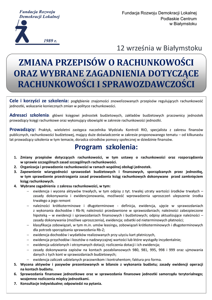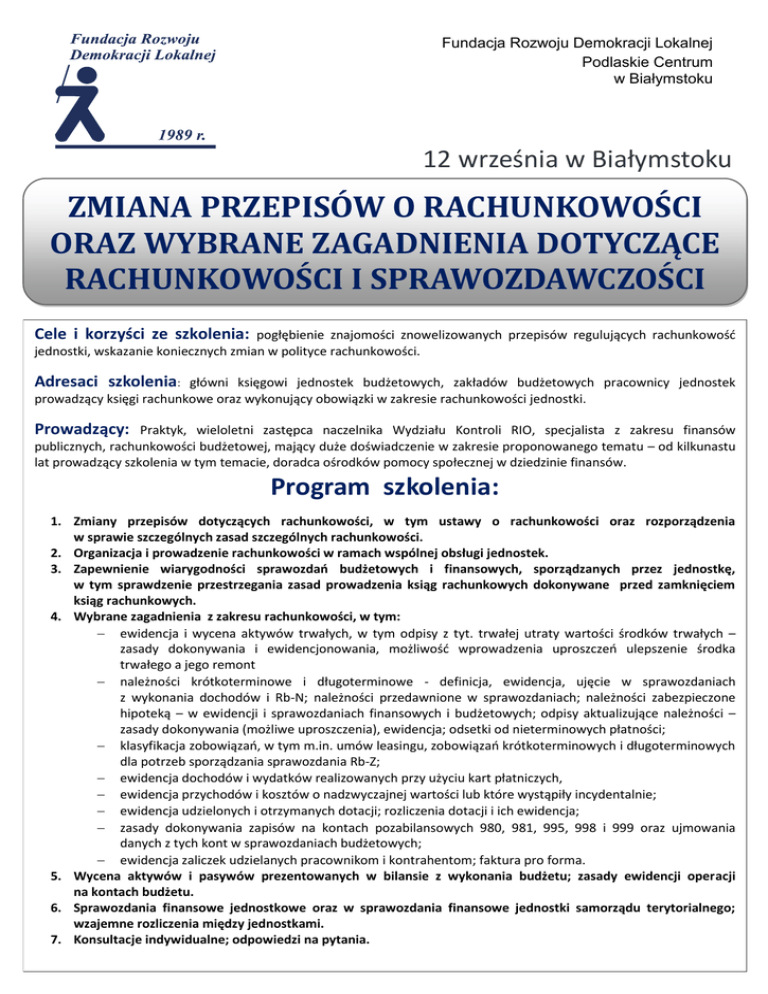Fundacja Rozwoju Demokracji Lokalnej Podlaskie Centrum w Białymstoku 12 września w Białymstoku ZMIANA PRZEPISÓW O RACHUNKOWOŚCI ORAZ WYBRANE ZAGADNIENIA DOTYCZĄCE RACHUNKOWOŚCI I SPRAWOZDAWCZOŚCI Cele i korzyści ze szkolenia: pogłębienie znajomości znowelizowanych przepisów regulujących rachunkowość jednostki, wskazanie koniecznych zmian w polityce rachunkowości. Adresaci szkolenia: główni księgowi jednostek budżetowych, zakładów budżetowych pracownicy jednostek prowadzący księgi rachunkowe oraz wykonujący obowiązki w zakresie rachunkowości jednostki. Prowadzący: Praktyk, wieloletni zastępca naczelnika Wydziału Kontroli RIO, specjalista z zakresu finansów publicznych, rachunkowości budżetowej, mający duże doświadczenie w zakresie proponowanego tematu – od kilkunastu lat prowadzący szkolenia w tym temacie, doradca ośrodków pomocy społecznej w dziedzinie finansów. Program szkolenia: 1. Zmiany przepisów dotyczących rachunkowości, w tym ustawy o rachunkowości oraz rozporządzenia w sprawie szczególnych zasad szczególnych rachunkowości. 2. Organizacja i prowadzenie rachunkowości w ramach wspólnej obsługi jednostek. 3. Zapewnienie wiarygodności sprawozdań budżetowych i finansowych, sporządzanych przez jednostkę, w tym sprawdzenie przestrzegania zasad prowadzenia ksiąg rachunkowych dokonywane przed zamknięciem ksiąg rachunkowych. 4. Wybrane zagadnienia z zakresu rachunkowości, w tym: ewidencja i wycena aktywów trwałych, w tym odpisy z tyt. trwałej utraty wartości środków trwałych – zasady dokonywania i ewidencjonowania, możliwość wprowadzenia uproszczeń ulepszenie środka trwałego a jego remont należności krótkoterminowe i długoterminowe - definicja, ewidencja, ujęcie w sprawozdaniach z wykonania dochodów i Rb-N; należności przedawnione w sprawozdaniach; należności zabezpieczone hipoteką – w ewidencji i sprawozdaniach finansowych i budżetowych; odpisy aktualizujące należności – zasady dokonywania (możliwe uproszczenia), ewidencja; odsetki od nieterminowych płatności; klasyfikacja zobowiązań, w tym m.in. umów leasingu, zobowiązań krótkoterminowych i długoterminowych dla potrzeb sporządzania sprawozdania Rb-Z; ewidencja dochodów i wydatków realizowanych przy użyciu kart płatniczych, ewidencja przychodów i kosztów o nadzwyczajnej wartości lub które wystąpiły incydentalnie; ewidencja udzielonych i otrzymanych dotacji; rozliczenia dotacji i ich ewidencja; zasady dokonywania zapisów na kontach pozabilansowych 980, 981, 995, 998 i 999 oraz ujmowania danych z tych kont w sprawozdaniach budżetowych; ewidencja zaliczek udzielanych pracownikom i kontrahentom; faktura pro forma. 5. Wycena aktywów i pasywów prezentowanych w bilansie z wykonania budżetu; zasady ewidencji operacji na kontach budżetu. 6. Sprawozdania finansowe jednostkowe oraz w sprawozdania finansowe jednostki samorządu terytorialnego; wzajemne rozliczenia między jednostkami. 7. Konsultacje indywidualne; odpowiedzi na pytania. SZKOLENIE: ZMIANA PRZEPISÓW O RACHUNKOWOŚCI ORAZ WYBRANE ZAGADNIENIA DOTYCZĄCE RACHUNKOWOŚCI I SPRAWOZDAWCZOŚCI DANE D O K ON T AK T U : Fundacja Rozwoju Demokracji Lokalnej Podlaskie Centrum ul. Choroszczańska 31 15-732 Białystok (Dawny budynek Wyższej Szkoły Ekonomicznej) tel./fax. 85 732 17 88, 85 732 94 84 e-mail: [email protected] w w w. frd l.b ia lys tok .p l OS OB A D O K ONT A K TU : Agnieszka Lipińska [email protected] Urszula Szczesiul [email protected] Marlena Dojlidko [email protected] Miejsce: SALA SZKOLENIOWA FRDL-PC ul. Choroszczańska 31, 15-732 Białystok (dawny budynek WSE) Termin i godzina: 12 września 2016 r. godz. 10.00-15.00 Cena: 330 zł/os. +23% VAT Rabat: 10% - za zgłoszenie 2 lub więcej osób Zwolnione z VAT przy finansowaniu szkolenia ze środków publicznych. Cena zawiera materiały szkoleniowe, zaświadczenie o ukończeniu szkolenia, lunch i serwis kawowy. Zgłoszenia: Wypełnioną kartę zgłoszenia (zamieszczona poniżej) należy przesłać faksem lub mailem do 5 września 2016 r. Płatność przelewem na podstawie faktury otrzymanej po szkoleniu. Karta zgłoszenia (e-mail: [email protected], fax 85 732 94 84) (prosimy o wypełnienie drukowanymi literami) Dane do faktury: .......................................................................................................................................................................... Adres............................................................................................................................................................................................. NIP................................................................................................................................................................................................. L.p. Imię i nazwisko Dział/Wydział Tel. kontaktowy e-mail 1. 2. 3. Zgodnie z Ustawą o Ochronie Danych Osobowych z dnia 29.08.1997 r. wyrażam zgodę na przetwarzanie moich danych osobowych dla potrzeb działalności szkoleniowej FRDL Podlaskie Centrum - Oświadczam, że udział w szkoleniu finansowany jest w co najmniej 70% ze środków publicznych lub samorządowych, w związku z tym proszę o wystawienie faktury zwolnionej z podatku VAT. ……………………….………………………………….. UWAGA! podpis zgłaszającego uczestników Warunkiem uczestnictwa jest dokonanie zgłoszenia faksem pod nr (85) 732 94 84, na adres e-mail: [email protected] lub drogą pocztową na adres Ośrodka. Rezygnacja z uczestnictwa w szkoleniu może nastąpić telefonicznie na 2 dni robocze przed planowanym terminem szkolenia. W przypadku rezygnacji z potwierdzonego wcześniej uczestnictwa Centrum obciąży instytucje delegujące 50% kosztami ww. szkolenia. Konto: BPH 65 1060 0076 0000 3210 0019 7575 ZMIANA PRZEPISÓW O RACHUNKOWOŚCI ORAZ WYBRANE ZAGADNIENIA DOTYCZĄCE RACHUNKOWOŚCI I SPRAWOZDAWCZOŚCI – 12.09.2016 r.