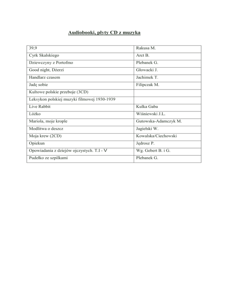 Audiobooki, płyty CD z muzyka 39,9 Rakusa M. Cyrk Skalskiego Arct B. Dziewczyny z Portofmo Plebanek G. Good night, Dżerzi Głowacki J. Handlarz czasem Jachimek T. Jadę sobie Filipczak M. Kultowe polskie przeboje (3CD) Leksykon polskiej muzyki filmowej 1930-1939 Live Rabbit Kulka Gaba Lóżko Wiśniewski J.L. Mariola, moje krople Gutowska-Adamczyk M. Modlitwa o deszcz Jagiełski W. Moja krew (2CD) Kowalska/Ciechowski Opiekun Jędrosz P. Opowiadania z dziejów ojczystych. T.I - V Wg. Gebert B. i G. Pudełko ze szpilkami Plebanek G.