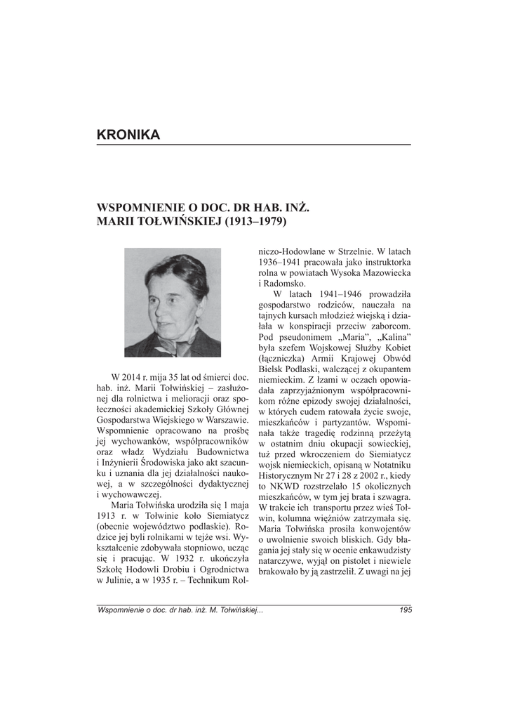 KRONIKA WSPOMNIENIE O DOC. DR HAB. INŻ. MARII TOŁWIŃSKIEJ (1913–1979) W 2014 r. mija 35 lat od śmierci doc. hab. inż. Marii Tołwińskiej – zasłużonej dla rolnictwa i melioracji oraz społeczności akademickiej Szkoły Głównej Gospodarstwa Wiejskiego w Warszawie. Wspomnienie opracowano na prośbę jej wychowanków, współpracowników oraz władz Wydziału Budownictwa i Inżynierii Środowiska jako akt szacunku i uznania dla jej działalności naukowej, a w szczególności dydaktycznej i wychowawczej. Maria Tołwińska urodziła się 1 maja 1913 r. w Tołwinie koło Siemiatycz (obecnie województwo podlaskie). Rodzice jej byli rolnikami w tejże wsi. Wykształcenie zdobywała stopniowo, ucząc się i pracując. W 1932 r. ukończyła Szkołę Hodowli Drobiu i Ogrodnictwa w Julinie, a w 1935 r. – Technikum Rol- niczo-Hodowlane w Strzelnie. W latach 1936–1941 pracowała jako instruktorka rolna w powiatach Wysoka Mazowiecka i Radomsko. W latach 1941–1946 prowadziła gospodarstwo rodziców, nauczała na tajnych kursach młodzież wiejską i działała w konspiracji przeciw zaborcom. Pod pseudonimem „Maria”, „Kalina” była szefem Wojskowej Służby Kobiet (łączniczka) Armii Krajowej Obwód Bielsk Podlaski, walczącej z okupantem niemieckim. Z łzami w oczach opowiadała zaprzyjaźnionym współpracownikom różne epizody swojej działalności, w których cudem ratowała życie swoje, mieszkańców i partyzantów. Wspominała także tragedię rodzinną przeżytą w ostatnim dniu okupacji sowieckiej, tuż przed wkroczeniem do Siemiatycz wojsk niemieckich, opisaną w Notatniku Historycznym Nr 27 i 28 z 2002 r., kiedy to NKWD rozstrzelało 15 okolicznych mieszkańców, w tym jej brata i szwagra. W trakcie ich transportu przez wieś Tołwin, kolumna więźniów zatrzymała się. Maria Tołwińska prosiła konwojentów o uwolnienie swoich bliskich. Gdy błagania jej stały się w ocenie enkawudzisty natarczywe, wyjął on pistolet i niewiele brakowało by ją zastrzelił. Z uwagi na jej Wspomnienie o doc. dr hab. inż. M. Tołwińskiej... 195 przeszłość konspiracyjną lata po 1945 r. także były dla niej trudne. W latach 1946–1948 pracowała jako kierownik Powiatowej Żeńskiej Szkoły Gospodarstwa Wiejskiego, a następnie pełniła obowiązki dyrektorki Liceum Rolniczego w Zagórzu koło Katowic. W latach 1948–1953 studiowała rolnictwo w wyższych szkołach w Cieszynie, Olsztynie i Warszawie (SGGW), uzyskując stopień inżyniera rolnika, a następnie magistra nauk agrotechnicznych w zakresie uprawy łąk i pastwisk. Jej praca magisterska napisana pod kierunkiem prof. Jana Grzymały została opublikowana w Rocznikach Nauk Rolniczych. W 1952 r. mgr inż. Maria Tołwińska została zatrudniona w SGGW na stanowisku starszego asystenta w Oddziale Dokumentacji Metodycznej i Dydaktycznej Studiów Zaocznych, przekształconym w 1954 r. w Dział Wydawnictw, gdzie pracowała w następnych latach jako zastępca kierownika. Jednocześnie prowadziła ćwiczenia z uprawy łąk i pastwisk na Wydziale Melioracji Wodnych, a także badania naukowe pod kierunkiem prof. Jana Grzymały na Wydziale Rolnym nad wybranymi zagadnieniami z biologii szelężnika większego. Na podstawie rozprawy z tego zakresu w 1960 r. uzyskała stopień doktora nauk rolniczych. W 1959 r. została zatrudniona na stanowisku asystenta na Wydziale Melioracji w nowo powołanym w Katedrze Torfoznawstwa Zakładzie Łąkoznawstwa. Od 1961 r. dr inż. Maria Tołwińska pracowała na stanowisku adiunkta w powstałej na Wydziale Katedrze Przyrodniczych Podstaw Melioracji, a następnie w utworzonym Instytucie o tej samej nazwie. W 1967 r. Rada Wydziału Melioracji nadała jej stopień dok196 tora habilitowanego w zakresie przyrodniczych podstaw melioracji wodnych, na podstawie oceny całokształtu dorobku naukowego i rozprawy habilitacyjnej pt. „Wpływ warunków siedliska na plony i utrzymanie niektórych gatunków roślin w runi łąk meliorowanych”. W 1968 r. otrzymała stanowisko docenta w SGGW. W latach 1974–1979 doc. dr inż. Maria Tołwińska była kierownikiem Zakładu Przyrodniczych Podstaw Melioracji, a w latach 1973–1975 – kierownikiem Studium Podyplomowego Użytkowania Zmeliorowanych Łąk i Pastwisk. Dorobek naukowy doc. dr hab. inż. Marii Tołwińskiej obejmuje ponad 120 pozycji, w tym 60 opublikowanych. Oryginalne prace twórcze stanowią 20 pozycji, publikacje popularno-naukowe i informacyjno-wdrożeniowe – 40. Prace niepublikowane to projekty, ekspertyzy i opracowania naukowe. Wygłosiła ponad 15 referatów na konferencjach naukowych. Jej praca naukowa koncentrowała się na związkach przyczynowo-skutkowych między zbiorowiskami roślinnymi łąk a ich warunkami wodnymi i troficznymi oraz na ocenie siedlisk łąkowych na potrzeby melioracyjne. Wyniki badań wniosły istotny wkład w rozwój ekologiczno-rolniczych podstaw melioracji łąk. Dydaktyka była jej pasją. Prowadzone przez nią wykłady i ćwiczenia odznaczały się dobrym przygotowaniem, dużym zaangażowaniem oraz umiejętnością przekonywania. Miała życzliwy stosunek do młodzieży, ale była wymagająca. Prowadziła na Wydziale Melioracji Wodnych zajęcia z uprawy łąk i pastwisk, a następnie z podstaw rolnictwa. Upowszechniała także wiedzę rolniczą poza uczelnią. Na uwagę zasługuje także wcześniejsza jej praca w średnich szkołach rolniczych. Miała znaczące osiągnięcia na uczelni w rozwoju młodej kadry. Była także współautorem kilku podręczników i skryptów akademickich, oraz autorem licznych recenzji rozpraw i artykułów naukowych. Przez 10 lat opiekowała się rocznikiem studiów stacjonarnych, była członkiem różnych komisji dziekańskich i rektorskich. Współuczestniczyła w organizowaniu konferencji naukowych. Odnosiła sukcesy jako kierownik zakładu i studium podyplomowego. Doc. dr hab. inż. Maria Tołwińska miała wyróżniające osiągnięcia w działalności organizacyjnej i sp
