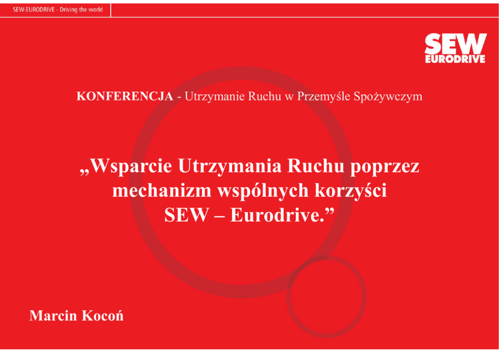 KONFERENCJA - Utrzymanie Ruchu w Przemyśle Spożywczym „Wsparcie Utrzymania Ruchu poprzez mechanizm wspólnych korzyści SEW – Eurodrive.” Marcin Kocoń SEW-Eurodrive na świecie Ponad 14.000 pracowników na całym świecie 75 Zakłady montażowe 15 Zakłady produkcyjne Jesteśmy w 44 krajach Istniejemy od 80 lat Siedziba główna Niemcy - Bruchsal 1400 pracowników Centralna produkcja komponentów elektromechanicznych i wyrobów gotowych Produkcja elektroniki przemysłowej Centrum logistyczne Centrum serwisowe – Graben Niemcy Centrum badań i rozwoju nowych produktów Centrum szkoleniowe Drive Academy SEW-Eurodrive Polska Sp. z o.o. Oddział międzynarodowego koncernu 84 wykwalifikowanych pracowników Siedziba zakład montażowy w Łodzi oraz nowoczesne Drive Technology Center w Tychach 6 biur handlowo-technicznych na terenie Polski Nowoczesny system informatyczny SAP ERP, który koordynuje i optymalizuje procesy produkcyjne, sprzedażowe i logistyczne Kompleksowa oferta wysokiej jakości systemów napędowych Indywidualne rozwiązania aplikacyjne dla wszystkich branż SEW-Eurodrive Polska Sp. z o.o. Zakład montażowy Wydajność zakładu to ok. 1.500 motoreduktorów miesięcznie SEW-Eurodrive Polska Sp. z o.o. Magazyn Ponad 5500 pozycji magazynowych Produkty oferta - CLASIC Motoreduktory/ Przekładnie przemysłowe/ Falowniki/ Elektronika Motoreduktory to…. zakres mocy 0,09 – 200 kW zakres momentu do 50 000 Nm wersje przeciwwybuchowe ATEX (G i D) wersje ASEPITC farba zewnętrzna wg potrzeb Klienta pokrycie antykorozyjne OS1...OS4 Na pierwszy Rzut oka Rodzaje falowników MOVITRAC LTE B Zakres mocy 1-fazowe 115V 0,37 – 1,1 kW Zakres mocy 1-fazowe 230V 0,37 – 2,2 kW Zakres mocy 3-fazowe 230V 0,37 – 4,0 kW Zakres mocy 3-fazowe 400V 0,75 – 7,5 kW MOVITRAC B Zakres mocy 1-fazowe 230V 0,25 – 2,2 kW Zakres mocy 3-fazowe 230V 0,25 – 30 kW Zakres mocy 3-fazowe 400V 0,25 – 75 kW MOVIDRIVE B Zakres mocy 3-fazowe 230V 1,5 – 37 kW Zakres mocy 3-fazowe 400V 0,55 – 315 kW DRIVE Technology Center Tychy 2012 r. otwarcie DRIVE Academy dział sprzedaży dział engineeringu serwis Produkty serwis – zielone światło dla produkcji eksperci z wieloletnim doświadczeniem naprawy urządzeń Retro-Fit – dobór zamienników diagnostyka, konserwacja, przeglądy szybki montaż Complete Drive Management: całościowy system obsługi produktu, będący częścią serwisu po sprzedaży. Produkty serwis Serwis mechaniczny i elektroniczny Linia serwisowa Hot-Line 24h +48 602-739-739 +48 602-SEW-SEW [email protected] INFOLINIA działu automatyki DRIVE EXPERTline 24h +48 703 602 502 koszt połączenia 4,22 zł/min brutto Produkty szkolenia Szkolenia produktowe i aplikacyjne typu Workshop Miejsce : sale szkoleniowe SEW lub w siedzibie klienta Nowoczesne modele szkoleniowe Doświadczeni inżynierowie aplikacyjni Produkty szkolenia - tematyka www.sew-szkolenia.pl – terminy, harmonogram, cennik falownik MOVITRAC® B – cechy, funkcjonalność, parametryzacja falownik MOVIDRIVE® B – cechy, funkcjonalność, parametryzacja programowanie IPOS system wieloosiowy MOVIAXIS® - – cechy, funkcjonalność, parametryzacja dobór napędów do aplikacji - GRAPHICAL WORKBENCH® technika decentralna motoreduktory – obsługa, konserwacja [email protected] – kontakt, zapytania ofertowe Internetowy portal dla klientów – nowoczesne narzędzie komunikacji, informacji i projektowania www.sew-eurodrive.pl Rejestracja użytkownika Dostępne funkcje portalu po zalogowaniu DriveConfigurator DriveCad Product ID Zapytanie ofertowe o zamiennik Newsletter Kontakt Dane osobowe Dodatkowe funkcje portalu dostępne na zapytanie – wymagają autoryzacji Monitorowanie zamówień Wykaz części zamiennych Wykaz ofert Sprzedaż części zamiennych DriveConfigurator Konfigurator motoreduktorów i falowników w wersji on-line Pobieranie rysunków CAD oraz dokumentacji Wysyłanie zapytania ofertowego e-SHOP - sprzedaż części zamiennych sprzedaż części zamiennych możliwość zamówienia części po nr fabrycznym koszty wysyłki po stronie SEW możliwość stworzenia szablonów zamówień Product ID - informacja o produktach SEW na podstawie nr fabrycznego Monitorowanie zamówień 4810xxxxx 4810xxxxx 4810xxxxx 4810xxxxx 4810xxxxx 4810xxxxx 4810xxxxx możliwość monitorowania swojego zamówienia dostęp do specyfikacji technicznej zamówionego napędu dostęp do dokumentacji oraz adresu wysyłki Monitorowanie zamówień 4810xxxxx Wykaz ofert możliwość przeglądania otrzymanych ofert dostęp do specyfikacji technicznej oferowanych napędu DriveCad Generowanie rysunków 2D oraz 3D Obracanie modeli 3D on-line Pobieranie plików CAD Zapytanie ofertowe o zamiennik Wysłanie zapytania ofertowego o zamiennik motoreduktora lub falownika Wykaz części zamiennych poszukiwanie i pobieranie listy części zamiennych w formacie PDF