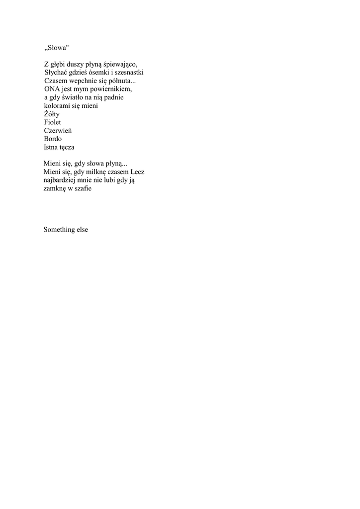 „Słowa" Z głębi duszy płyną śpiewająco, Słychać gdzieś ósemki i szesnastki Czasem wepchnie się półnuta... ONA jest mym powiernikiem, a gdy światło na nią padnie kolorami się mieni Żółty Fiolet Czerwień Bordo Istna tęcza Mieni się, gdy słowa płyną... Mieni się, gdy milknę czasem Lecz najbardziej mnie nie lubi gdy ją zamknę w szafie Something else „Samotność" Rodzi się w ciszy własnego sumienia... Odzywa się w nieodpowiednim momencie Wtedy, gdy jesteś sam jak rozbitek na samotnej wyspie... Samotność... Rodzi się, gdy marzysz o kimś kogo nie możesz mieć... Doskwiera, gdy widzisz JĄ z innym Jest nieodzownym wspólnikiem goryczy Samotność jest Twą towarzyszką... W słońcu.... W deszczu... Na plaży I w szkole Na przystanku I w ciszy własnego domu... Widzisz ją w innych I w sobie Samotność Ci towarzyszy Samotność Widzę ją w Twych oczach... Gdy marzysz o czymś czego nie możesz mieć Wtedy patrzę na Ciebie tak byś nie widział Z ukrycia... Zastanawiam się czego brakuje Ci do szczęścia Odpowiedź jest jedna: Spełnienia Twych marzeń Samotność nie jest zamkniętym kręgiem wydarzeń... Można temu zaradzić Potrzebna jest tylko życzliwa dłoń... Zastanawiam się teraz: jak mogę spełnić Twe marzenia? Odpowiesz? Something else .Wspomnienia' Spojrzenie uchwycone w locie Przelotny uśmiech Zwykłe cześć na gadu Nasze wczorajsze spotkanie Ukradkowe spojrzenia Rozmowa o niczym trwająca tyle Uśmiech, który tylko Ty wywołać możesz Dotyk, który czujesz przez cały dzień Pan w parku, który do złudzenia przypomina Ciebie... Twoje słowa gdzieś w głowie słyszane Spojrzenie w gwiazdy z myślą o 'lobie Śmiech Twój słyszany w innych ustach Wspomnienie tego roweru I tego spaceru Wszystko nabiera jakiegoś dziwnego blasku Sama nie wiem czemu A jednak się boje Konsekwencji tego czego byś chciał Spojrzeń złowrogich Słów jak nóż w plecy wbijanych Reakcji innych... Marzę by wszystko się dobrze skończyło Czasem marzę po prostu żeby być chłopcem Wtedy zupełnie inaczej patrzałabym na świat... Zielona gałązka na drzewie byłaby inna I kosmyk włosów opadający na czoło Przede wszystkim Ty byłbyś inny Więc pozostanę sobą Zamknę się tylko trochę w sobie I będę udawać, że żaden problem mnie nie dotyczy... Somethingelse