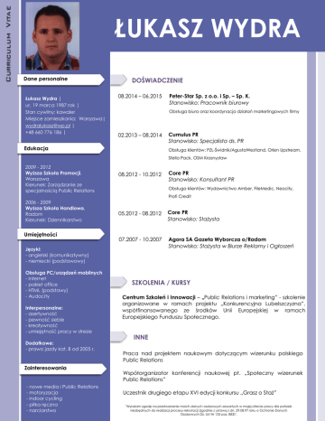 ŁUKASZ WYDRA Dane personalne Łukasz Wydra | ur. 19 marca 1987 rok | Stan cywilny: kawaler Miejsce zamieszkania: Warszawa| [email protected] | +48 660 776 186 | DOŚWIADCZENIE 08.2014 – 06.2015 Peter-Star Sp. z o.o. i Sp. – Sp. K. Stanowisko: Pracownik biurowy Obsługa biura oraz koordynacja działań marketingowych firmy 02.2013 – 08.2014 Edukacja Cumulus PR Stanowisko: Specjalista ds. PR Obsługa klientów: PZL-Świdnik/AgustaWestland, Orlen Upstream, Stella Pack, OSM Krasnystaw 2009 - 2012 Wyższa Szkoła Promocji, Warszawa Kierunek: Zarządzanie ze specjalnością Public Relations 08.2012 - 10.2012 Core PR Stanowisko: Konsultant PR Obsługa klientów: Wydawnictwo Amber, FileMedic, Neocity, Profi Credit 2006 - 2009 Wyższa Szkoła Handlowa, Radom Kierunek: Dziennikarstwo iKomunikacja Społeczna Umiejętności 05.2012 - 08.2012 Core PR Stanowisko: Stażysta 07.2007 - 10.2007 Agora SA Gazeta Wyborcza o/Radom Stanowisko: Stażysta w Biurze Reklamy i Ogłoszeń Języki: - angielski (komunikatywny) - niemiecki (podstawowy) Obsługa PC/urządzeń mobilnych - internet - pakiet office - HTML (podstawy) - Audacity Interpersonalne: - asertywność - pewność siebie - kreatywność - umiejętność pracy w stresie Dodatkowe: - prawo jazdy kat. B od 2005 r. Zainteresowania - nowe media i Public Relations - motoryzacja - indoor cycling - piłka ręczna - narciarstwo SZKOLENIA / KURSY Centrum Szkoleń i Innowacji – „Public Relations i marketing” - szkolenie organizowane w ramach projektu „Konkurencyjna Lubelszczyzna”, współfinansowanego ze środków Unii Europejskiej w ramach Europejskiego Funduszu Społecznego. INNE Praca nad projektem naukowym dotyczącym wizerunku polskiego Public Relations Współorganizator konferencji naukowej pt. „Społeczny wizerunek Public Relations” Uczestnik drugiego etapu XVI edycji konkursu „Grasz o Staż” "Wyrażam zgodę na przetwarzanie moich danych osobowych zawartych w mojej ofercie pracy dla potrzeb niezbędnych do realizacji procesu rekrutacji (zgodnie z ustawą z dn. 29.08.97 roku o Ochronie Danych Osobowych Dz. Ust Nr 133 poz. 883)".