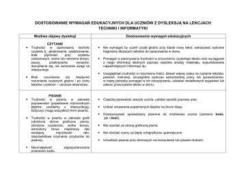 DOSTOSOWANIE WYMAGAŃ EDUKACYJNYCH DLA UCZNIÓW Z DYSLEKSJĄ NA LEKCJACH TECHNIKI I INFORMATYKI Możliwe objawy dysleksji CZYTANIE Trudności w opanowaniu techniki czytania tj.: głoskowanie, sylabizowanie, brak płynności przy czytaniu całościowym, wolne lub nierówne tempo, pauzy, przekręcanie wyrazów, domyślanie się, nie zwracanie uwagi na interpunkcje. Dostosowanie wymagań edukacyjnych Nie wymagać by uczeń czytał głośno przy klasie nowy tekst, wskazywać wybrane fragmenty dłuższych tekstów do opracowania w domu. Pomagać w pokonywaniu trudności w zrozumieniu czytanego tekstu oraz wyciąganie z niego informacji istotnych poprzez wspólne analizy materiału, wypunktowanie najważniejszych informacji itp. Uwzględniać trudności w rozumieniu treści, dawać więcej czasu na czytanie tekstów, poleceń, instrukcji, szczególnie podczas samodzielnej pracy lub sprawdzianów, w miarę potrzeby pomagać w ich odczytywaniu, udzielać dodatkowych wyjaśnień lub zalecić przeczytanie tekstu w domu. Częściej sprawdzać zeszyty ucznia, ustalać sposób poprawy prac. Unikać omawiania popełnionych błędów na forum klasy. Dostosowywać sprawdziany pisemne do możliwości ucznia (zarówno treść, jak i ilość). Nie oceniać za stronę graficzną pisma. Nie obniżać oceny za błędy ortograficzne, gramatyczne. Umożliwić pisanie prac domowych na komputerze lub pisanie drukiem. Brak rozumienia lub niepłynne rozumienie czytanych głośno i po cichu tekstów i poleceń – uboższe słownictwo. PISANIE Trudności w pisaniu w zakresie poprawności (popełnianie różnorodnych błędów, problemy z interpunkcją). Dotyczyć mogą wszystkich form pisania. Trudności w pisaniu w zakresie grafii (obniżona strona graficzna pisma, obniżona czytelność, wolne tempo, wzmożony tonus mięśniowy ręki wiodącej, męczliwość ręki, nieprawidłowe trzymanie przyborów do pisania). Nieumiejętność przestrzeni kartki. zagospodarowania WYPOWIEDZI Trudności w formułowaniu wypowiedzi ustnych i pisemnych na określony temat. Błędy gramatyczne w wypowiedziach ustnych i pisemnych. Trudności w wypowiedzi i instrukcji. rozumieniu słownych, dłuższych poleceń Trudności w formułowaniu wypowiedzi ustnych i pisemnych na określony temat. Kontrolować czy uczeń ma notatkę z lekcji, a w razie potrzeby skracać jej wielkość. W miarę możliwości przygotowywać krótkie notatki dla uczniów na kartkach zawierające najważniejsze informacje do wyuczenia. W przypadku trudności z odczytaniem pracy wskazane jest odpytanie ucznia ustnie. Umożliwić pisanie prac domowych na komputerze lub pisanie drukiem. W uzasadnionych przypadkach zastępować prace pisemne wypowiedziami ustnymi. W miarę możliwości unikać krótkich form sprawdzania wiedzy. Sprawdziany i kartkówki przygotowywać, w miarę możliwości, w formie testów wyboru. Tekst sprawdzianu powinien być powiększony, napisany prostszą czcionką tzw. bezszeryfową (zalecane: Arial, Comic Sans, Tahoma). W czasie odpowiedzi ustnych dyskretnie wspomagać, dawać więcej czasu na przypomnienie, wydobycie z pamięci nazw, terminów, dyskretnie naprowadzać. Podczas oceniania brać przede wszystkim pod uwagę stosunek ucznia do przedmiotu, jego chęci, wysiłek, przygotowanie do zajęć w materiały, niezbędne pomoce itp. Włączać do rywalizacji tylko tam, gdzie uczeń ma szanse. RYSOWANIE Trudności w rozplanowaniu rysunku. Przy ocenianiu prac brać pod uwagę wkład włożonej pracy i zaangażowanie ucznia. Zbyt silny lub zbyt słaby nacisk ołówka. Oceniać mniej rygorystycznie estetykę wykonania. Zmiany kierunku w rysunkach (błędny kierunek odwzorowywania). Podczas pracy na lekcji kontrolować prawidłowość (np. zgodność z poleceniem, kierunek odwzorowywania). Trudności w uczeniu się ze słuchu na lekcji, korzystaniu z wykładów, zapamiętywaniu. Rozłożyć naukę w czasie. Odpytywać częściej, ale z mniejszej partii materiału. Trudności w przyswajaniu materiału, zapamiętywaniu trudniejszych terminów, problemy z wykorzystaniem tej wiedzy w praktyce. Podczas odpowiedzi ustnych zadawać proste krótkie pytania, a w razie potrzeby zadawać pytania pomocnicze. Dąć więcej czasu na zastanowienie się i udzielenie odpowiedzi. Trudności w opanowywaniu definicji. Przygotowywać pomoce w formie plansz, modeli, tablic. Wykorzystywać różnorodne metody pracy bazujące na wszystkich zmysłach, nauczanie polisensoryczne. Wykorzystywać materiały multimedialne i komputery do ćwiczeń praktycznych. W doborze metod warto uwzględnić preferencje ucznia w zakresie indywidualnej strategii uczenia się (style uczenia się). wykonywanej pracy ZAPAMIĘTYWANIE pamięciowym TEMPO PRACY Wolne lub nierównomierne tempo pracy. Robienie przerw podczas pracy. Wydłużyć czas na wykonanie zadanej pracy, jeśli to możliwe, lub zmniejszyć jej objętość. Zmniejszyć ilość zadań w stosunku do innych uczniów. Zmniejszyć ilość zadań zadawanych do domu. Zwracać uwagę na to, aby uczeń na ławce posiadał tylko potrzebne przedmioty do zajęć. W momencie obniżenia koncentracji uwagi mobilizować go do aktywności. Nie krytykować , stosować ocenę opisową każdej wykonanej i ukończonej pracy (ważne jest , aby dostrzec coś pozytywnego i podkreślać to, skupiać się na dobrych, nawet najdrobniejszych aspektach pracy dziecka). Należy pamiętać , że zadania plastyczne usprawniają motorykę i koordynację wzrokowo-ruchową, nie należy więc z nich rezygnować, trzeba się starać, aby dziecko doprowadziło rozpoczętą pracę do końca . Nie dopuszczać do tego, aby dziecko na zajęciach nic nie robiło. KONCENTRACJA UWAGI Kłopoty z koncentracją uwagi. „Wyłączanie się” podczas pracy. SPRAWDZANIE WIEDZY Uzyskiwanie gorszych ocen ze sprawdzianów i odpowiedzi ustnych. Opracowała: Iwona Żukowska - pedagog . Zróżnicować formy sprawdzania wiedzy i umiejętności ucznia. Ograniczyć odpowiedzi ustne na f