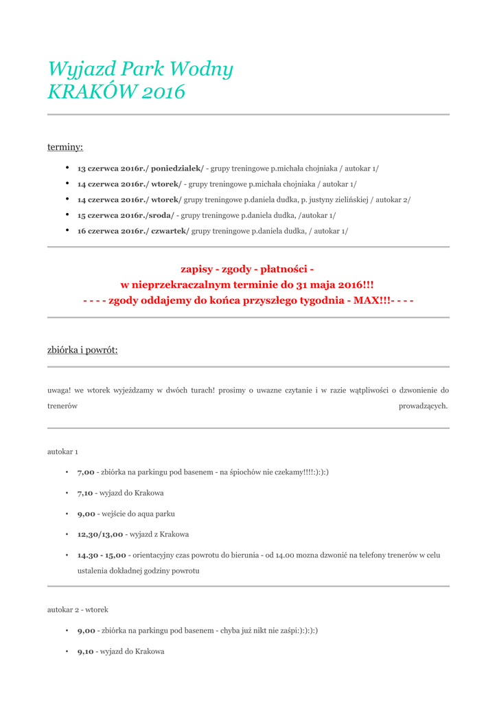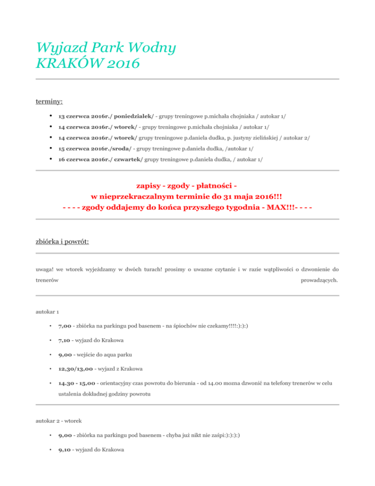 Wyjazd Park Wodny KRAKÓW 2016 terminy: • 13 czerwca 2016r./ poniedzialek/ - grupy treningowe p.michała chojniaka / autokar 1/ • 14 czerwca 2016r./ wtorek/ - grupy treningowe p.michała chojniaka / autokar 1/ • 14 czerwca 2016r./ wtorek/ grupy treningowe p.daniela dudka, p. justyny zielińskiej / autokar 2/ • 15 czerwca 2016r./sroda/ - grupy treningowe p.daniela dudka, /autokar 1/ • 16 czerwca 2016r./ czwartek/ grupy treningowe p.daniela dudka, / autokar 1/ zapisy - zgody - płatności w nieprzekraczalnym terminie do 31 maja 2016!!! - - - - zgody oddajemy do końca przyszłego tygodnia - MAX!!!- - - - zbiórka i powrót: uwaga! we wtorek wyjeżdzamy w dwóch turach! prosimy o uwazne czytanie i w razie wątpliwości o dzwonienie do trenerów prowadzących. autokar 1 • 7,00 - zbiórka na parkingu pod basenem - na śpiochów nie czekamy!!!!:):):) • 7,10 - wyjazd do Krakowa • 9,00 - wejście do aqua parku • 12,30/13,00 - wyjazd z Krakowa • 14.30 - 15,00 - orientacyjny czas powrotu do bierunia - od 14.00 mozna dzwonić na telefony trenerów w celu ustalenia dokładnej godziny powrotu autokar 2 - wtorek • 9,00 - zbiórka na parkingu pod basenem - chyba już nikt nie zaśpi:):):):) • 9,10 - wyjazd do Krakowa • 11,00 - wejście do aqua parku • 14,30/15,00 - wyjazd z Krakowa • ok 16,00 - 16,30 - orientacyjny czas powrotu do bierunia - od 15.00 mozna dzwonić na telefony trenerów w celu ustalenia dokładnej godziny powrotu jedzenie i picie: - proponujmy na drogę zaopatrzyć dzieci w jakąś drożdżówkę /pączka , oraz jakiś soczek. nie przesadzać z ilością kanapek i innych smakołyków bo potem kończy się to bólami brzucha :(:( - w aquaparku dzieci mogą sobie zakupić jakieś frytki, soczki - kwota 10-15zł spokojnie wystarczy. - czepek, okularki - nie są obowiązkowe - strój pływacki - obowiązkowy:):) - Młodsze dzieci / lub mnie ogarniete:)/ prosimy ubrać w strój na basen juz do autokaru! - logistycznie ułatwia nam to sprawne wejscie do parku:)