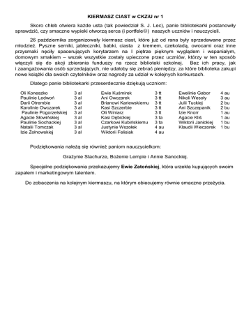 KIERMASZ CIAST w CKZiU nr 1 Skoro chleb otwiera każde usta (tak powiedział S. J. Lec), panie bibliotekarki postanowiły sprawdzić, czy smaczne wypieki otworzą serca (i portfele) naszych uczniów i nauczycieli. 26 października zorganizowały kiermasz ciast, które już od rana były sprzedawane przez młodzież. Pyszne serniki, jabłeczniki, babki, ciasta z kremem, czekoladą, owocami oraz inne przysmaki nęciły spacerujących korytarzem na I piętrze pięknym wyglądem i wspaniałym, domowym smakiem – wszak wszystkie zostały upieczone przez uczniów, którzy w ten sposób włączyli się do akcji zbierania funduszy na rzecz biblioteki szkolnej. Bez ich pracy, jak i zaangażowania osób sprzedających, nie udałoby się zebrać pieniędzy, za które biblioteka zakupi nowe książki dla swoich czytelników oraz nagrody za udział w kolejnych konkursach. Dlatego panie bibliotekarki przeserdecznie dziękują uczniom: Oli Koneszko Paulinie Ledwoń Darii Otrembie Karolinie Owczarek Paulinie Pogorzelskiej Agacie Słowińskiej Paulinie Sochackiej Natalii Tomczak Izie Żołnowskiej 3 al 3 al 3 al 3 al 3 al 3 al 3 al 3 al 3 al Ewie Kuśmirek Ani Owczarek Brianowi Kariewskiemu Kasi Szczerbie Oli Winiarz Kasi Dębickiej Czarkowi Kubińskiemu Justynie Wszołek Wiktorii Felisiak 3 tt 3 tt 3 tt 3 tt 3 tt 3 ta 3 ta 4 au 4 au Ewelinie Gabor Nikoli Wesoły Julii Tuckiej Ani Szczepanik Izie Knorr Agacie Kliś Wiktorii Janickiej Klaudii Wieczorek 4 au 3 au 2 bu 2 bu 1 au 1 au 1 bu 1 bu Podziękowania należą się również paniom nauczycielkom: Grażynie Stachurze, Bożenie Lempie i Annie Sanockiej. Specjalne podziękowania przekazujemy Ewie Zatońskiej, która urzekła kupujących swoim zapałem i marketingowym talentem. Do zobaczenia na kolejnym kiermaszu, na którym obiecujemy równie smaczne przeżycia.
