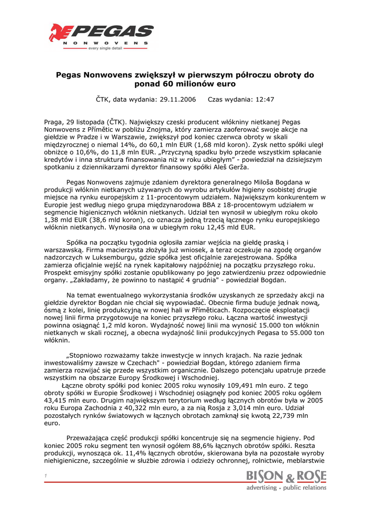 Pegas Nonwovens zwiększył w pierwszym półroczu obroty do ponad 60 milionów euro ČTK, data wydania: 29.11.2006 Czas wydania: 12:47 Praga, 29 listopada (ČTK). Największy czeski producent włókniny nietkanej Pegas Nonwovens z Přímětic w pobliżu Znojma, który zamierza zaoferować swoje akcje na giełdzie w Pradze i w Warszawie, zwiększył pod koniec czerwca obroty w skali międzyrocznej o niemal 14%, do 60,1 mln EUR (1,68 mld koron). Zysk netto spółki uległ obniżce o 10,6%, do 11,8 mln EUR. „Przyczyną spadku było przede wszystkim spłacanie kredytów i inna struktura finansowania niż w roku ubiegłym” - powiedział na dzisiejszym spotkaniu z dziennikarzami dyrektor finansowy spółki Aleš Gerža. Pegas Nonwovens zajmuje zdaniem dyrektora generalnego Miloša Bogdana w produkcji włóknin nietkanych używanych do wyrobu artykułów higieny osobistej drugie miejsce na rynku europejskim z 11-procentowym udziałem. Największym konkurentem w Europie jest według niego grupa międzynarodowa BBA z 18-procentowym udziałem w segmencie higienicznych włóknin nietkanych. Udział ten wynosił w ubiegłym roku około 1,38 mld EUR (38,6 mld koron), co oznacza jedną trzecią łącznego rynku europejskiego włóknin nietkanych. Wynosiła ona w ubiegłym roku 12,45 mld EUR. Spółka na początku tygodnia ogłosiła zamiar wejścia na giełdę praską i warszawską. Firma macierzysta złożyła już wniosek, a teraz oczekuje na zgodę organów nadzorczych w Luksemburgu, gdzie spółka jest oficjalnie zarejestrowana. Spółka zamierza oficjalnie wejść na rynek kapitałowy najpóźniej na początku przyszłego roku. Prospekt emisyjny spółki zostanie opublikowany po jego zatwierdzeniu przez odpowiednie organy. „Zakładamy, że powinno to nastąpić 4 grudnia" - powiedział Bogdan. Na temat ewentualnego wykorzystania środków uzyskanych ze sprzedaży akcji na giełdzie dyrektor Bogdan nie chciał się wypowiadać. Obecnie firma buduje jednak nową, ósmą z kolei, linię produkcyjną w nowej hali w Příměticach. Rozpoczęcie eksploatacji nowej linii firma przygotowuje na koniec przyszłego roku. Łączna wartość inwestycji powinna osiągnąć 1,2 mld koron. Wydajność nowej linii ma wynosić 15.000 ton włóknin nietkanych w skali rocznej, a obecna wydajność linii produkcyjnych Pegasa to 55.000 ton włóknin. „Stopniowo rozważamy także inwestycje w innych krajach. Na razie jednak inwestowaliśmy zawsze w Czechach" - powiedział Bogdan, którego zdaniem firma zamierza rozwijać się przede wszystkim organicznie. Dalszego potencjału upatruje przede wszystkim na obszarze Europy Środkowej i Wschodniej. Łączne obroty spółki pod koniec 2005 roku wynosiły 109,491 mln euro. Z tego obroty spółki w Europie Środkowej i Wschodniej osiągnęły pod koniec 2005 roku ogółem 43,415 mln euro. Drugim największym terytorium według łącznych obrotów była w 2005 roku Europa Zachodnia z 40,322 mln euro, a za nią Rosja z 3,014 mln euro. Udział pozostałych rynków światowych w łącznych obrotach zamknął się kwotą 22,739 mln euro. Przeważająca część produkcji spółki koncentruje się na segmencie higieny. Pod koniec 2005 roku segment ten wynosił ogółem 88,6% łącznych obrotów spółki. Reszta produkcji, wynosząca ok. 11,4% łącznych obrotów, skierowana była na pozostałe wyroby niehigieniczne, szczególnie w służbie zdrowia i odzieży ochronnej, rolnictwie, meblarstwie 1 i budownictwie. W 2005 roku spółka Pegas Nonwovens wyprodukowała łącznie 51,267 ton włóknin nietkanych, w porównaniu z 2,589 tonami w 1992 roku. Spółka Pegas Nonwovens (wcześniej Pegas) powstała w 1990 roku jako całkowicie nowa czeska firma prywatna. Przedmiotem jej działalności praktycznie od początku była produkcja włóknin nietkanych. Spółka ma zakłady w miejscowościach Bučovice i Přímětice. Grupa Pegas, którą zarządza londyński private equity fond Pamplona Capital Partners, obejmuje spółkę macierzystą w Luksemburgu, spółkę holdingową w Republice Czeskiej oraz cztery spółki operacyjne w Republice Czeskiej. Spółka zatrudnia w Czechach około 330 pracowników. sos mnj Aby uzyskać więcej informacji, prosimy o skontaktowanie się z: Vladimír Bystrov przedstawiciel medialny spółki Pegas Nonwovens Bison & Rose Public Relations Tel.: +420 233 014 040 GSM: +420 777 130 788 [email protected] 2