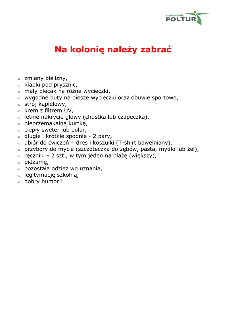 Na kolonię należy zabrać • • • • • • • • • • • • • • • • • zmiany bielizny, klapki pod prysznic, mały plecak na różne wycieczki, wygodne buty na piesze wycieczki oraz obuwie sportowe, strój kąpielowy, krem z filtrem UV, letnie nakrycie głowy (chustka lub czapeczka), nieprzemakalną kurtkę, ciepły sweter lub polar, długie i krótkie spodnie - 2 pary, ubiór do ćwiczeń – dres i koszulki (T-shirt bawełniany), przybory do mycia (szczoteczka do zębów, pasta, mydło lub żel), ręczniki - 2 szt., w tym jeden na plażę (większy), pidżamę, pozostała odzież wg uznania, legitymację szkolną, dobry humor !