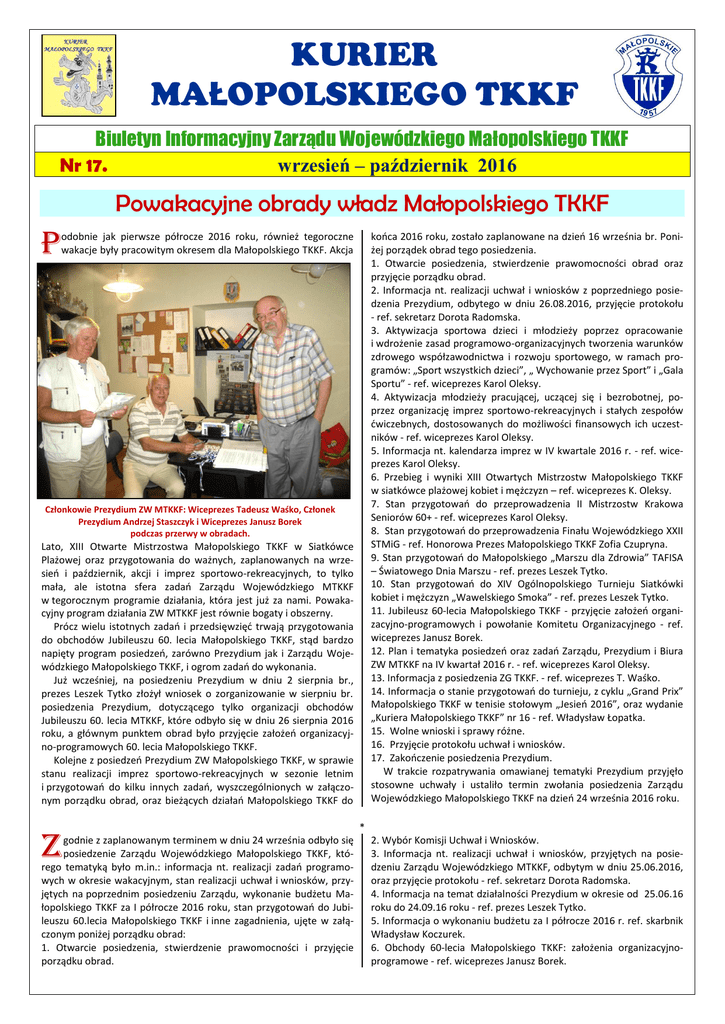 KURIER MAŁOPOLSKIEGO TKKF Biuletyn Informacyjny Zarządu Wojewódzkiego Małopolskiego TKKF Nr 17. wrzesień – październik 2016 Powakacyjne obrady władz Małopolskiego TKKF P odobnie jak pierwsze półrocze 2016 roku, również tegoroczne wakacje były pracowitym okresem dla Małopolskiego TKKF. Akcja końca 2016 roku, zostało zaplanowane na dzień 16 września br. Poniżej porządek obrad tego posiedzenia. 1. Otwarcie posiedzenia, stwierdzenie prawomocności obrad oraz przyjęcie porządku obrad. 2. Informacja nt. realizacji uchwał i wniosków z poprzedniego posiedzenia Prezydium, odbytego w dniu 26.08.2016, przyjęcie protokołu - ref. sekretarz Dorota Radomska. 3. Aktywizacja sportowa dzieci i młodzieży poprzez opracowanie i wdrożenie zasad programowo-organizacyjnych tworzenia warunków zdrowego współzawodnictwa i rozwoju sportowego, w ramach programów: „Sport wszystkich dzieci”, „ Wychowanie przez Sport” i „Gala Sportu” - ref. wiceprezes Karol Oleksy. 4. Aktywizacja młodzieży pracującej, uczącej się i bezrobotnej, poprzez organizację imprez sportowo-rekreacyjnych i stałych zespołów ćwiczebnych, dostosowanych do możliwości finansowych ich uczestników - ref. wiceprezes Karol Oleksy. 5. Informacja nt. kalendarza imprez w IV kwartale 2016 r. - ref. wiceprezes Karol Oleksy. 6. Przebieg i wyniki XIII Otwartych Mistrzostw Małopolskiego TKKF w siatkówce plażowej kobiet i mężczyzn – ref. wiceprezes K. Oleksy. 7. Stan przygotowań do przeprowadzenia II Mistrzostw Krakowa Seniorów 60+ - ref. wiceprezes Karol Oleksy. 8. Stan przygotowań do przeprowadzenia Finału Wojewódzkiego XXII STMiG - ref. Honorowa Prezes Małopolskiego TKKF Zofia Czupryna. 9. Stan przygotowań do Małopolskiego „Marszu dla Zdrowia” TAFISA – Światowego Dnia Marszu - ref. prezes Leszek Tytko. 10. Stan przygotowań do XIV Ogólnopolskiego Turnieju Siatkówki kobiet i mężczyzn „Wawelskiego Smoka” - ref. prezes Leszek Tytko. 11. Jubileusz 60-lecia Małopolskiego TKKF - przyjęcie założeń organizacyjno-programowych i powołanie Komitetu Organizacyjnego - ref. wiceprezes Janusz Borek. 12. Plan i tematyka posiedzeń oraz zadań Zarządu, Prezydium i Biura ZW MTKKF na IV kwartał 2016 r. - ref. wiceprezes Karol Oleksy. 13. Informacja z posiedzenia ZG TKKF. - ref. wiceprezes T. Waśko. 14. Informacja o stanie przygotowań do turnieju, z cyklu „Grand Prix” Małopolskiego TKKF w tenisie stołowym „Jesień 2016”, oraz wydanie „Kuriera Małopolskiego TKKF” nr 16 - ref. Władysław Łopatka. 15. Wolne wnioski i sprawy różne. 16. Przyjęcie protokołu uchwał i wniosków. 17. Zakończenie posiedzenia Prezydium. W trakcie rozpatrywania omawianej tematyki Prezydium przyjęło stosowne uchwały i ustaliło termin zwołania posiedzenia Zarządu Wojewódzkiego Małopolskiego TKKF na dzień 24 września 2016 roku. Członkowie Prezydium ZW MTKKF: Wiceprezes Tadeusz Waśko, Członek Prezydium Andrzej Staszczyk i Wiceprezes Janusz Borek podczas przerwy w obradach. Lato, XIII Otwarte Mistrzostwa Małopolskiego TKKF w Siatkówce Plażowej oraz przygotowania do ważnych, zaplanowanych na wrzesień i październik, akcji i imprez sportowo-rekreacyjnych, to tylko mała, ale istotna sfera zadań Zarządu Wojewódzkiego MTKKF w tegorocznym programie działania, która jest już za nami. Powakacyjny program działania ZW MTKKF jest równie bogaty i obszerny. Prócz wielu istotnych zadań i przedsięwzięć trwają przygotowania do obchodów Jubileuszu 60. lecia Małopolskiego TKKF, stąd bardzo napięty program posiedzeń, zarówno Prezydium jak i Zarządu Wojewódzkiego Małopolskiego TKKF, i ogrom zadań do wykonania. Już wcześniej, na posiedzeniu Prezydium w dniu 2 sierpnia br., prezes Leszek Tytko złożył wniosek o zorganizowanie w sierpniu br. posiedzenia Prezydium, dotyczącego tylko organizacji obchodów Jubileuszu 60. lecia MTKKF, które odbyło się w dniu 26 sierpnia 2016 roku, a głównym punktem obrad było przyjęcie założeń organizacyjno-programowych 60. lecia Małopolskiego TKKF. Kolejne z posiedzeń Prezydium ZW Małopolskiego TKKF, w sprawie stanu realizacji imprez sportowo-rekreacyjnych w sezonie letnim i przygotowań do kilku innych zadań, wyszczególnionych w załączonym porządku obrad, oraz bieżących działań Małopolskiego TKKF do Z godnie z zaplanowanym terminem w dniu 24 września odbyło się posiedzenie Zarządu Wojewódzkiego Małopolskiego TKKF, którego tematyką było m.in.: informacja nt. realizacji zadań programowych w okresie wakacyjnym, stan realizacji uchwał i wniosków, przyjętych na poprzednim posiedzeniu Zarządu, wykonanie budżetu Małopolskiego TKKF za I półrocze 2016 roku, stan przygotowań do Jubileuszu 60.lecia Małopolskiego TKKF i inne zagadnienia, ujęte w załączonym poniżej porządku obrad: 1. Otwarcie posiedzenia, stwierdzenie prawomocności i przyjęcie porządku obrad. * 2. Wybór Komisji Uchwał i Wniosków. 3. Informacja nt. realizacji uchwał i wniosków, przyjętych na posiedzeniu Zarządu Wojewódzkiego MTKKF, odbytym w dniu 25.06.2016, oraz przyjęcie protokołu - ref. sekretarz Dorota Radomska. 4. Informacja na temat działalności Prezydium w okresie od 25.06.16 roku do 24.09.16 roku - ref. prezes Leszek Tytko. 5. Informacja o wykonaniu budżetu za I półrocze 2016 r. ref. skarbnik Władysław Koczurek. 6. Obchody 60-lecia Małopolskiego TKKF: założenia organizacyjnoprogramowe - ref. wiceprezes Janusz Borek. -27. Informacja o przebiegu i wynikach XIII Otwartych Mistrzostw Małopolskiego TKKF w siatkówce plażowej kobiet i mężczyzn - ref. prezes Leszek Tytko. 8. Informacja o przebiegu i wynikach XIV Ogólnopolskich Mistrzostwach Małopolskiego TKKF w wyciskaniu sztangi klasycznym i II trójboju siłowym klasycznym - ref. L. Tytko. 9. Informacja o przygotowaniach do wojewódzkiego podsumowania XXII edycji STMiG - ref. Honorowa Prezes MTKKF Zofia Czupryna. 10. Stan przygotowań do organizacji II Mi
