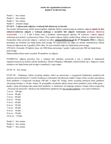 Aneks do regulaminu konkursu DZIEŃ TURYSTYKI Punkt 1 – bez zmian. Punkt 2 – bez zmian. Punkt 3 – bez zmian. Punkt 4 – zmianie ulega: ETAP I – Lajkowanie zdjęcia z wakacji lub klasowej wycieczki. Na stronie internetowej szkoły poszczególne oddziały (klasy) umieszczają po jednym zdjęciu (może to być ciekawe/zabawne zdjęcie z wakacji jednego z uczniów lub zdjęcie wykonane podczas klasowej wycieczki) – z 1, 2, 3 lub 4 klasy wraz z krótkim, interesującym opisem. W wyborze i opisie zdjęcia wskazana jest pomoc wychowawcy klasy. Przy opisie zdjęcia należy podać klasę, której to zdjęcie dotyczy. Gospodarz klasy przesyła zdjęcie z opisem na adres [email protected] do 27 listopada 2016 r. Zdjęcia przesłane po terminie nie będą brane pod uwagę. Po pojawieniu się zdjęć na stronie internetowej szkoły można je lajkować do 2 grudnia 2016 roku. Po tym terminie lajki nie będą brane pod uwagę. UWAGA: Za każde 10 lajków (max. do 500) klasa otrzymuje 1 punkt. Lajki powyżej 500 nie będą brane pod uwagę. Maksymalnie klasa może uzyskać 50 punktów za zdjęcie. PAMIĘTAJ: zdjęcia powinny być z wakacji lub szkolnej wycieczki a nie z udziału w imprezach organizowanych na terenie szkoły (konkursy, Dzień Chłopaka, Mikołajki, Dzień Kobiet itp.). Zdjęcia o innej tematyce nie będą brane pod uwagę w punktacji z tego etapu. ETAP II – bez zmian. ETAP III – Punktacja. Klasa uzyskuje punkty, które są sumowane z wygranych banknotów punktowych podczas przewidzianych 5 rzutów kostką po wykonaniu określonych zadań. Grupa, która uzyska największą ilość punktów z rozgrywki uzyskuje 100 pkt. z etapu III. Grupy, które uzyskają mniejszą ilość punktów otrzymują kolejno o 10 pkt. mniej. W przypadku uzyskania takiej samej ilości punktów przez kilka grup – każda z grup otrzymuje taką samą ilość punktów w zależności od zajętego miejsca. Grupa, która rozgrywkę „Turystyczne potyczki” ukończy bez banknotów punktowych nie uzyska punktów z tej części konkursu. 1 m-ce – 100 pkt. 2 m-ce – 90 pkt. 3 m-ce – 80 pkt. 4 m-ce – 70 pkt. 5 m-ce – 60 pkt. 6 m-ce – 50 pkt. 7 m-ce – 40 pkt. 8 m-ce – 30 pkt. 9 m-ce – 20 pkt. 10 m-ce – 10 pkt. Punkt 5 – bez zmian. Punkt 6 – bez zmian. Punkt 7 – bez zmian.