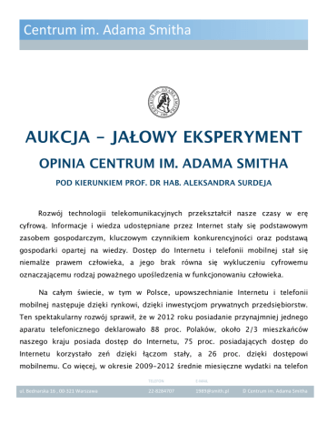 Centrum im. Adama Smitha AUKCJA - JAŁOWY EKSPERYMENT OPINIA CENTRUM IM. ADAMA SMITHA POD KIERUNKIEM PROF. DR HAB. ALEKSANDRA SURDEJA Rozwój technologii telekomunikacyjnych przekształcił nasze czasy w erę cyfrową. Informacje i wiedza udostępniane przez Internet stały się podstawowym zasobem gospodarczym, kluczowym czynnikiem konkurencyjności oraz podstawą gospodarki opartej na wiedzy. Dostęp do Internetu i telefonii mobilnej stał się niemalże prawem człowieka, a jego brak równa się wykluczeniu cyfrowemu oznaczającemu rodzaj poważnego upośledzenia w funkcjonowaniu człowieka. Na całym świecie, w tym w Polsce, upowszechnianie Internetu i telefonii mobilnej następuje dzięki rynkowi, dzięki inwestycjom prywatnych przedsiębiorstw. Ten spektakularny rozwój sprawił, że w 2012 roku posiadanie przynajmniej jednego aparatu telefonicznego deklarowało 88 proc. Polaków, około 2/3 mieszkańców naszego kraju posiada dostęp do Internetu, 75 proc. posiadających dostęp do Internetu korzystało zeń dzięki łączom stały, a 26 proc. dzięki dostępowi mobilnemu. Co więcej, w okresie 2009-2012 średnie miesięczne wydatki na telefon TELEFON E-‐MAIL ul. Bednarska 16 , 00-‐321 Warszawa 22-‐8284707 [email protected] © Centrum im. Adama Smitha 2 komórkowy w zakresie usług post-paid (telefon abonamentowy) spadły o 15 procent. W obszarze telefonii mobilnej Polacy otrzymują coraz lepsze usługi za relatywnie niższe ceny. Ten spadek cen był silnie związany z pojawieniem się na polskim rynku usług telekomunikacyjnych nowych operatorów i sprzyjającą temu polityką regulatora rynku. Cud równoczesnej poprawy dostępności i jakości (różnorodności) oraz spadku cen usług zawdzięczamy więc konkurencji rynkowej. Chociaż konkurencja jest naturalnym procesem w gospodarce rynkowej, to w obszarze Internetu niezwykle ważne jest publiczne zarządzania prawem do nazw domen, a w obszarze telefonii mobilnej rozdział spektrum elektromagnetycznego pomiędzy różne zastosowania, a w ramach zastosowań dotyczących telefonii mobilnej (transmisja danych i głosu) rozdział pomiędzy różnych operatorów. W przypadku telefonii mobilnej odpowiedzialność ta spoczywa na Urzędzie Komunikacji Elektronicznej, który rozdziela dobro rzadkie, jakim są częstotliwości, pomiędzy operatorów. Współcześnie rozdział kontrolowanych przez władze publiczne rzadkich zasobów gospodarczych takich jak częstotliwości następuje nie przez decyzje administracyjno-polityczne („uznaniowość władzy”), lecz z wykorzystaniem mechanizmów rynkowych. Oznacza to, że zasoby przydzielane są tym, którzy za nie zapłacą w konkursie ofert i będą z nich korzystać świadcząc odpłatne usługi w warunkach konkurencji rynkowej i pod nadzorem publicznej agencji regulacyjnej. Taki sposób rozdziału dóbr rzadkich zwiększa prawdopodobieństwo przekazania dóbr w ręce potencjalnie efektywnych operatorów, którzy świadczyć będą usługi telekomunikacyjne w warunkach presji konkurencyjnej. Sprzedaż kontrolowanych przez państwo rzadkich zasobów jest także źródłem dochodów budżetowych. TELEFON E-‐MAIL ul. Bednarska 16 , 00-‐321 Warszawa 22-‐8284707 [email protected] © Centrum im. Adama Smitha 3 W polskim prawie telekomunikacyjnym wskazane zostały dwa rynkowe sposoby rozdziału częstotliwości: przetarg i aukcja. Dotychczas w Polsce rozdział częstotliwości następował z wykorzystaniem przetargu. Dla przygotowywanego rozdziału częstotliwości radiowych w paśmie 800 MHZ i w paśmie 2,6 GHZ zaproponowana została po raz pierwszy w Polsce forma aukcji. W ślad za oryginalną propozycją Ronalda Coase’a (artykuł "The Federal Communications Commission" w Journal of Law and Economics) wielu ekonomistów proponowało wprowadzenie mechanizmu aukcyjnego, jako mechanizmu odkrywania ceny i rozdziału tych dóbr, których wykorzystanie wymaga decyzji władz publicznych i przebiega pod ich nadzorem. Aukcje w formie klasycznej, czy też proponowanej dla rozdziału częstotliwości 800 MHZ i 2,6 GH aukcji równoczesnej, rosnącej i wielorundowej (SMRA - Simultaneous Multiple Round Ascending) posiadają teoretyczne zalety, w tym przede wszystkim bodźce do obiektywizacji wyceny wartości przyszłych zastosowań rzadkiego dobra. Jednakże wysublimowane teoretyczne rozumowanie w praktyce nie przekłada się na efektywne zastosowanie aukcji, gdyż, jak o tym przypomina wiodący badacz empirycznego przebiegu aukcji Paul Klemperer (artykuł: „What Really Matters in Auction Design” w Journal of Economic Perspectives z 2002 roku) aukcje podatne są na zmowy cenowe oraz drapieżne zachowania ze strony zasiedziałych operatorów mające zniechęcić konkurentów. Klemperer zauważa także, że wynik aukcji często bywa wynikiem agresywnej orientacji na zysk, a nie na dobrobyt społeczny i korzyści konsumenta. Poziom dobrobytu społecznego zależy bowiem od konkurencji rynkowej i struktury rynku, a sama aukcja może prowadzić do wzrostu monopolizacji rynku, jak stało się to w aukcyjnej sprzedaży licencji telekomunikacyjnych w Turcji w 2000 roku. Oczywistym jest więc wniosek, że TELEFON E-‐MAIL ul. Bednarska 16 , 00-‐321 Warszawa 22-‐8284707 [email protected] © Centrum im. Adama Smitha 4 warunki aukcji powinny być zaprojektowane tak, aby zwiększać lub co najmniej chronić konkurencję rynkową. Źle zaprojektowana aukcja oferuje złudną prostotę jednoznacznego rozstrzygnięcia (decyzji na podstawie jednego kryterium: „wygrywa oferujący najwięcej”) niekiedy kosztem ekonomicznej nieefektywności i społecznej suboptymalności. Wskazaliśmy już, że działający na rzecz dobrobytu społecznego organ regulacyjny powinien przede wszystkim tworzyć warunki dla wzrostu konkurencji (nawet jeśli w Polsce w nazwie urzędu ochrona konkurencji jest markową specjalnością UOKiK, to w obszarze rynku telekomunikacyjnego w praktyce niezwykle ważny jest sposób dzi