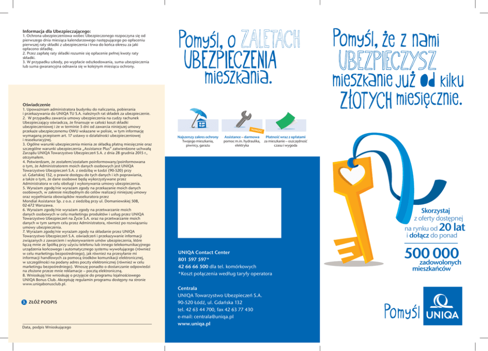 Informacja dla Ubezpieczającego: 1. Ochrona ubezpieczeniowa wobec Ubezpieczonego rozpoczyna się od pierwszego dnia miesiąca kalendarzowego następującego po opłaceniu pierwszej raty składki z ubezpieczenia i trwa do końca okresu za jaki opłacono składkę. 2. Przez zapłatę raty składki rozumie się opłacenie pełnej kwoty raty składki. 3. W przypadku szkody, po wypłacie odszkodowania, suma ubezpieczenia lub suma gwarancyjna odnawia się w kolejnym miesiącu ochrony. Pomyśl, o ZALETACH UBEZPIECZENIA mieszkania. Oświadczenie 1. Upoważniam administratora budynku do naliczania, pobierania i przekazywania do UNIQA TU S.A. należnych rat składek za ubezpieczenie. 2. W przypadku zawarcia umowy ubezpieczenia na cudzy rachunek Ubezpieczający oświadcza, że finansuje w całości koszt składki ubezpieczeniowej i że w terminie 5 dni od zawarcia niniejszej umowy przekaże ubezpieczonemu OWU wskazane w polisie, w tym informację wymaganą przepisem art. 17 ustawy o działalności ubezpieczeniowej i reasekuracyjnej. 3. Ogólne warunki ubezpieczenia mienia ze składką płatną miesięcznie oraz szczególne warunki ubezpieczenia „Assistance Plus” zatwierdzone uchwałą Zarządu UNIQA Towarzystwo Ubezpieczeń S.A. z dnia 28 grudnia 2015 r., otrzymałem. 4. Potwierdzam, że zostałem/zostałam poinformowany/poinformowana o tym, że Administratorem moich danych osobowych jest UNIQA Towarzystwo Ubezpieczeń S.A. z siedzibą w Łodzi (90-520) przy ul. Gdańskiej 132, o prawie dostępu do tych danych i ich poprawiania, a także o tym, że dane osobowe będą wykorzystywane przez Administratora w celu obsługi i wykonywania umowy ubezpieczenia. 5. Wyrażam zgodę/nie wyrażam zgody na przekazanie moich danych osobowych, w zakresie niezbędnym do celów realizacji niniejszej umowy oraz wypełniania obowiązków reasekuratora przez Mondial Assistance Sp. z o.o. z siedzibą przy ul. Domaniewskiej 50B, 02-672 Warszawa. 6. Wyrażam zgodę/nie wyrażam zgody na przetwarzanie moich danych osobowych w celu marketingu produktów i usług przez UNIQA Towarzystwo Ubezpieczeń na Życie S.A. oraz na przetwarzanie moich danych w tym samym celu przez Administratora, również po rozwiązaniu umowy ubezpieczenia. 7. Wyrażam zgodę/nie wyrażam zgody na składanie przez UNIQA Towarzystwo Ubezpieczeń S.A. oświadczeń i przekazywanie informacji związanych z zawarciem i wykonywaniem umów ubezpieczenia, które łączą mnie ze Spółką przy użyciu telefonu lub innego telekomunikacyjnego urządzenia końcowego i automatycznego systemu wywołującego (również w celu marketingu bezpośredniego), jak również na przesyłanie mi informacji handlowych za pomocą środków komunikacji elektronicznej, w szczególności na podany adres poczty elektronicznej (również w celu marketingu bezpośredniego). Wnoszę ponadto o dostarczanie odpowiedzi na złożone przeze mnie reklamacje – pocztą elektroniczną. 8. Wnioskuję/nie wnioskuję o przyjęcie do programu lojalnościowego UNIQA Bonus Club. Akceptuję regulamin programu dostępny na stronie www.uniqabonusclub.pl. 3. ZŁÓŻ PODPIS Data, podpis Wnioskującego NOWO Najszerszy zakres ochrony Twojego mieszkania, piwnicy, garażu ŚĆ Assistance – darmowa pomoc m.in. hydraulika, elektryka Płatność wraz z opłatami za mieszkanie – oszczędność czasu i wygoda Skorzystaj z oferty dostępnej na rynku od i dołącz do ponad 20 lat UNIQA Contact Center 801 597 597* 42 66 66 500 dla tel. komórkowych *Koszt połączenia według taryfy operatora Centrala UNIQA Towarzystwo Ubezpieczeń S.A. 90-520 Łódź, ul. Gdańska 132 tel. 42 63 44 700, fax 42 63 77 430 e-mail: [email protected] www.uniqa.pl 500 000 zadowolonych mieszkańców Co zostaje ubezpieczone? Przed czym chroni nasze ubezpieczenie? Bezpieczny Elementy stałe – elementy wyposażenia mieszkania zamontowane lub wbudowane na stałe m.in.: meble, drzwi, okna, urządzenia sanitarne, powłoki malarskie, podłogi, wykładziny ścian i sufitów Ruchomości domowe – mienie znajdujące się w ubezpieczanym mieszkaniu, m.in.: rzeczy osobiste, meble, sprzęt RTV i AGD, biżuteria, gotówka, dokumenty, sprzęt sportowy, zwierzęta domowe WNIOSEK O UBEZPIECZENIE MIESZKANIA ZE SKŁADKĄ PŁATNĄ MIESIĘCZNIE 1. UZUPEŁNIJ DANE Zdarzenia losowe, m.in.: pożar, powódź, wybuch, uderzenie pioruna, katastrofa budowlana Zalanie, m.in. na skutek: awarii sprzętu AGD oraz instalacji i urządzeń znajdujących się w budynku, cofnięcia się wody lub ścieków, opadów atmosferycznych, przez osoby trzecie Administrator budynku (nazwa, siedziba) Imię i nazwisko Ubezpieczającego /Ubezpieczonego PESEL /data ur. (obcokrajowiec) Ja, niżej podpisany składam wniosek o ubezpieczenie mieszkania zlokalizowanego: Ulica Pokrycie kosztów wymiany: zamków po rabunku kluczy, zabezpieczeń i dokumentów po kradzieży z włamaniem Nr domu Nr lokalu Kod pocztowy Miejscowość Telefon komórkowy Kradzież z włamaniem, rabunek w mieszkaniu i poza nim, np. na ulicy Odpowiedzialność cywilna w życiu prywatnym, tj. odpowiedzialność za szkody wyrządzone przez Ciebie i Twoich bliskich osobom trzecim podczas wykonywania czynności życia codziennego. Górna granica odpowiedzialności UNIQA TU S.A. z tytułu ubezpieczenia OC nawet do 500 000 zł Przepięcia – gwałtowna zmiana parametrów prądu w sieci (np. uderzenie pioruna w linię energetyczną spowoduje wzrost napięcia w sieci elektrycznej, uszkadzając instalację elektryczną oraz Twój komputer, telewizor, telefon, lodówkę itd.) Stłuczenie, pęknięcie, rozbicie szyb oraz szklanych części elementów wyposażenia mieszkania (np. oszklenie mebli, kabina prysznicowa, ceramiczna kuchenna płyta grzewcza, lustra, szyby okienne i drzwiowe) Wandalizm, w tym graffiti umieszczone na oknach i drzwiach wejściowych NOWOŚĆ Usługi Assistance*, czyli pomoc w przypadku wystąpienia nieoczekiwanych zdarzeń, m.in.: wezwanie i opłacenie specjalisty (np. hydraulika, ślusarz