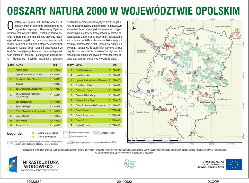 OBSZARY NATURA 2000 W WOJEWÓDZTWIE OPOLSKIM polską sieć Natura 2000 tworzą obecnie 22 obszary, których położenie przedstawiono na załączniku mapowym. Regionalny Dyrektor Ochrony Środowiska w Opolu, w ramach sprawowanego nadzoru nad tą formą ochrony przyrody i realizując założenia projektu pn. „Ochrona najcenniejszych muraw, tor fowisk i zimowisk nietoperzy w opolskich obszarach Natura 2000” współfinansowanego ze środków Europejskiego Funduszu Rozwoju Regionalnego w ramach Programu Operacyjnego Infrastruktura i Środowisko, przybliża zagadnienia związane z zasadami ochrony najcenniejszych siedlisk i gatunków zlokalizowanych w ich granicach. Podstawowym elementem tego zadania jest informowanie o objęciu konkretnych terenów ochroną prawną w formie obszaru Natura 2000, czemu służy m.in. oznakowanie ich tablicami. W 2014 r. działaniami takimi objętych zostanie osiemnaście z nich. Docelowo planuje się wykonać i posadowić 89 tablic informacyjnych, licząc przy tym na zrozumienie mieszkańców regionu i ich szacunek dla starań podjętych na rzecz realizacji zadania oraz wysiłek włożony w wykonanie tablic. NUMER NAZWA NUMER NAZWA O KOD KOD 1 Kamień Śląski PLH160003 13 Góra Swiętej Anny PLH160002 2 Opolska Dolina Nysy Kłodzkiej PLH160014 14 Lasy Barucickie PLH160009 3 Przyłęk nad Białą Głuchołaską PLH160016 15 Łąki w okolicach Karłowic nad Stobrawą PLH160012 4 Teklusia PLH160017 16 Bory Niemodlińskie PLH160005 5 Łąki w okolicach Chrząstowic PLH160010 17 Dolina Małej Panwi PLH160008 6 Łąki w okolicach Kluczborka nad Stobrawą PLH160013 18 Załęczański Łuk Warty PLH100007 7 Łęg Zdzieszowicki PLH160011 19 Grądy w Dolinie Odry PLH020017 20 Dolina Budkowiczanki (Szumirad) PLH160020 8 Żywocickie Łęgi PLH160019 9 Ostoja Sławniowicko-Burgrabicka PLH160004 21 Zbiornik Turawa PLB160004 Zbiornik Otmuchowski PLB160003 10 Góry Opawskie PLH160007 22 11 Forty Nyskie PLH160001 23 Zbiornik Nyski PLB160002 12 Rozumicki Las PLH160018 24 Grądy Odrzańskie PLB020002 Opracowano w ramach projektu „Ochrona najcenniejszych muraw, torfowisk i zimowisk nietoperzy w opolskich obszarach Natura 2000” współfinansowanego ze środków Europejskiego Funduszu Rozwoju Regionalnego w ramach Programu Operacyjnego Infrastruktura i Środowisko 32923660 20140922 DLOOP