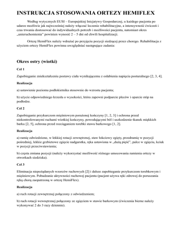 INSTRUKCJA STOSOWANIA ORTEZY HEMIFLEX Według wytycznych EUSI – Europejskiej Inicjatywy Gospodarczej, u każdego pacjenta po udarze możliwie jak najwcześniej należy włączać leczenie rehabilitacyjne, a intensywność ćwiczeń i czas trwania dostosować do indywidualnych potrzeb i możliwości pacjenta, natomiast okres „unieruchomienia” powinien wynosić 2 – 5 dni od chwili hospitalizacji. Ortezę HemiFlex należy wdrażać po przyjęciu pozycji siedzącej przez chorego. Rehabilitacja z użyciem ortezy HemiFlex powinna uwzględniać następujące zadania: Okres ostry (wiotki) Cel 1 Zapobieganie zniekształceniu postawy ciała wynikającemu z osłabienia napięcia posturalnego [2, 3, 4]. Realizacja a) ustawienie poziomu podłokietnika stosownie do wzrostu pacjenta; b) użycie odpowiedniego krzesła o wysokości, która zapewni podparcie pleców i oparcie stóp na podłodze. Cel 2 Zapobieganie przykurczom mięśniowym porażonej kończyny [1, 2, 3] i ochrona przed niekontrolowanymi ruchami wiotkiej kończyny, powodującymi ból i uszkodzenie tkanek miękkich barku [2, 5], ochrona przed rozciąganiem torebki stawu barkowego [1, 2]. Realizacja a) ramię odwiedzione, w lekkiej rotacji zewnętrznej, staw łokciowy zgięty, przedramię w pozycji pośredniej, lekkie grzbietowe zgięcie nadgarstka, ręka ustawiona w „dużą pięść”, palce w zgięciu, kciuk w pozycji przeciwstawienia; b) częsta zmiana pozycji (należy wykorzystać możliwość różnego umocowania ramienia ortezy w otworkach siedziska). Cel 3 Eliminacja niepożądanych wzorców ruchowych [2] i dalsze zapobieganie przykurczom torebkowym i mięśniowym. Pobudzanie aktywności ruchowej pacjenta (pacjent używa ręki zdrowej do poruszania ręką chorą zaopatrzoną w ortezę HemiFlex). Realizacja a) ruch rotacji zewnętrznej połączony z odwiedzeniem; b) ruch rotacji wewnętrznej połączony ze zgięciem w stawie barkowym (ćwiczenia bierne należy wykonywać 2 do 3 razy dziennie). Okres regeneracyjno – kompensacyjny (spastyczny) Cel 1 Zwalczanie spastyczności i zapobieganie zanikom mięśni [1, 2, 3]. Realizacja a) wykonywanie ruchów czynnych chorą ręką, dążenie do odtworzenia pełnego zakresu ruchu b) kontrolowany, bezpieczny ruch w stabilnym położeniu przedramienia na podłokietniku (30 powtórzeń co 3 – 4 godziny). Okres przewlekły (ok. 1 roku po incydencie) Cel 1 Doskonalenie czynności ruchowych, uzyskanie optymalnego rozkładu napięć mięśniowych [1, 2, 3, 4]. Realizacja a) Wykorzystanie pełnego zakresu ruchu aparatu HemiFlex przez częstą zmianę miejsc mocowania trzpienia kortezy. Cel 2 Zwiększenie siły mięśni [4]. Realizacja a) Należy wykorzystać możliwość płynnej regulacji oporu ruchomych elementów ortezy HemiFlex (szyna i dwa łożyska), w celu zwiększenia wysiłku podczas wykonywania wcześniej wyuczonych ruchów. Pacjent wypisywany z oddziału, wyposażony w ortezę HemiFlex, ma zapewnioną ciągłość rehabilitacji i możliwość zapobiegania niekorzystnym objawom patologicznym. Opracowano na podstawie badań przydatności aparatu HemiFlex w rehabilitacji pacjentów z udarem mózgu i leczenia pooperacyjnego uszkodzeń kończyny górnej i barku. Obserwacje były prowadzone w następujących ośrodkach medycznych: [1] „Repty” Górnośląskie Centrum Rehabilitacji w Tarnowskich Górach; [2] Katedra i Klinika Neurologii Wieku Podeszłego ŚAM w Katowicach; [3] Szpital Geriatryczny im. Jana Pawła II w Katowicach; [4] Dział Rehabilitacji Krakowskiego Szpitala Specjalistycznego im. Jana Pawła II; [5] Katedra i Klinika Ortopedii i Traumatologii Narządu Ruchu ŚAM w Katowicach.