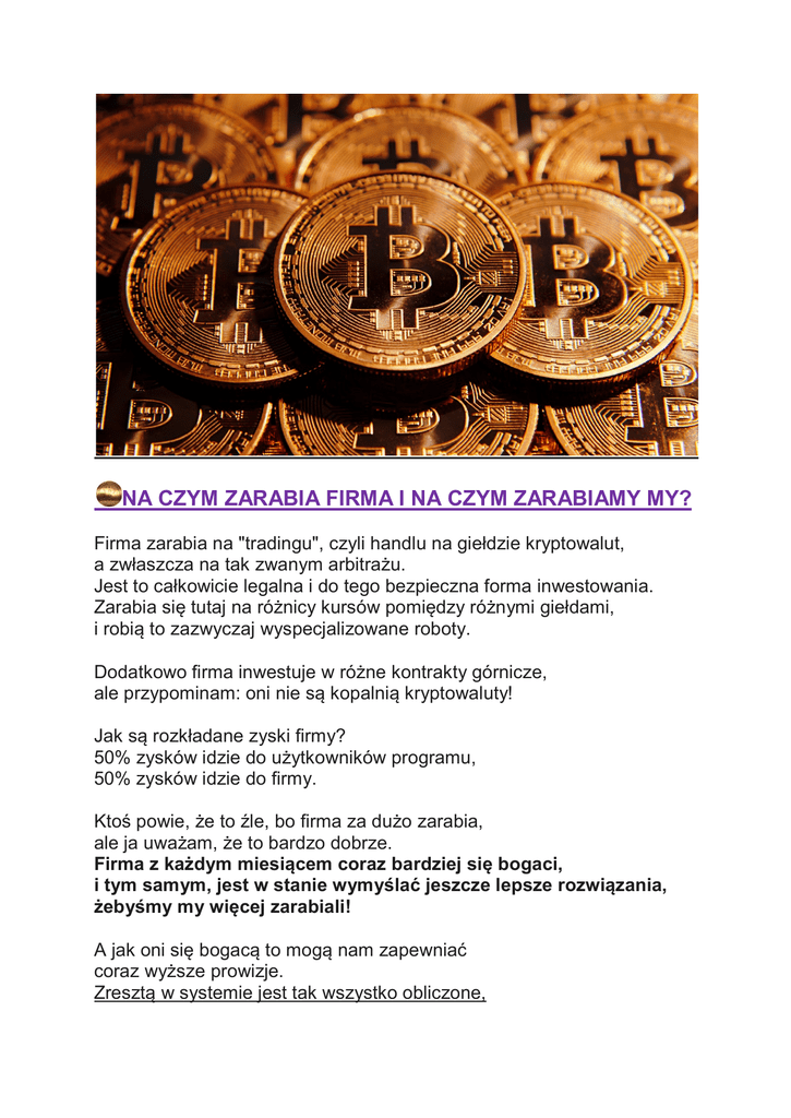 NA CZYM ZARABIA FIRMA I NA CZYM ZARABIAMY MY? Firma zarabia na "tradingu", czyli handlu na giełdzie kryptowalut, a zwłaszcza na tak zwanym arbitrażu. Jest to całkowicie legalna i do tego bezpieczna forma inwestowania. Zarabia się tutaj na różnicy kursów pomiędzy różnymi giełdami, i robią to zazwyczaj wyspecjalizowane roboty. Dodatkowo firma inwestuje w różne kontrakty górnicze, ale przypominam: oni nie są kopalnią kryptowaluty! Jak są rozkładane zyski firmy? 50% zysków idzie do użytkowników programu, 50% zysków idzie do firmy. Ktoś powie, że to źle, bo firma za dużo zarabia, ale ja uważam, że to bardzo dobrze. Firma z każdym miesiącem coraz bardziej się bogaci, i tym samym, jest w stanie wymyślać jeszcze lepsze rozwiązania, żebyśmy my więcej zarabiali! A jak oni się bogacą to mogą nam zapewniać coraz wyższe prowizje. Zresztą w systemie jest tak wszystko obliczone, żeby starczało na wszystko, a do tego firma jest cały czas na bardzo dużym plusie, co zapewnia jej stabilność i długofalowość działania. OK, może nie ma tutaj kokosów z dochodu pasywnego, (typu kilka procent dziennie), ale ja uważam, że to bardzo… dobrze! Przynajmniej nie muszę się martwić o działanie tego programu. Uważam że jest to szansa na STABILNY I DŁUGOTERMINOWY DOCHÓD, a jeśli przemyślisz dobrze strategię inwestycyjną, to wyjdziesz na tym naprawdę bardzo korzystnie! Oczywiście pamiętajmy, każdy biznes to ryzyko, ale ja uważam, że to jest program pewny na co najmniej 5 lat do przodu. (Niektórzy mówią, że nawet do 15 lat, ale ja wole mówić minimum). Tym samym wiem, że mogę działać w tym biznesie i spać spokojnie. DOCHÓD PASYWNY- JAK WYGLĄDA? Pakiet 250$ generuje naliczenia około 1-2$ dziennie Praca pakietu 150 dni. Pakiet robi 2 cykle zarobkowe Pakiet 500$ generuje naliczenia około 3-4$ dziennie Praca pakietu 225 dni. Pakiet robi 3 cykle zarobkowe Pakiet 1000$ generuje naliczenia około 7-8$ dziennie Praca pakietu 300 dni. Pakiet robi 4 cykle zarobkowe Co to są cykle zarobkowe? Cykle trwają 75 dni, po każdych 75 dniach naliczeń system pyta, czy odnawiamy pakiet. Odnowienie wiąże się z tym, że reinwestujemy 35% z dotychczasowych zarobków z naliczeń na odnowienie pakietu. WAŻNE: Można wypłacać 100% z naliczeń, tylko trzeba się liczyć potem z tym odnowieniem pakietu. Więc warto zostawić sobie to 35% na to odnowienie. Jest to zresztą bardzo korzystne, bo zwiększa to nam kapitał do pracy na przyszłe dochody pasywne. Wypłaty na Bitcoin są realizowane od poniedziałku do piątku. PROGRAM PARTNERSKI Polecanie nie jest obowiązkowe, ale korzystne jest założenie pod samym sobą większej ilości kont, aby maksymalizować swoje zyski. BONUSY Z PROGRAMU PARTNERSKIEGO: 1) 20% za samą rejestracje poleconego (także za rejestracje swojego drugiego konta) 2) 10% za obrót z matrycy dwójkowej (naliczane, jeśli na każdej nodze w "binarce" jest równa ilość punktów), 3) 10$ za każdą wprowadzoną osobę + 10$ za każdą osobę, którą Twoje osoby wprowadzą (nieważne na którą nogę struktury) Uwaga: z programu partnerskiego 20% idzie do reinwestycji na przyszłe pakiety. 80% idzie prosto do wypłaty! Wypłaty na Bitcoin są realizowane od poniedziałku do piątku. KORZYŚCI Z REJESTRACJI W NASZEJ GRUPIE Twój link będzie DODATKOWO PRZEZE MNIE PROMOWANY! WAŻNE: Ty nie musisz polecać, jeśli nie chcesz! Ale chyba nie będziesz mieć nic przeciwko, jeśli ja trochę Twój link popromuje, prawda? ;) Dodam również, że każda chętna osoba otrzyma ode mnie również gratis Automatyczny System Do Polecania, działający oczywiście z Twoim reflinkiem! LINK DO REJESTRACJI – KLIKNIJ TUTAJ INSTRUKCJA AKTYWACJI (OPŁATY PAKIETU)