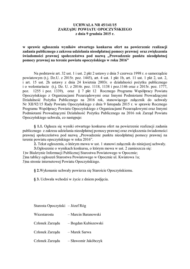 UCHWAŁA NR 45/141/15 ZARZĄDU POWIATU OPOCZYŃSKIEGO z dnia 9 grudnia 2015 r. w sprawie ogłoszenia wyników otwartego konkursu ofert na powierzenie realizacji zadania publicznego z zakresu udzielania nieodpłatnej pomocy prawnej oraz zwiększenia świadomości prawnej społeczeństwa pod nazwą „Prowadzenie punktu nieodpłatnej pomocy prawnej na terenie powiatu opoczyńskiego w roku 2016” Na podstawie art. 32 ust. 1 i ust. 2 pkt 2 ustawy z dnia 5 czerwca 1998 r. o samorządzie powiatowym (t.j. Dz.U. z 2015r. poz. 1445), art. 4 ust. 1 pkt 1b, art. 11 ust. 1 pkt 2, ust. 2, i art. 15 ust. 2h ustawy z dnia 24 kwietnia 2003r. o działalności pożytku publicznego i o wolontariacie (t.j. Dz. U. z 2014r. poz. 1118, 1138 i poz.1146 oraz z 2015r. poz. 1777, poz. 1255 i poz. 1339), oraz § 7 pkt 12 Rocznego Programu Współpracy Powiatu Opoczyńskiego z Organizacjami Pozarządowymi oraz Innymi Podmiotami Prowadzącymi Działalność Pożytku Publicznego na 2016 rok, stanowiącego załącznik do uchwały Nr XII/92/15 Rady Powiatu Opoczyńskiego z dnia 9 listopada 2015 r. w sprawie Rocznego Programu Współpracy Powiatu Opoczyńskiego z Organizacjami Pozarządowymi oraz Innymi Podmiotami Prowadzącymi Działalność Pożytku Publicznego na 2016 rok Zarząd Powiatu Opoczyńskiego uchwala, co następuje: § 1.1. Ogłasza się wyniki otwartego konkursu ofert na powierzenie realizacji zadania publicznego z zakresu udzielania nieodpłatnej pomocy prawnej oraz zwiększenia świadomości prawnej społeczeństwa pod nazwą „Prowadzenie punktu nieodpłatnej pomocy prawnej na terenie powiatu opoczyńskiego w roku 2016”. 2. Tekst ogłoszenia, o którym mowa w ust. 1 stanowi załącznik do niniejszej uchwały. 3.Ogłoszenie o wynikach konkursu, o którym mowa w ust. 2 zamieszcza się: 1)w Biuletynie Informacji Publicznej Starostwa Powiatowego w Opocznie; 2)na tablicy ogłoszeń Starostwa Powiatowego w Opocznie ul. Kwiatowa 1a; 3)na stronie internetowej Powiatu Opoczyńskiego. § 2.Wykonanie uchwały powierza się Staroście Opoczyńskiemu. § 3. Uchwała wchodzi w życie z dniem podjęcia. Starosta Opoczyński – Józef Róg Wicestarosta – Marcin Baranowski Członek Zarządu – Bogdan Kubiszewski Członek Zarządu – Marek Sarwa Członek Zarządu – Sławomir Jakóbczyk załącznik do uchwały Nr 45/141/15 Zarządu Powiatu Opoczyńskiego z dnia 9 grudnia 2015r. Ogłoszenie wyników otwartego konkursu ofert na powierzenie realizacji zadania publicznego z zakresu udzielania nieodpłatnej pomocy prawnej oraz zwiększenia świadomości prawnej społeczeństwa pod nazwą „Prowadzenie punktu nieodpłatnej pomocy prawnej na terenie powiatu opoczyńskiego w roku 2016” Ogłasza się wyniki otwartego konkursu ofert na powierzenie realizacji zadania publicznego z zakresu udzielania nieodpłatnej pomocy prawnej oraz zwiększenia świadomości prawnej społeczeństwa pod nazwą „Prowadzenie punktu nieodpłatnej pomocy prawnej na terenie powiatu opoczyńskiego w roku 2016” ogłoszonego na podstawie uchwały Nr 40/119/15 Zarządu Powiatu Opoczyńskiego z dnia 9 listopada 2015r. w sprawie ogłoszenia otwartego konkursu ofert na powierzenie realizacji zadania publicznego z zakresu udzielania nieodpłatnej pomocy prawnej oraz zwiększenia świadomości prawnej społeczeństwa pod nazwą „Prowadzenie punktu nieodpłatnej pomocy prawnej na terenie powiatu opoczyńskiego w roku 2016”. 1)w konkursie zostały złożone dwie oferty przez: - Fundację HONESTE VIVERE ul. Amałowicza-Tatara 7, 04-474 Warszawa; - Fundację TOGATUS PRO BONO ul. Warmińska 7/1 10-544 Olsztyn. 2)Zarząd Powiatu Opoczyńskiego uchwałą Nr 45/140/15 z dnia 9 grudnia 2015r. postanowił powierzyć realizację zadania publicznego z zakresu udzielania nieodpłatnej pomocy prawnej oraz zwiększenia świadomości prawnej społeczeństwa pod nazwą „Prowadzenie punktu nieodpłatnej pomocy prawnej na terenie powiatu opoczyńskiego w roku 2016” Fundacji HONESTE VIVERE ul. Amałowicza-Tatara 7, 04-474 Warszawa. 3) na realizację zadania, o którym mowa w niniejszym ogłoszeniu przyznano środki publiczne w wysokości 59.946,00 zł. UZASADNIENIE do uchwały Zarządu Powiatu Opoczyńskiego w sprawie ogłoszenia wyników otwartego konkursu ofert na powierzenie realizacji zadania publicznego z zakresu udzielania nieodpłatnej pomocy prawnej oraz zwiększenia świadomości prawnej społeczeństwa pod nazwą „Prowadzenie punktu nieodpłatnej pomocy prawnej na terenie powiatu opoczyńskiego w roku 2016” Zgodnie z ogłoszeniem o otwartym konkursie ofert na powierzenie realizacji zadania publicznego z zakresu udzielania nieodpłatnej pomocy prawnej oraz zwiększenia świadomości prawnej społeczeństwa pod nazwą „Prowadzenie punktu nieodpłatnej pomocy prawnej na terenie powiatu opoczyńskiego w roku 2016” o wynikach konkursu zainteresowani oraz opinia publiczna zostaną poinformowani w drodze ogłoszenia. Ogłoszenie o wyborze ofert umieszczone zostanie: a)) na tablicy ogłoszeń w siedzibie Starostwa Powiatowego w Opocznie przy ul. Kwiatowej 1a, b)w Biuletynie Informacji Publicznej Starostwa Powiatowego, c)na stronie internetowej Powiatu Opoczyńskiego. Uczestnicy konkursu o wynikach konkursu mogą zostać również poinformowani pisemnie lub drogą elektroniczną.