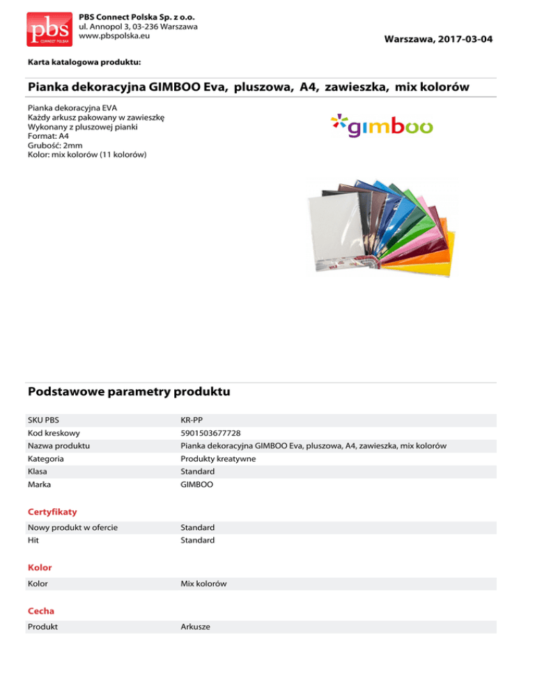 PBS Connect Polska Sp. z o.o. ul. Annopol 3, 03-236 Warszawa www.pbspolska.eu Warszawa, 2017-03-04 Karta katalogowa produktu: Pianka dekoracyjna GIMBOO Eva, pluszowa, A4, zawieszka, mix kolorów Pianka dekoracyjna EVA Każdy arkusz pakowany w zawieszkę Wykonany z pluszowej pianki Format: A4 Grubość: 2mm Kolor: mix kolorów (11 kolorów) Podstawowe parametry produktu SKU PBS KR-PP Kod kreskowy 5901503677728 Nazwa produktu Pianka dekoracyjna GIMBOO Eva, pluszowa, A4, zawieszka, mix kolorów Kategoria Produkty kreatywne Klasa Standard Marka GIMBOO Certyfikaty Nowy produkt w ofercie Standard Hit Standard Kolor Kolor Mix kolorów Cecha Produkt Arkusze PBS Connect Polska Sp. z o.o. ul. Annopol 3, 03-236 Warszawa www.pbspolska.eu Warszawa, 2017-03-04 Karta katalogowa produktu cd. Pianka dekoracyjna GIMBOO Eva, pluszowa, A4, zawieszka, mix kolorów Podstawowe parametry produktu Typ Pluszowe Rodzaj EVA Materiał Pianka W ofercie od 2015-11 Wymiary Grubość (mm) 2 Szerokość (mm) 210 Wymiary (mm) 210x297 Wysokość (mm) 297 Format A4 Wspólny słownik zamówień CPV 30197600-2 Papier i tektura gotowe Jednostki logistyczne Opakowanie 1 25 szt Opakowanie 2 200 szt Opakowanie 3 4800 szt