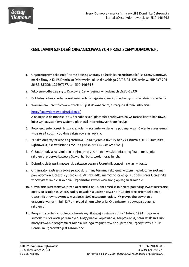 Sceny Domowe - marka firmy e-KLIPS Dominika Dąbrowska [email protected], tel. 510-146-918 REGULAMIN SZKOLEŃ ORGANIZOWANYCH PRZEZ SCENYDOMOWE.PL 1. Organizatorem szkolenia "Home Staging w pracy pośrednika nieruchomości" są Sceny Domowe, marka firmy e-KLIPS Dominika Dąbrowska, ul. Makowskiego 20/93, 31-325 Kraków, NIP 637-20186-89, REGON 121697177, tel. 510-146-918 2. Szkolenie odbędzie się w Krakowie, 19. września, w godzinach 09:30-16:00 3. Dokładny adres szkolenia zostanie podany najpóźniej na 7 dni roboczych przed dniem szkolenia 4. Warunkiem uczestnictwa w szkoleniu jest dokonanie rejestracji na stronie szkolenia: http://scenydomowe.pl/szkolenia/ A następnie dokonanie (do 3 dni roboczych) płatności przelewem na wskazane konto bankowe, lub z wykorzystaniem systemu płatności internetowych transferuj.pl 5. Potwierdzenie uczestnictwa w szkoleniu zostanie wysłane na podany w zamówieniu adres e-mail w ciągu 24 godziny od dnia zaksięgowania wpłaty. 6. Za szkolenie wystawione są rachunki lub na życzenie faktury bez VAT (firma e-KLIPS Dominika Dąbrowska jest zwolniona z VAT na podst. art 113 ustawy o VAT) 7. Opłata za udział w szkoleniu obejmuje: uczestnictwo w szkoleniu, certyfikat ukończenia szkolenia, przerwę kawową (kawa, herbata, woda), oraz lunch. 8. Dojazd, opłaty parkingowe lub zakwaterowania Uczestnik ponosi na własny koszt. 9. Organizator zastrzega sobie prawo do zmiany terminu szkolenia, o czym niezwłocznie zostaną powiadomieni Uczestnicy szkolenia. W przypadku niemożności wzięcia udziału przez Uczestnika w nowym terminie szkolenia, Organizator zwróci wniesioną opłatę za szkolenie. 10. Odwołanie uczestnictwa przez Uczestnika na 14 dni przed szkoleniem powoduje zwrot uiszczonej opłaty za szkolenie. W przypadku odwołania uczestnictwa na 7-13 dni prze dniem szkolenia, Uczestnik otrzyma zwrot w wysokości 50% uiszczonej opłaty. W przypadku odwołania uczestnictwa na mniej niż 7 dni przed dniem szkolenia, Organizator nie zwraca opłaty za szkolenie. 11. Program szkolenia podlega ochronie wynikającej z ustawy z dnia 4 lutego 1994 r. o prawie autorskim i prawach pokrewnych. Nagrywanie, kopiowanie, adaptowanie, przekształcanie lub modyfikowanie programu szkolenia lub jego fragmentów bez uprzedniej zgody firmy e-KLIPS Dominika Dąbrowska jest zabronione. e-KLIPS Dominika Dąbrowska ul. Makowskiego 20/93 31-325 Kraków NIP 637-201-86-89 REGON 121697177 nr konta 54 1140 2004 0000 3002 7529 3636 BRE Bank S.A.
