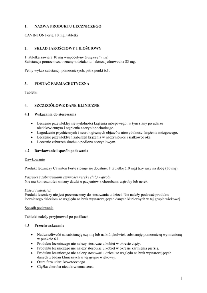 1. NAZWA PRODUKTU LECZNICZEGO CAVINTON Forte, 10 mg, tabletki 2. SKŁAD JAKOŚCIOWY I ILOŚCIOWY 1 tabletka zawiera 10 mg winpocetyny (Vinpocetinum). Substancja pomocnicza o znanym działaniu: laktoza jednowodna 83 mg. Pełny wykaz substancji pomocniczych, patrz punkt 6.1. 3. POSTAĆ FARMACEUTYCZNA Tabletki 4. SZCZEGÓŁOWE DANE KLINICZNE 4.1 Wskazania do stosowania 4.2 Leczenie przewlekłej niewydolności krążenia mózgowego, w tym stany po udarze niedokrwiennym i otępienia naczyniopochodnego. Łagodzenie psychicznych i neurologicznych objawów niewydolności krążenia mózgowego. Leczenie przewlekłych zaburzeń krążenia w naczyniówce i siatkówce oka. Leczenie zaburzeń słuchu o podłożu naczyniowym. Dawkowanie i sposób podawania Dawkowanie Produkt leczniczy Cavinton Forte stosuje się doustnie: 1 tabletkę (10 mg) trzy razy na dobę (30 mg). Pacjenci z zaburzeniami czynności nerek i (lub) wątroby Nie ma konieczności zmiany dawki u pacjentów z chorobami wątroby lub nerek. Dzieci i młodzież Produkt leczniczy nie jest przeznaczony do stosowania u dzieci. Nie należy podawać produktu leczniczego dzieciom ze względu na brak wystarczających danych klinicznych w tej grupie wiekowej. Sposób podawania Tabletki należy przyjmować po posiłkach. 4.3 Przeciwwskazania Nadwrażliwość na substancję czynną lub na którąkolwiek substancję pomocniczą wymienioną w punkcie 6.1. Produktu leczniczego nie należy stosować u kobiet w okresie ciąży. Produktu leczniczego nie należy stosować u kobiet w okresie karmienia piersią. Produktu leczniczego nie należy stosować u dzieci ze względu na brak wystarczających danych z badań klinicznych w tej grupie wiekowej. Ostra faza udaru krwotocznego. Ciężka choroba niedokrwienna serca. 1 4.4 Ciężkie zaburzenia rytmu serca. Specjalne ostrzeżenia i środki ostrożności dotyczące stosowania Zaleca się wykonywanie kontrolnych badań EKG u pacjentów z zespołem wydłużonego odcinka QT lub u osób jednocześnie przyjmujących leki, które powodują wydłużenie odcinka QT. W przypadku pacjentów z nietolerancją laktozy należy wziąć pod uwagę, że każda tabletka 10 mg produktu leczniczego Cavinton Forte zawiera 83 mg laktozy. Produkt leczniczy nie powinien być stosowany u pacjentów z rzadko występującą dziedziczną nietolerancją galaktozy, niedoborem laktazy (typu Lapp) lub zespołem złego wchłaniania glukozygalaktozy. 4.5 Interakcje z innymi produktami leczniczymi i inne rodzaje interakcji W badaniach klinicznych nie obserwowano interakcji, gdy winpocetynę podawano jednocześnie z lekami beta-adrenolitycznymi takimi jak kloranolol, pindolol i klopamid, ani z glibenklamidem, digoksyną, acenokumarolem czy hydrochlorotiazydem. W pojedynczych przypadkach winpocetyna nasila hipotensyjne działanie α-metylodopy, dlatego podczas stosowania takiej terapii skojarzonej zaleca się systematyczną kontrolę ciśnienia krwi. Należy zachować ostrożność podając winpocetynę jednocześnie z lekami działającymi na ośrodkowy układ nerwowy, a także z lekami przeciwarytmicznymi i przeciwzakrzepowymi. 4.6 Wpływ na płodność, ciążę i laktację Stosowanie winpocetyny w okresie ciąży i karmienia piersią jest przeciwwskazane. Ciąża Winpocetyna przenika przez barierę łożyska, przy czym jej stężenie w łożysku i we krwi płodu jest mniejsze niż we krwi matki. Nie obserwowano teratogennego ani embriotoksycznego działania winpocetyny podawanej kobietom w ciąży. W badaniach na zwierzętach, które otrzymywały duże dawki winpocetyny, w niektórych przypadkach zaobserwowano krwawienie z łożyska a także poronienie, prawdopodobnie na skutek zwiększonego przepływu krwi przez łożysko. Karmienie piersią Winpocetyna przenika do mleka kobiet karmiących piersią. Badania ze znakowaną winpocetyną wykazały, że radioaktywność w mleku była dziesięciokrotnie wyższa niż we krwi. W ciągu 1 godziny 0,25% podanej dawki winpocetyny przenika do mleka. Stosowanie u kobiet karmiących piersią jest przeciwwskazane, ponieważ winpocetyna przenika do mleka kobiecego i brak jest wiarygodnych danych dotyczących jej wpływu na niemowlęta karmione piersią. 4.7 Wpływ na zdolność prowadzenia pojazdów i obsługiwania maszyn Nie przeprowadzono badań wpływu winpocetyny na zdolność prowadzenia pojazdów i obsługiwania maszyn. 4.8 Działania niepożądane Wymienione poniżej działania niepożądane pogrupowano zgodnie z klasyfikacją układów i narządów oraz częstością występowania, określoną w następujący sposób: bardzo często (≥1/10), często (≥ 1/100 do <1/10), niezbyt często (≥ 1/1 000 do <1/100), rzadko (≥1/10 000 do <1/1 000), bardzo rzadko (≥1/10 000, w tym pojedyncze przypadki). Zaburzenia krwi i układu chłonnego Rzadko (0,07 %): leukopenia. Zaburzenia układu nerwowego 2 Niezbyt często (0,9%): zaburzenia snu (bezsenność, senność), zawroty i bóle głowy, osłabienie. Objawy te mogą być związane z chorobą podstawową. Zaburzenia serca Niezbyt często (0,1%): obniżenie odcinka ST, wydłużenie odcinka QT, częstoskurcz i dodatkowy skurcz serca. Objawy te występowały samoistnie i dlatego nie jest pewne, czy powodem wystąpienia tych objawów było zastosowanie produktu leczniczego Cavinton Forte. Zaburzenia naczyniowe Niezbyt często (0,8 %): zmiany ciśnienia krwi (głównie obniżenie ciśnienia krwi), uderzenia krwi do głowy. Zaburzenia żołądka i jelit Niezbyt często (0,6 %): nudności, zgaga i suchość w jamie ustnej. Rzadko: bóle brzucha. Zaburzenia wątroby i dróg żółciowych Niezbyt często (0,52 %): zwiększenie aktywności enzymów wątrobowych. Zaburzenia skóry i tkanki podskórnej Niezbyt często (0,2 %): alergiczne odczyny skórne. 4.9 Przedawkowanie Długotrwałe podawanie winpocetyny w dawce dobowej 60 mg jest bezpieczne. Nawet jednorazowe doustne przyjęcie dawki 360 mg winpocetyny, czyli 6-krotnie większej dawki od dawki zalecanej w pra