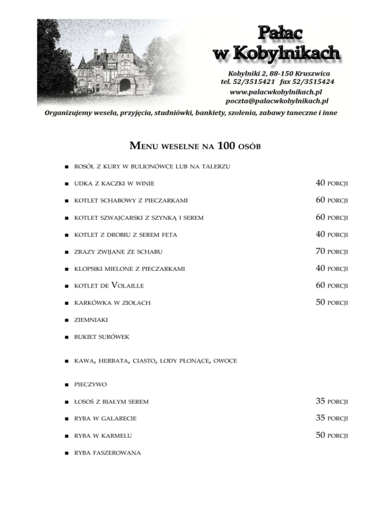 MENU WESELNE NA 100 OSÓB ROSÓŁ Z KURY W BULIONÓWCE LUB NA TALERZU UDKA Z KACZKI W WINIE 40 PORCJI KOTLET SCHABOWY Z PIECZARKAMI 60 PORCJI KOTLET SZWAJCARSKI Z SZYNKĄ I SEREM 60 PORCJI KOTLET Z DROBIU Z SEREM FETA 40 PORCJI ZRAZY ZWIJANE ZE SCHABU 70 PORCJI KLOPSIKI MIELONE Z PIECZARKAMI 40 PORCJI KOTLET DE KARKÓWKA W ZIOŁACH ZIEMNIAKI BUKIET SURÓWEK KAWA, HERBATA, CIASTO, LODY PŁONĄCE, OWOCE PIECZYWO ŁOSOŚ Z BIAŁYM SEREM 35 PORCJI RYBA W GALARECIE 35 PORCJI RYBA W KARMELU 50 PORCJI RYBA FASZEROWANA VOLAILLE 60 PORCJI 50 PORCJI RYBA WĘDZONA 50 PORCJI SCHAB FASZEROWANY W GALARECIE 40 PORCJI PIERSI Z INDYKA Z PAPRYKĄ 40 PORCJI KURCZAK W GALARECIE 40 PORCJI SZYNKA W SOSIE TATARSKIM 40 PORCJI KARKÓWKA Z CZOSNKIEM 60 PORCJI SWOJSKIE WYROBY 40 PORCJI SAŁATKA MIESZANA SAŁATKA JARZYNOWA BARSZCZ CZERWONY UDKA Z KURCZAKA FASZEROWANE 40 PORCJI GOLONKA Z KAPUSTĄ 30 PORCJI SZASZŁYKI 50 PORCJI KIEŁBASA WĘDZONA 25 PORCJI