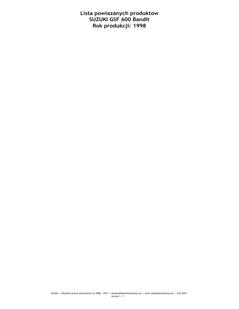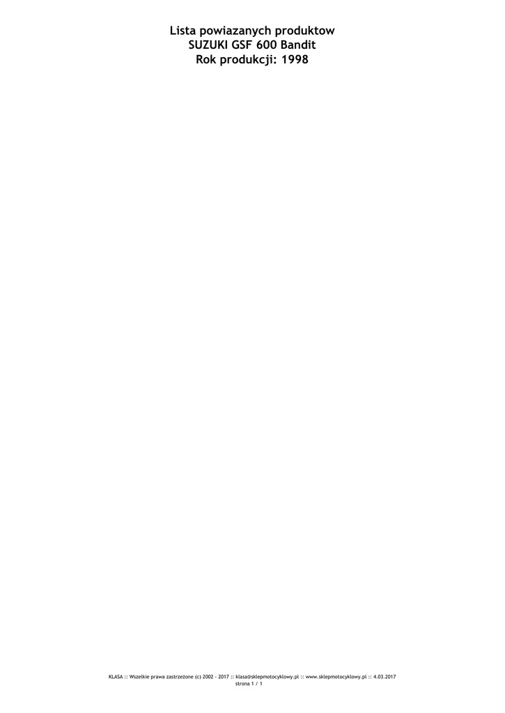 Lista powiazanych produktow SUZUKI GSF 600 Bandit Rok produkcji: 1998 KLASA :: Wszelkie prawa zastrzeżone (c) 2002 - 2017 :: [email protected] :: www.sklepmotocyklowy.pl :: 4.03.2017 strona 1 / 1