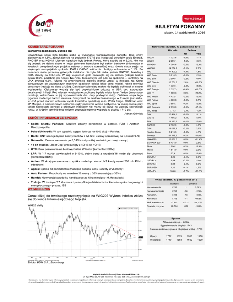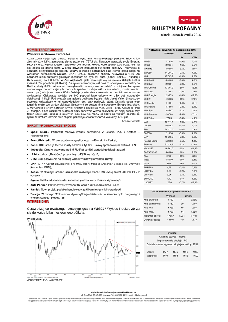 BIULETYN PORANNY piątek, 14 października 2016 KOMENTARZ PORANNY Notowania: czwartek, 13 października 2016 Wartość Warszawa zapikowała, Europa też Czwartkowa sesja była bardzo słaba w wykonaniu warszawskiego parkietu. Blue chipy zjechały aż o 1,9%, zamykając się na poziomie 1727,6 pkt. Najgorzej poradziły sobie Energa, PKO BP oraz KGHM. Liderem spadków było jednak Pekao, które spadło aż o 5,2%. Nie ma się jednak co dziwić skoro w kraju głównym hamulcem był sektor bankowy (informacja o kosztach prezydenckiego projektu ustawy o zwrocie spreadów) oraz równie słaba sesja na większych europejskich rynkach. DAX i CAC40 solidarnie obniżyły notowania o 1,1%. Za oceanem skala przeceny głównych indeksów nie była tak duża, jednak S&P500, Nasdaq i DJIA straciły po 0,3-0,4%. W Azji większość giełd zamknęła się na zielono (tokijski Nikkei zyskał 0,5%, podobnie jak Kospi). Na rynku terminowym jest póki co spokojnie – kontrakty na DAX zyskują 0,5%, futures na amerykańskie indeksy niemal „stoją” w miejscu. Na rynku surowcowym po wczorajszych mocnych spadkach odbija lekko cena miedzi, rośnie również cena ropy (reakcja na dane z USA). Dzisiejszy kalendarz makro nie będzie obfitował w istotne wydarzenia. Ciekawsze wydają się być popołudniowe odczyty w USA dot. sprzedaży detalicznej i inflacji. Pod wieczór wystąpienie publiczne będzie miała Janet Yellen (inwestorzy oczekują wskazówek w jej wypowiedziach dot. daty podwyżki stóp). Ostatnia sesja tego tygodnia może być bardzo ciekawa. Sentyment do sektora finansowego w Europie jest słaby, w USA przed startem notowań wyniki kwartalne opublikują m.in. Wells Fargo, CitiGroup oraz JP Morgan, a nad rodzimym sektorem ciąży ponownie widmo polityczne. W mojej ocenie przy takich nastrojach jednego z głównych indeksów nie mamy co liczyć na wzrosty szerokiego rynku. W krótkim terminie blue chipom pozostaje obrona wsparcia w okolicy 1710 pkt. Zmiana 1D YTD -7,1% WIG20 1 727,6 -1,9% WIG30 2 006,4 -1,6% -3,3% mWIG40 4 004,6 -0,5% 12,3% sWIG80 14 254,2 -0,1% 7,9% WIG 47 303,2 -1,3% 1,8% WIG Banki 5 910,5 -3,0% -2,9% WIG Bud 2 900,1 -0,2% -0,9% WIG Chemia 13 701,3 2,0% -16,8% WIG Dew 1 739,4 -0,8% 14,9% WIG Energia 2 357,3 -1,4% -19,5% WIG IT 1 969,3 0,3% 22,2% WIG Media 4 432,1 -0,5% 12,4% WIG Paliwa 4 739,8 -0,8% 6,1% WIG Spoż 3 858,7 0,2% 12,8% WIG Surowce 2 878,0 -2,0% 47,1% 774,3 -0,4% -4,2% DAX 10 414,1 -1,0% -3,1% CAC40 4 405,2 -1,1% -5,0% BUX 28 123,2 -1,0% 17,6% S&P500 2 132,6 -0,3% 4,3% DJIA 18 098,9 -0,2% 3,9% Pekao/Unicredit: W tym tygodniu wygasł lock-up na 40% akcji – Parkiet; Nasdaq Comp 5 213,3 -0,5% 4,1% Banki: KNF szacuje łączne koszty banków z tyt. tzw. ustawy spreadowej na 9,3 mld PLN; Bovespa 61 118,6 0,2% 41,0% Netmedia: Cena w wezwaniu po 6,5 PLN/szt poniżej wartości godziwej- zarząd; Nikkei225 16 861,0 0,5% -11,4% S&P/ASX 200 5 434,0 0,0% 2,6% Złoto 1 256,1 0,3% 18,3% GTC: Brak pozwolenia na budowę Galerii Wilanów [komentarz BDM]; Miedź 4 814,0 0,0% 2,3% LPP: W ’17 wzrost powierzchni o 9-10%, dobry trend z września’16 może się utrzymać [komentarz BDM]; Ropa 50,4 0,5% 16,4% EUR/PLN 4,29 -0,1% 0,6% Action: W skrajnym scenariuszu spółka może być winna UKS kwotę nawet 200 mln PLN z odsetkami; USD/PLN 3,89 -0,2% -1,0% CHF/PLN 3,94 -0,1% 0,3% Agora: Spółka od poniedziałku znacząco podnosi ceny „Gazety Wyborczej”; EUR/USD 1,10 0,1% 1,6% USD/JPY 103,6 -0,7% -13,8% Adrian Górniak SKRÓT INFORMACJI ZE SPÓŁEK Spółki Skarbu Państwa: Możliwe zmiany personalne w Lotosie, PZU i Azotach – Rzeczpospolita; 11 bit studios: „Beat Cop” przesunięty z 4Q’16 na 1Q’17; Auto Partner: Przychody we wrześniu’16 rosną o 36% (narastająco 35%); WIG Telco Handel: Nowy projekt podatku handlowego za kilka miesięcy- M.Morawiecki; Trakcja: W trudnym ’17 kluczowa dywersyfikacja działalności w kierunku rynku drogowego i energetycznego- prezes, ISB FW20: czwartek, 13 października 2016 Wartość zmiana WYKRES DNIA Kurs otwarcia 1 752 1 0,06% Kurs zamknięcia 1 730 -30 -1,70% Coraz bliżej do trwalszego rozstrzygnięcia na WIG20? Wykres indeksu zbliża się do końca kilkumiesięcznego trójkąta. Kurs min. 1 728 -18 -1,03% Kurs max. 1 753 -11 -0,62% Wolumen obrotu 17 957 5 231 41,10% Otwarte pozycje 48 504 -804 -1,63% WIG20 daily System: Aktualna pozycja – krótka Sygnał otwarcia długiej– 1743 Ostatnia zmiana sygnału z długiej na krótką - 1730 Opory: 1777 1875 1915 1950 Wsparcia: 1710 1683 1662 1600 Źródło: BDM S.A., Bloomberg Wydział Analiz i Informacji Dom Maklerski BDM S.A. ul. 3-go Maja 23, 40-096 Katowice, Tel.: 032 208 14 12, [email protected] Opracowanie ma charakter czysto informacyjny i zostało opracowany na podstawie informacji uznanych przez autorów za wiarygodne . Zawarte w nim komentarze są subiektywnymi poglądami autorów. Opracowanie i zawarte w nim komentarze nie są podstawą żadnej rekomendacji kupna bądź sprzedaży w rozumieniu obowiązującego prawa i nie powinny być tak interpretowane. Publikowanie w prasie lub w Internecie całości lub części opracowania wymaga zgody sporządzających raport. BIULETYN PORANNY piątek, 14 października 2016 GPW – PODSUMOWANIE Indeksy GPW 2000 FW20 (1,752.00, 1,753.00, 1,728.00, 1,730.00, -30.0000) 1950 1900 1850 Open Low High Close WIG20 1 751,9 1 726,8 1 751,9 1 727,6 -1,9% 720 WIG30 2 028,5 2 005,9 2 029,6 2 006,4 -1,6% 827 MWIG40 4 030,1 14 219,3 14 305,2 4 004,6 -0,5% 156 SWIG80 14 291,5 4 004,6 4 030,7 14 254,2 -0,2% 25 WIG-PL 48 417,2 48 030,6 48 417,2 48 030,6 -1,4% 914 WIG 47 765,2 47 303,2 47 777,9 47 303,2 -1,3% 926 WIG20 Alior 1800 1750 1700 1650 18 25 2 9 May 16 23 30 6 June 13 20 27 4 July 11 18 25 1 8 August 16 22 29 5 12 19 September 26 3 10 October 17 24 2000 WIG20 (1,751.92, 1,751.92, 1,726.80, 1,727.55, -32.8800) 1950 Cena 47,80 Mkt Cap 6 179 1750 1700 1650 18 25 2 9 May 16 23 30 6 June 13 20 27 4 July 11 18 25 1 8 August 16 22 29 5 12 19 September 26