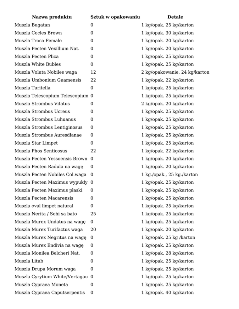 Nazwa produktu Sztuk w opakowaniu Detale Muszla Bugatan 0 1 kg/opak. 25 kg/karton Muszla Cocles Brown 0 1 kg/opak. 30 kg/karton Muszla Troca Female 0 1 kg/opak. 20 kg/karton Muszla Pecten Vexillium Nat. 0 1 kg/opak. 20 kg/karton Muszla Pecten Plica 0 1 kg/opak. 25 kg/karton Muszla White Bubles 0 1 kg/opak. 25 kg/karton Muszla Voluta Nobiles waga 12 2 kg/opakowanie, 24 kg/karton Muszla Umbonium Guamensis 22 1 kg/opak. 22 kg/karton Muszla Turitella 0 1 kg/opak. 25 kg/karton Muszla Telescopium Telescopium 0 1 kg/opak. 25 kg/karton Muszla Strombus Vitatus 0 2 kg/opak. 20 kg/karton Muszla Strombus Ucreus 0 1 kg/opak. 25 kg/karton Muszla Strombus Luhuanus 0 1 kg/opak. 25 kg/karton Muszla Strombus Lentiginosus 0 1 kg/opak. 25 kg/karton Muszla Strombus Auresdianae 0 1 kg/opak. 25 kg/karton Muszla Star Limpet 0 1 kg/opak. 25 kg/karton Muszla Phos Senticosus 22 1 kg/opak. 22 kg/karton Muszla Pecten Yessoensis Brown 0 1 kg/opak. 20 kg/karton Muszla Pecten Radula na wagę 1 kg/opak. 20 kg/karton 0 Muszla Pecten Nobiles Col.waga 0 1 kg./opak., 25 kg./karton Muszla Pecten Maximus wypukły 0 1 kg/opak. 25 kg/karton Muszla Pecten Maximus płaski 0 1 kg/opak. 25 kg/karton Muszla Pecten Macarensis 0 1 kg/opak. 25 kg/karton Muszla oval limpet natural 0 1 kg/opak. 25 kg/karton Muszla Nerita / Sehi sa bato 25 1 kg/opak. 25 kg/karton Muszla Murex Undatus na wagę 0 1 kg/opak. 25 kg/karton Muszla Murex Turifactus waga 20 1 kg/opak. 20 kg/karton Muszla Murex Negritus na wagę 0 1 kg/opak. 25 kg /karton Muszla Murex Endivia na wagę 0 1 kg/opak. 25 kg/karton Muszla Monilea Belcheri Nat. 0 1 kg/opak. 28 kg/karton Muszla Litub 0 1 kg/opak. 25 kg/karton Muszla Drupa Morum waga 0 1 kg/opak. 25 kg/karton Muszla Cyrytium White/Vertagau 0 1 kg/opak. 25 kg/karton Muszla Cypraea Moneta 0 1 kg/opak. 25 kg/karton Muszla Cypraea Caputserpentis 0 1 kg/opak. 40 kg/karton Nazwa produktu Muszla Cypraea Annulus Sztuk w opakowaniu Detale 0 1 kg/opak. 25 kg/karton Muszla Cypraea Annulus Cooked 0 1 kg/opak. 25 kg/karton Muszla Copa Flat 0 na kg, 25 kg/karton Muszla Cup Shell 0 1 kg/opak. 25 kg/karton Muszla Copa Curved 0 1 kg/opak. 25 kg/karton Muszla Conus Mix 0 1 kg/opak. 25 kg/karton Muszla Conus duży na wagę 0 1kg/opak. 40kg/karton Muszla Codacia Tigrena 0 1 kg/opak. 25 kg/karton Muszla Cocles White 25 1 kg/opak. 25 kg/karton Muszla Black Terebra 0 1 kg/opak. 25 kg/karton Muszla Badoy 0 1 kg/opak. 20 kg/karton Muszla Babilonia Areolata duża 0 1 kg/opak. 18 kg/karton Muszla Arc Shell 0 1 kg/opak. 25 kg/karton Muszla Angaria Delphinola 0 1 kg/opak. 20 kg/karton Muszla Aloco Cyrythium 0 1 kg/opak. 25 kg/karton Muszla Voluta Vespertillo 0 1 kg/opak., 25 kg/karton Muszla AS-001 Murex trapa 2-4" 0 1 kg/op. 10 kg/kart. Muszla Cymatium Pileare waga 0 1 kg/opak., 16 kg/karton Muszla Cymatium Springst. waga 0 1 kg/opak., 12 kg/karton Muszla Fusinus Nicobaric.waga 0 na kg, 18 kg/karton Muszla Haliotis ovina nat.waga 0 0,5 kg/opakowanie Muszla Harpa waga 0 0,5 kg/opak., 12 kg/karton Muszla Pecten Glorios.mix waga 0 1 kg/opak., 20 kg/karton Muszla Pecten Glorios.red waga 0 1 kg/opak., 20 kg/karton Muszla Phalium Bandat.pol.waga 0 1 kg/opak., 12 kg/karton Muszla Pyrene ocellata waga 1 kg/opakowanie 0 Muszla Strombus Aratrum waga 0 2 kg/opak., 20 kg/karton Muszla Strombus Vittatus waga 0 2 kg/opak., 22 kg/karton Muszla Sund Moon white waga 0 1 kg/opakowanie Muszla Trachycardium Elon.waga 0 2 kg/opak., 24 kg/karton Muszla Trochus Conus waga 0 2 kg/opak., 22 kg/karton Muszla Trochus Maculatus waga 0 1 kg/opak., 25 kg/karton Muszla Trochus Pyramis pol.m. 0 na sztuki, 250 szt/karton Muszla White Band cerith waga 0 1 kg/opak., 25 kg/karton Nazwa produktu Muszla White Moon sh. waga Sztuk w opakowaniu 0 Detale 2 kg/opak., 30 kg/karton