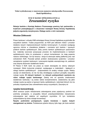 1 Tekst wydrukowany w marcowym numerze miesięcznika Nowoczesny Bank Spółdzielczy NUK W BANKU SPÓŁDZIELCZYM (1) Zrozumieć ryzyko Relacje banków z Komisją Nadzoru Finansowego powinny być partnerskie, a kryterium przesądzającym o słuszności rozwiązań Nowej Umowy Kapitałowej jedynie argumenty merytoryczne. Dlatego warto o nich rozmawiać. Wiesław Żółtkowski Prawo bankowe i uchwały KNB wdrażające Nową Umowę Kapitałową są jednolite dla wszystkich banków. Trzeba przypomnieć, że NUK jest odbiciem metod i procedur działania dużych międzynarodowych banków komercyjnych. A przecież występują ogromne różnice w charakterze działania i rozmiarze tych banków i typowych polskich banków spółdzielczych. Żeby pomóc bankom spółdzielczym opracowano tzw. materiały wzorcowe (propozycje procedur do implementowania w bankach spółdzielczych), które im przekazano z ustnym komentarzem, że mają poparcie nadzoru bankowego. Cel był słuszny i akcja ta stworzyła realną platformę prac nad wdrożeniem NUK. Pozostał jednak problem dostosowania systemów i procedur zarządzania ryzykiem bankowym i szacowania kapitału wewnętrznego do „wielkości oraz stopnia złożoności działalności banku”. W Filarze II NUK bank ma prawo (a nawet obowiązek) do obrony własnych rozwiązań. Warto krytycznie przejrzeć, występujące w materiałach - będących w obiegu banków spółdzielczych - podpowiadane do analizy rodzaje ryzyka. Należy zacząć od stwierdzenia, że nie ma listy określającej w jednym porządku wszystkie rodzaje ryzyka. W różnych bankach i w różnych podręcznikach wymienia się różne rodzaje ryzyka bankowego. Zależą one od sposobu analizowania działalności bankowej i są wobec siebie komplementarne. Zastanówmy się jakie rodzaje ryzyka są ważne w typowym banku spółdzielczym, natomiast których nie ma potrzeby rozpatrywać (bez udowadniania rzeczy oczywistych). Zacznijmy od ryzyka koncentracji, które oznacza ryzyko niewykonania zobowiązania przez pojedynczy podmiot lub podmioty powiązane, w przypadku których prawdopodobieństwo niewykonania zobowiązania jest zależne od wspólnych czynników. W tym kontekście podpowiadane są różne rodzaje koncentracji. Ryzyko podmiotów powiązanych, ryzyko branżowe i ryzyko dużych zaangażowań są istotne. Podstawowe pytanie dotyczy tylko tego, jak duża wartość 1 2 koncentracji jest jeszcze bezpieczna. I tutaj nie ma jednolitych odpowiedzi. Duże zaangażowanie w branżę mającą dobrą koniunkturę jest lepsze od mniejszego zaangażowania w obszarze o złej koniunkturze gospodarczej. Poza tym w banku działającym na małym terenie ograniczone są możliwości różnicowania portfela. Podobnie potrzebne są własne miary tego, co to znaczy duża ekspozycja. Ryzyko zaangażowań wobec prowadzących działalność tego samego rodzaju rzadko występuje w bankach spółdzielczych. Spotkałem w banku spółdzielczym podział działalności na kredyty obrotowe i inwestycyjne, co nie spełnia kryteriów działalności tego samego rodzaju. Powinny to być np. kredyty obrotowe, kierowane tylko do określonych podmiotów, spełniających określone, takie same warunki. W banku spółdzielczym taki zaangażowania mogą dotyczyć części kredytów specjalistycznych dla rolnictwa. Na pewno nie powinno się rozważać ryzyka regionu geograficznego. Dotyczy ono banków, które działają na obszarze tak zróżnicowanym geograficzne, ze powoduje to zróżnicowanie warunków gospodarowania. Trudno zrozumieć sens rozważania ryzyka geograficznego w banku spółdzielczym. Problem jest z ryzykiem tego samego rodzaju zabezpieczenia. Występuje ono, gdy istotna części portfela kredytowego zabezpieczona jest jedną formą prawnego zabezpieczenia. W banku spółdzielczym ekspozycje zabezpieczane są wieloma różnymi formami zabezpieczenia. Trudno też przeprowadzić analizę istotności określonej formy zabezpieczenia w relacji do innych form. Istniejące urządzenia do rejestracji transakcji (systemy informatyczne) na to nie pozwalają (zresztą podobna sytuacja jest w wielu bankach komercyjnych). Dlatego lepiej, jeśli bank podejmie najpierw trud uporządkowania systemu rejestracji zabezpieczeń, sprawnego monitorowania i analizowania skutki określonych form zabezpieczeń dla minimalizowania strat z portfela kredytowego. Warto powtórzyć: miara koncentracji musi wynikać z analizy sytuacji konkretnego banku. Nie ma miar uniwersalnych. Nie stosuje się też miar „na wszelki wypadek”. Jeśli bank czegoś nie wie, to tym nie zarządza, bo błędy zarządzania mogą być większe od skutków rozważania danego ryzyka. Normy zarządzania płynnością są określone w uchwale nr 9/2007 KNB. Dla banków z sumą bilansową do 200 mln zł (a te dominują wśród banków spółdzielczych) są to: • współczynnik udziału podstawowej i uzupełniającej rezerwy płynności w aktywach równy co najmniej 20 proc., • współczynnik pokrycia aktywów niepłynnych funduszami własnymi o wartości nie mniejszej od 1. Podstawowa i uzupełniająca rezerwa płynności dotyczy należności krótkoterminowych od podmiotów regulowanych (nie obejmuje należności kredytowych). Tym samym bank może sprawnie zarządzać płynnością na 2 3 dotychczasowych zasadach i równocześnie mieć kłopoty z utrzymaniem formalnego współczynnika krótkoterminowej płynności na wymaganym poziomie. Trzeba więc kontynuować zarządzanie płynnością przy pomocy dotychczas stosowanych miar, bo one pozwalają lepiej rozumieć sytuację płynnościową banku, a równocześnie raportować normy nadzorcze. Maksymalizowanie marży odsetkowej netto i minimalizowanie jej zmienności dotyczy ryzyka stopy procentowej w księdze bankowej. Bada się, w jakim stopniu wynik finansowy banku i jego wartość są narażone na skutki zmian rynkowych stóp procentowych. Przy pomiarze ryzyka stopy procentowej proponuje się bankom następują