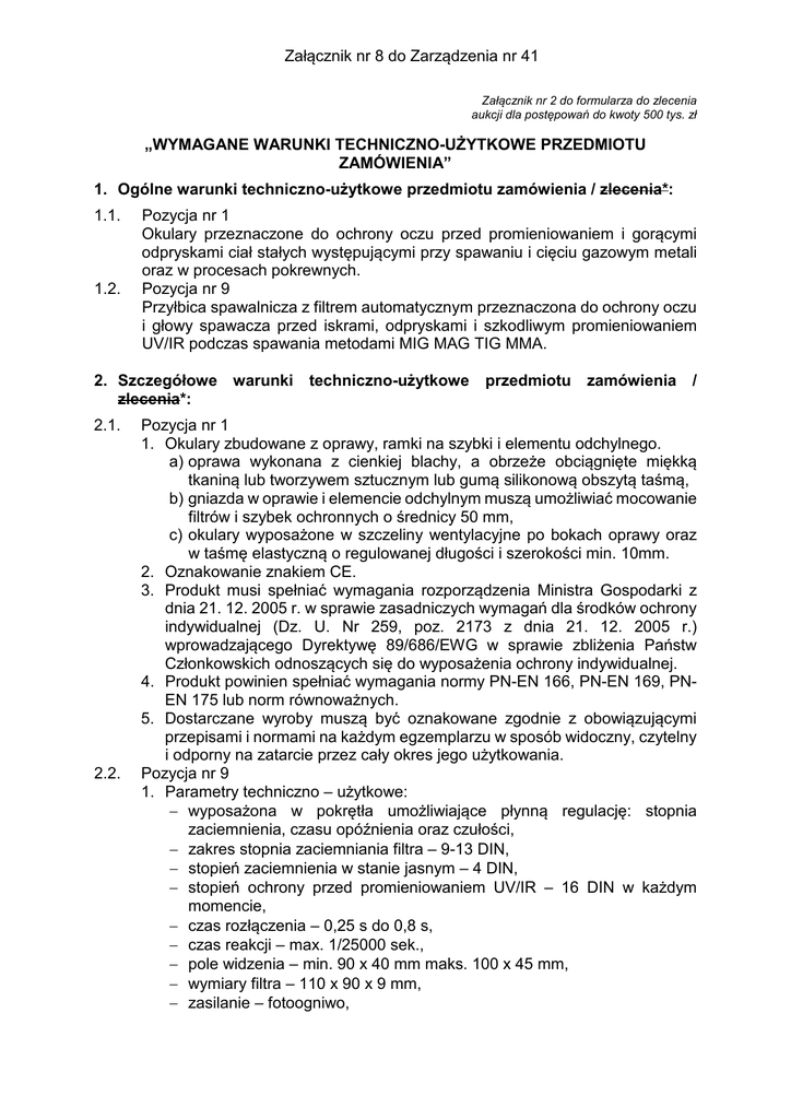 Załącznik nr 8 do Zarządzenia nr 41 Załącznik nr 2 do formularza do zlecenia aukcji dla postępowań do kwoty 500 tys. zł „WYMAGANE WARUNKI TECHNICZNO-UŻYTKOWE PRZEDMIOTU ZAMÓWIENIA” 1. Ogólne warunki techniczno-użytkowe przedmiotu zamówienia / zlecenia*: 1.1. 1.2. Pozycja nr 1 Okulary przeznaczone do ochrony oczu przed promieniowaniem i gorącymi odpryskami ciał stałych występującymi przy spawaniu i cięciu gazowym metali oraz w procesach pokrewnych. Pozycja nr 9 Przyłbica spawalnicza z filtrem automatycznym przeznaczona do ochrony oczu i głowy spawacza przed iskrami, odpryskami i szkodliwym promieniowaniem UV/IR podczas spawania metodami MIG MAG TIG MMA. 2. Szczegółowe warunki zlecenia*: 2.1. 2.2. techniczno-użytkowe przedmiotu zamówienia / Pozycja nr 1 1. Okulary zbudowane z oprawy, ramki na szybki i elementu odchylnego. a) oprawa wykonana z cienkiej blachy, a obrzeże obciągnięte miękką tkaniną lub tworzywem sztucznym lub gumą silikonową obszytą taśmą, b) gniazda w oprawie i elemencie odchylnym muszą umożliwiać mocowanie filtrów i szybek ochronnych o średnicy 50 mm, c) okulary wyposażone w szczeliny wentylacyjne po bokach oprawy oraz w taśmę elastyczną o regulowanej długości i szerokości min. 10mm. 2. Oznakowanie znakiem CE. 3. Produkt musi spełniać wymagania rozporządzenia Ministra Gospodarki z dnia 21. 12. 2005 r. w sprawie zasadniczych wymagań dla środków ochrony indywidualnej (Dz. U. Nr 259, poz. 2173 z dnia 21. 12. 2005 r.) wprowadzającego Dyrektywę 89/686/EWG w sprawie zbliżenia Państw Członkowskich odnoszących się do wyposażenia ochrony indywidualnej. 4. Produkt powinien spełniać wymagania normy PN-EN 166, PN-EN 169, PNEN 175 lub norm równoważnych. 5. Dostarczane wyroby muszą być oznakowane zgodnie z obowiązującymi przepisami i normami na każdym egzemplarzu w sposób widoczny, czytelny i odporny na zatarcie przez cały okres jego użytkowania. Pozycja nr 9 1. Parametry techniczno – użytkowe: − wyposażona w pokrętła umożliwiające płynną regulację: stopnia zaciemnienia, czasu opóźnienia oraz czułości, − zakres stopnia zaciemniania filtra – 9-13 DIN, − stopień zaciemnienia w stanie jasnym – 4 DIN, − stopień ochrony przed promieniowaniem UV/IR – 16 DIN w każdym momencie, − czas rozłączenia – 0,25 s do 0,8 s, − czas reakcji – max. 1/25000 sek., − pole widzenia – min. 90 x 40 mm maks. 100 x 45 mm, − wymiary filtra – 110 x 90 x 9 mm, − zasilanie – fotoogniwo, Załącznik nr 8 do Zarządzenia nr 41 2. 3. 4. 5. − temperatura użytkowania - -5 st.C do +55 st.C − włączanie / wyłączanie zasilania automatyczne, − wyposażona w opaskę przeciwpotną. Oznakowanie znakiem CE. Produkt musi spełniać wymagania rozporządzenia Ministra Gospodarki z dnia 21. 12. 2005 r. w sprawie zasadniczych wymagań dla środków ochrony indywidualnej (Dz. U. Nr 259, poz. 2173 z dnia 21. 12. 2005 r.) wprowadzającym Dyrektywę 89/686/EWG w sprawie zbliżenia Państw Członkowskich odnoszących się do wyposażenia ochrony indywidualnej. Produkt powinien spełniać wymagania norm PN-EN 175 i PN-EN 379+A1 lub norm równoważnych. Dostarczane wyroby muszą być oznakowane zgodnie z obowiązującymi przepisami i normami na każdym egzemplarzu w sposób widoczny, czytelny i odporny na zatarcie przez cały okres jego użytkowania. 3. Wymagane dokumenty: 3.1. Wykaz dokumentów jakie należy złożyć w terminie składania ofert /Wykaz dokumentów składanych przez oferenta, który złożył najkorzystniejszą ofertę w aukcji*: Dla wszystkich pozycji – lista oferowanych pozycji z podaniem nazwy własnej materiału. 3.1.1. Pozycja nr 1÷15 1. Deklaracja zgodności WE, z powołaniem na obowiązujące przepisy i normy, wystawiona przez Producenta lub upoważnionego przedstawiciela według obowiązujących przepisów prawa. 2. Certyfikat oceny typu WE, wydany przez notyfikowaną jednostkę certyfikującą. 3. Instrukcja użytkowania wyrobu zgodna z wymaganiami rozporządzenia Ministra Gospodarki z dnia 21.12.2005r. w sprawie zasadniczych wymagań dla środków ochrony indywidualnej (Dz. U. Nr 259, poz. 2173 z dnia 21.12.2005r.). 4. Deklaracja producenta lub upoważnionego przedstawiciela, że wyrób spełnia przedstawione przez Zamawiającego wymagania (dotyczy pozycji 1, 9). 3.1.2. Pozycja nr 16÷23 1. Deklaracja zgodności WE, z powołaniem na obowiązujące przepisy i normy, wystawiona przez Producenta lub upoważnionego przedstawiciela według obowiązujących przepisów prawa. 2. Certyfikat oceny typu WE, wydany przez notyfikowaną jednostkę certyfikującą. 4. Wymagane dokumenty: 4.1. Wykaz dokumentów składanych wraz z pierwszą dostawą przedmiotu zamówienia: 4.1.1. Pozycja nr 1÷15 Wraz z pierwszą dostawą wyrobu na kopalnie Dostawca winien dołączyć: certyfikat oceny typu WE, instrukcję użytkowania, przechowywania i konserwacji, deklarację zgodności WE i świadectwo jakości. Załącznik nr 8 do Zarządzenia nr 41 4.1.2. Pozycja nr 16÷23 Wraz z pierwszą dostawą wyrobu na kopalnie Dostawca winien dołączyć: certyfikat oceny typu WE, deklarację zgodności WE i świadectwo jakości. 4.2. Wykaz dokumentów składanych wraz z każdą dostawą przedmiotu zamówienia: 4.2.1. Pozycja nr 1÷23 Wraz z każdą dostawą wyrobu na kopalnię Dostawca winien dołączyć: deklarację zgodności WE i świadectwo jakości * niepotrzebne skreślić
