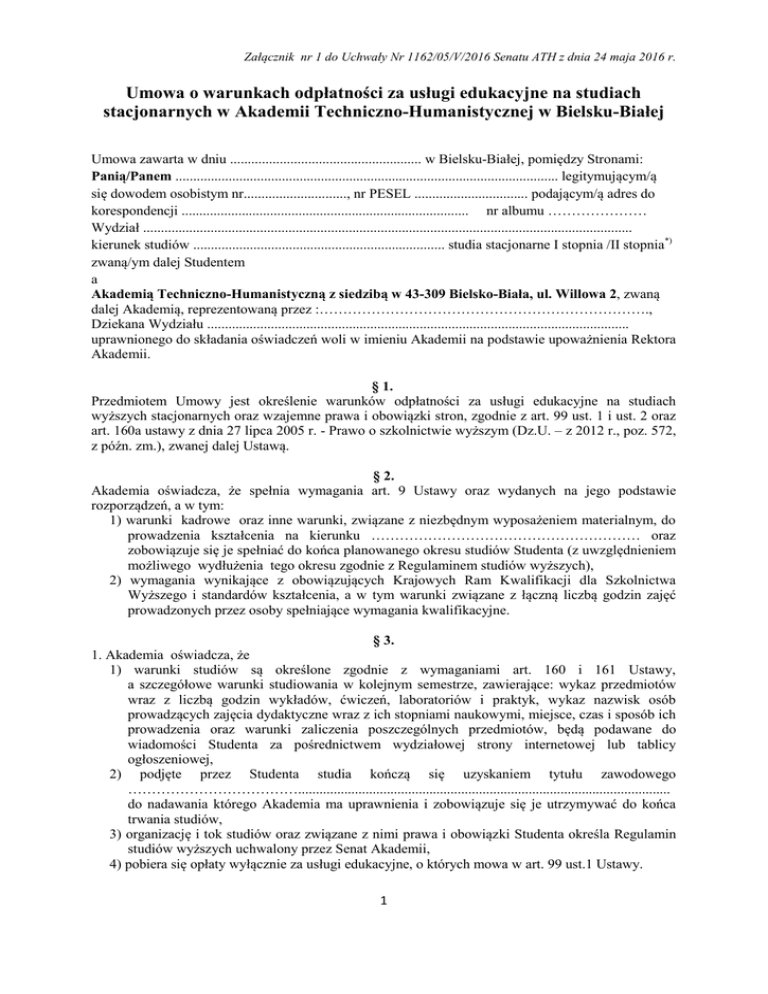 Załącznik nr 1 do Uchwały Nr 1162/05/V/2016 Senatu ATH z dnia 24 maja 2016 r. Umowa o warunkach odpłatności za usługi edukacyjne na studiach stacjonarnych w Akademii Techniczno-Humanistycznej w Bielsku-Białej Umowa zawarta w dniu ...................................................... w Bielsku-Białej, pomiędzy Stronami: Panią/Panem ............................................................................................................ legitymującym/ą się dowodem osobistym nr............................., nr PESEL ................................ podającym/ą adres do korespondencji ................................................................................. nr albumu ………………… Wydział .......................................................................................................................................... kierunek studiów ....................................................................... studia stacjonarne I stopnia /II stopnia*) zwaną/ym dalej Studentem a Akademią Techniczno-Humanistyczną z siedzibą w 43-309 Bielsko-Biała, ul. Willowa 2, zwaną dalej Akademią, reprezentowaną przez :……………………………………………………………., Dziekana Wydziału ....................................................................................................................... uprawnionego do składania oświadczeń woli w imieniu Akademii na podstawie upoważnienia Rektora Akademii. § 1. Przedmiotem Umowy jest określenie warunków odpłatności za usługi edukacyjne na studiach wyższych stacjonarnych oraz wzajemne prawa i obowiązki stron, zgodnie z art. 99 ust. 1 i ust. 2 oraz art. 160a ustawy z dnia 27 lipca 2005 r. - Prawo o szkolnictwie wyższym (Dz.U. – z 2012 r., poz. 572, z późn. zm.), zwanej dalej Ustawą. § 2. Akademia oświadcza, że spełnia wymagania art. 9 Ustawy oraz wydanych na jego podstawie rozporządzeń, a w tym: 1) warunki kadrowe oraz inne warunki, związane z niezbędnym wyposażeniem materialnym, do prowadzenia kształcenia na kierunku ………………………………………………… oraz zobowiązuje się je spełniać do końca planowanego okresu studiów Studenta (z uwzględnieniem możliwego wydłużenia tego okresu zgodnie z Regulaminem studiów wyższych), 2) wymagania wynikające z obowiązujących Krajowych Ram Kwalifikacji dla Szkolnictwa Wyższego i standardów kształcenia, a w tym warunki związane z łączną liczbą godzin zajęć prowadzonych przez osoby spełniające wymagania kwalifikacyjne. § 3. 1. Akademia oświadcza, że 1) warunki studiów są określone zgodnie z wymaganiami art. 160 i 161 Ustawy, a szczegółowe warunki studiowania w kolejnym semestrze, zawierające: wykaz przedmiotów wraz z liczbą godzin wykładów, ćwiczeń, laboratoriów i praktyk, wykaz nazwisk osób prowadzących zajęcia dydaktyczne wraz z ich stopniami naukowymi, miejsce, czas i sposób ich prowadzenia oraz warunki zaliczenia poszczególnych przedmiotów, będą podawane do wiadomości Studenta za pośrednictwem wydziałowej strony internetowej lub tablicy ogłoszeniowej, 2) podjęte przez Studenta studia kończą się uzyskaniem tytułu zawodowego ………………………………......................................................................................................... do nadawania którego Akademia ma uprawnienia i zobowiązuje się je utrzymywać do końca trwania studiów, 3) organizację i tok studiów oraz związane z nimi prawa i obowiązki Studenta określa Regulamin studiów wyższych uchwalony przez Senat Akademii, 4) pobiera się opłaty wyłącznie za usługi edukacyjne, o których mowa w art. 99 ust.1 Ustawy. 1 2. Student oświadcza, że zapoznał się z Statutem Akademii Techniczno-Humanistycznej w BielskuBiałej, Regulaminem studiów wyższych oraz planem studiów, Uchwałą Senatu Akademii Techniczno-Humanistycznej w sprawie zasad pobierania opłat za świadczone usługi edukacyjne oraz trybu i warunków zwalniania z tych opłat, obowiązującym Zarządzeniem Rektora Akademii Techniczno-Humanistycznej w sprawie wysokości opłat za usługi edukacyjne w Akademii Techniczno-Humanistycznej w Bielsku-Białej, których treść znajduje się na stronie www.ath.bielsko.pl. § 4. 1. Akademia zobowiązuje się do: 1) realizacji programu kształcenia na wybranym przez Studenta kierunku ……………...……..………........… na stacjonarnych studiach I / II* stopnia w ……………….... semestralnym cyklu kształcenia, rozpoczynającym się od …………………. 20…….. r. 2) przeprowadzania zajęć dydaktycznych przez nauczycieli akademickich posiadających odpowiednie kwalifikacje naukowe, dydaktyczne lub zawodowe, 3) wydania po zakończeniu toku studiów dyplomu zgodnego z ukończonym kierunkiem studiów i formą kształcenia, 4) udostępniania na stronie internetowej Uczelni, w terminie przewidzianym w Ustawie i Regulaminie studiów wyższych, informacji na temat planu i programu studiów oraz na temat wysokości i terminu wnoszenia opłat za kształcenie, 5) zapewnienia Studentowi pomocy materialnej, zgodnie z Regulaminem pomocy materialnej dla studentów i doktorantów Akademii Techniczno-Humanistycznej w Bielsku-Białej, 6) umożliwienia Studentowi dokonywania okresowej oceny jakości kształcenia, 7) zapewnienia Studentowi czynnego i biernego prawa wyborczego do organów kolegialnych Uczelni, 8) przestrzegania praw Studenta przewidzianych w Ustawie i Regulaminie studiów wyższych. 2. Akademia zobowiązuje się, że w przypadku postępowania o jej likwidację lub utraty uprawnień do prowadzenia kierunku na określonym poziomie, organy Akademii będą podejmować aktywne działania na rzecz stworzenia możliwości ukończenia studiów przez Studenta na analogicznych, wynikających z niniejszej Umowy warunkach. § 5. 1. Student zobowiązuje się do: 1) uczestniczenia w zajęciach dydaktycznych i innych określonych program