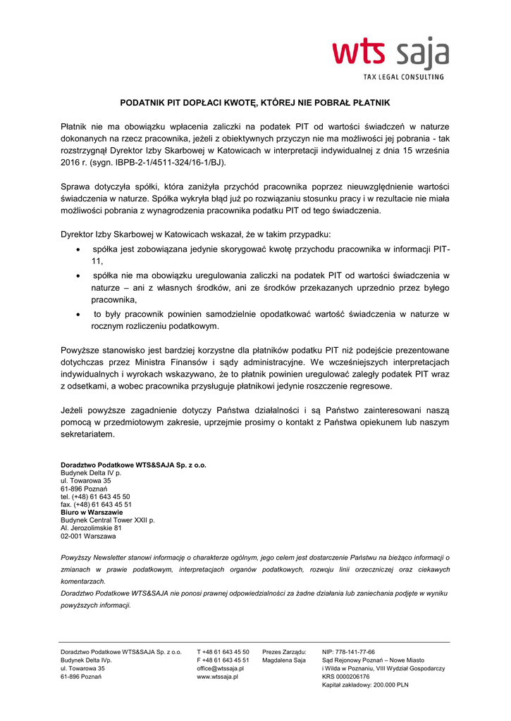 PODATNIK PIT DOPŁACI KWOTĘ, KTÓREJ NIE POBRAŁ PŁATNIK Płatnik nie ma obowiązku wpłacenia zaliczki na podatek PIT od wartości świadczeń w naturze dokonanych na rzecz pracownika, jeżeli z obiektywnych przyczyn nie ma możliwości jej pobrania - tak rozstrzygnął Dyrektor Izby Skarbowej w Katowicach w interpretacji indywidualnej z dnia 15 września 2016 r. (sygn. IBPB-2-1/4511-324/16-1/BJ). Sprawa dotyczyła spółki, która zaniżyła przychód pracownika poprzez nieuwzględnienie wartości świadczenia w naturze. Spółka wykryła błąd już po rozwiązaniu stosunku pracy i w rezultacie nie miała możliwości pobrania z wynagrodzenia pracownika podatku PIT od tego świadczenia. Dyrektor Izby Skarbowej w Katowicach wskazał, że w takim przypadku: spółka jest zobowiązana jedynie skorygować kwotę przychodu pracownika w informacji PIT11, spółka nie ma obowiązku uregulowania zaliczki na podatek PIT od wartości świadczenia w naturze – ani z własnych środków, ani ze środków przekazanych uprzednio przez byłego pracownika, to były pracownik powinien samodzielnie opodatkować wartość świadczenia w naturze w rocznym rozliczeniu podatkowym. Powyższe stanowisko jest bardziej korzystne dla płatników podatku PIT niż podejście prezentowane dotychczas przez Ministra Finansów i sądy administracyjne. We wcześniejszych interpretacjach indywidualnych i wyrokach wskazywano, że to płatnik powinien uregulować zaległy podatek PIT wraz z odsetkami, a wobec pracownika przysługuje płatnikowi jedynie roszczenie regresowe. Jeżeli powyższe zagadnienie dotyczy Państwa działalności i są Państwo zainteresowani naszą pomocą w przedmiotowym zakresie, uprzejmie prosimy o kontakt z Państwa opiekunem lub naszym sekretariatem. Doradztwo Podatkowe WTS&SAJA Sp. z o.o. Budynek Delta IV p. ul. Towarowa 35 61-896 Poznań tel. (+48) 61 643 45 50 fax. (+48) 61 643 45 51 Biuro w Warszawie Budynek Central Tower XXII p. Al. Jerozolimskie 81 02-001 Warszawa Powyższy Newsletter stanowi informację o charakterze ogólnym, jego celem jest dostarczenie Państwu na bieżąco informacji o zmianach w prawie podatkowym, interpretacjach organów podatkowych, rozwoju linii orzeczniczej oraz ciekawych komentarzach. Doradztwo Podatkowe WTS&SAJA nie ponosi prawnej odpowiedzialności za żadne działania lub zaniechania podjęte w wyniku powyższych informacji. Doradztwo Podatkowe WTS&SAJA Sp. z o.o. Budynek Delta IVp. ul. Towarowa 35 61-896 Poznań T +48 61 643 45 50 F +48 61 643 45 51 [email protected] www.wtssaja.pl Prezes Zarządu: Magdalena Saja NIP: 778-141-77-66 Sąd Rejonowy Poznań – Nowe Miasto i Wilda w Poznaniu, VIII Wydział Gospodarczy KRS 0000206176 Kapitał zakładowy: 200.000 PLN