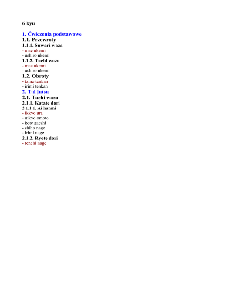 6 kyu 1. Ćwiczenia podstawowe 1.1. Przewroty 1.2. Obroty 2. Tai
