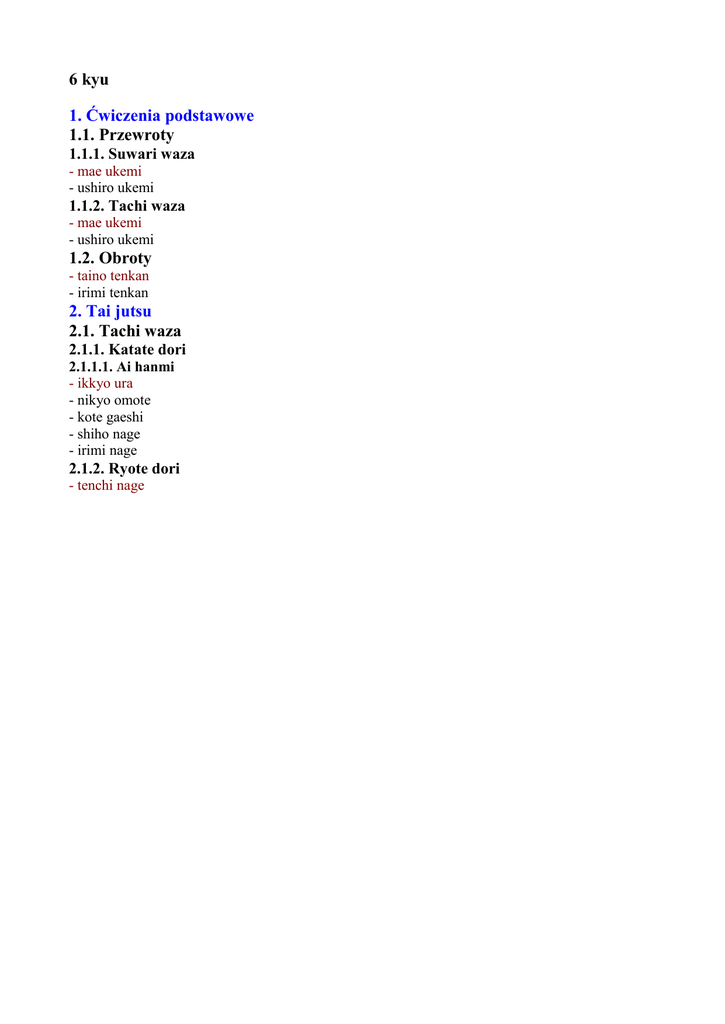 6 kyu 1. Ćwiczenia podstawowe 1.1. Przewroty 1.1.1. Suwari waza - mae ukemi - ushiro ukemi 1.1.2. Tachi waza - mae ukemi - ushiro ukemi 1.2. Obroty - taino tenkan - irimi tenkan 2. Tai jutsu 2.1. Tachi waza 2.1.1. Katate dori 2.1.1.1. Ai hanmi - ikkyo ura - nikyo omote - kote gaeshi - shiho nage - irimi nage 2.1.2. Ryote dori - tenchi nage 5 kyu 1. Ćwiczenia podstawowe 1.1. Przewroty 1.1.1. Suwari waza - mae ukemi - ushiro ukemi 1.1.2. Tachi waza - mae ukemi - ushiro ukemi 1.2. Obroty - taino tenkan - irimi tenkan 1.3. Tai sabaki - mae shikko - ushiro shikko 1.4. Ćwiczenia z bokken - makko i kesa giri 1.5. Ćwiczenia z jo - uderzenia i pchnięcia 2. Tai jutsu 2.1. Tachi waza 2.1.1. Katate dori 2.1.1.1. Ai hanmi - ikkyo omote - ikkyo ura - nikyo omote - nikyo ura - sankyo ura - kote gaeshi - shiho nage - irimi nage 2.1.1.2. Gyaku hanmi - shiho nage - irimi nage (poziom jodan) - kaiten nage (uchi kaiten) - zenpo gedan kuzushi ikkyo ura (kosa dachi) - zenpo gedan kuzushi nikyo ura 2.1.2. Ryote dori - tenchi nage 2.2. Suwari waza 2.2.1. Katate dori 2.2.1.1. Ai hanmi - ikkyo ura - nikyo omote 4 kyu 1. Ćwiczenia podstawowe 1.1. Przewroty 1.1.1. Suwari waza - mae ukemi - ushiro ukemi 1.1.2. Tachi waza - mae ukemi - ushiro ukemi 1.2. Obroty - taino tenkan - irimi tenkan 1.3. Tai sabaki - mae shikko - ushiro shikko 1.4. Ćwiczenia z bokken - makko i kesa giri 1.5. Ćwiczenia z jo - uderzenia i pchnięcia 2. Tai jutsu 2.1. Tachi waza 2.1.1. Katate dori 2.1.1.1. Ai hanmi - ikkyo omote - ikkyo ura - nikyo omote - nikyo ura - sankyo ura - kote gaeshi - shiho nage - irimi nage - irimi nage (wersja z wepchnięciem łokcia) - ude kime nage omote - ude kime nage ura 2.1.1.2. Gyaku hanmi - shiho nage - irimi nage (poziom jodan) - kaiten nage (uchi kaiten) - kote gaeshi omote - ude kime nage - kaiten nage soto - kokyu nage - zenpo gedan kuzushi ikkyo ura (kosa dachi) - zenpo gedan kuzushi nikyo ura - zenpo gedan kuzushi sankyo soto 2.1.2. Ryote dori - tenchi nage 2.1.3. Ushiro ryote dori 2.1.3.1. Ai hanmi - ikkyo ura - irimi nage 2.2. Suwari waza 2.2.1. Katate dori 2.2.1.1. Ai hanmi - ikkyo omote - ikkyo ura - nikyo omote - nikyo ura - sankyo ura - kote gaeshi ura 3. Ken no tebiki 3.1. Ai hami - ikkyo ura - nikyo - sankyo 4. Jo no tebiki 4.1. Ai hanmi - ikkyo ura - nikyo - sankyo 5. Ken tai ken 5.1. Ai hanmi - ikkyo omote - ikkyo ura - nikyo 6. Ken tai jo 6.1. Ai hanmi - ikkyo omote - ikkyo ura - nikyo 3 kyu 1. Ćwiczenia podstawowe 1.1. Przewroty 1.1.1. Suwari waza - mae ukemi - ushiro ukemi 1.1.2. Tachi waza - mae ukemi - ushiro ukemi 1.2. Obroty - taino tenkan - irimi tenkan 1.3. Tai sabaki - mae shikko - ushiro shikko 1.4. Ćwiczenia z bokken - makko i kesa giri - yoko taino tenkan - yoko irimi tenkan - nidan uchi 1.5. Ćwiczenia z jo - uderzenia i pchnięcia - yoko taino tenkan - yoko irimi tenkan 2. Tai jutsu 2.1. Tachi waza 2.1.1. Katate dori 2.1.1.1. Ai hanmi - ikkyo omote - ikkyo ura - nikyo omote - nikyo ura - sankyo ura - kote gaeshi - shiho nage - irimi nage - irimi nage (wersja z wepchnięciem łokcia) - ude kime nage omote - ude kime nage ura - koshi nage - zenpo gedan kuzushi ikkyo omote (kosa dachi) - zenpo gedan kuzushi nikyo - zenpo gedan kuzushi kaiten nage soto 2.1.1.2. Gyaku hanmi - taino tenkan ikkyo (okuri ashi) - taino tenkan nikyo - taino tenkan sankyo (uchi kaiten) - shiho nage - irimi nage (poziom jodan) - kaiten nage (uchi kaiten) - kote gaeshi omote - ude kime nage - kaiten nage soto - kokyu nage - zenpo gedan kuzushi ikkyo ura (kosa dachi) - zenpo gedan kuzushi nikyo ura - zenpo gedan kuzushi sankyo soto 2.1.2. Ryote dori - tenchi nage 2.1.3. Ushiro ryote dori 2.1.3.1. Ai hanmi - ikkyo ura - nikyo - sankyo - irimi nage - shiho nage - kote gaeshi - ude kime nage 2.1.4. Jodan tsuki 2.1.4.1. Soto - ikkyo - irimi nage 2.1.4.2. Uchi - ikkyo - nikyo - sankyo - shiho nage - kote gaeshi ura - ude kime nage 2.1.5. Chudan tsuki - kote gaeshi - kaiten nage soto 2.2. Suwari waza 2.2.1. Katate dori 2.2.1.1. Ai hanmi - ikkyo omote - ikkyo ura - nikyo omote - nikyo ura - sankyo ura - kote gaeshi ura - shiho nage 2.3. Hanmi handachi waza 2.3.1. Katate dori 2.3.1.1. Ai hanmi - ikkyo - shiho nage - kokyu nage 3. Ken no tebiki 3.1. Ai hanmi - ikkyo ura - nikyo - sankyo - irimi nage - shiho nage - kote gaeshi - ude kime nage 4. Jo no tebiki 4.1. Ai hanmi - ikkyo ura - nikyo - sankyo - irimi nage - shiho nage - kote gaeshi - ude kime nage 5. Ken tai ken 5.1. Ai hanmi - ikkyo omote - ikkyo ura - nikyo - sankyo (2 wersje) 5.2. Gyaku hanmi - ikkyo - nikyo z zagarnieciem - nikyo - sankyo soto 6. Ken tai jo 6.1. Ai hanmi - ikkyo omote - ikkyo ura - nikyo - sankyo 6.2. Gyaku hanmi - ikkyo - nikyo z zagarnieciem - nikyo - sankyo soto 2 kyu 1. Ćwiczenia podstawowe 1.1. Przewroty 1.1.1. Suwari waza - mae ukemi - ushiro ukemi 1.1.2. Tachi waza - mae ukemi - ushiro ukemi 1.2. Obroty - taino tenkan - irimi tenkan 1.3. Tai sabaki - mae shikko - ushiro shikko 1.4. Ćwiczenia z bokken - makko i kesa giri - yoko taino tenkan - yoko irimi tenkan - nidan uchi - kote men do 1.5. Ćwiczenia z jo - uderzenia i pchnięcia - yoko taino tenkan - yoko irimi tenkan 2. Tai jutsu 2.1. Tachi waza 2.1.1. Katate dori 2.1.1.1. Ai hanmi - ikkyo omote - ikkyo ura - nikyo omote - nikyo ura - sankyo ura - kote gaeshi - shiho nage - irimi nage - irimi nage (wersja z wepchnięciem łokcia) - ude kime nage omote - ude kime nage ura - koshi nage - zenpo gedan kuzushi ikkyo omote (kosa dachi) - zenpo gedan kuzushi ikkyo (irimi tenkan) - zenpo gedan kuzushi nikyo - zenpo gedan kuzushi nikyo (irimi tenkan soto) - zenpo gedan kuzushi uchi kaiten nage (irimi tenkan soto) - zenpo gedan kuzushi kaiten nage soto 2.1.1.2. Gyaku hanmi - taino tenkan ikkyo (okuri ashi) - taino tenkan nikyo - taino tenkan sankyo (uchi kaiten) - shiho nage - irimi nage (poziom jodan) - irimi nage (poziom chudan) - irimi nage (poziom gedan) - kaiten nage (uchi kaiten) - kote gaeshi omote - ude kime nage - kaiten nage soto - kokyu nage - zenpo gedan kuzushi ikkyo