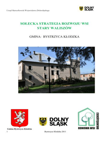 Urząd Marszałkowski Województwa Dolnośląskiego SOŁECKA STRATEGIA ROZWOJU WSI STARY WALISZÓW GMINA: BYSTRZYCA KŁODZKA Gmina Bystrzyca Kłodzka 1 Bystrzyca Kłodzka 2011 Urząd Marszałkowski Województwa Dolnośląskiego W opracowaniu dokumentu udział wzięli: Członkowie Grupy Odnowy Wsi Stary Waliszów - Joanna Konopacka (Szkwarek) - Marlena Synowiec - Anna Bień - Dorota Szkwarek - Marietta Czerny- Gacek - Jarosław Kołt - Franciszek Nowakowski Gminny Koordynator Programu “Odnowa Wsi Województwa Dolnośląskiego” - Monika Pyrcz – Jurczyk Warsztaty z cyklu “Planowanie w procesie odnowy wsi” przeprowadzili: Moderatorzy Programu „Odnowa Wsi Dolnośląskiej” Ewa Guzik Edyta Mulka-Gonera 2 Bystrzyca Kłodzka 2011 Urząd Marszałkowski Województwa Dolnośląskiego Spis treści: Współautorzy opracowania............................................................................................2 Analiza zasobów …………...........................................................................................4-8 Analiza SWOT ...............................................................................................................9 Analiza potencjału rozwojowego wsi.............................................................................10 Wizja odnowy i rozwoju wsi .........................................................................................11 Program krótkoterminowy odnowy wsi ........................................................................12 Plan i program odnowy wsi ...........................................................................................13-15 Dokumentacja fotograficzna dotycząca zasobów wsi ...................................................16-17 3 Bystrzyca Kłodzka 2011 Urząd Marszałkowski Województwa Dolnośląskiego ANALIZA ZASOBÓW Znaczenie zasobu Rodzaj zasobu Opis (nazwanie) zasobu jakim wieś dysponuje (odpowiednio wstaw x) WyróżMałe Duże niające PRZYRODNICZY Walory krajobrazu, rzeźby terenu Stan środowiska Walory klimatu Walory szaty roślinnej Cenne przyrodniczo obszary lub obiekty Świat zwierzęcy (ostoje, siedliska) Wody powierzchniowe (cieki, rzeki, stawy) X X Duża wieś łańcuchowa nad dolnym brzegiem Równicy,u podnóża Żelaznych Gór, poniżej ujścia Waliszowskiej Wody na wysokości około 320-390 m n.p.m., na granicy Rowu Górnej Nysy, u podnóża Wysoczyzny Idzikowa i Krowiarek. Zabudowania ciągną się na długości 5,1 kilometra w malowniczej, krętej dolinie.W centrum wsi 70-arowy park wpisany do rejestru zabytków z licznymi kilkudziesięcioletnimi drzewami(kasztan, robinia akacjowa, jesion), w większej części porośnięty częściowo chronionym czosnkiem niedźwiedzim. Wokół miejscowości wiele lasów liściastych i iglastym ze zwierzyną i licznymi gatunkami ptaków. Rzeka Waliszowska Woda wzdłuż całej miejscowości; Liczne rowy X X X Wody podziemne Gleby Kopaliny Walory geotechniczne -- Inne -- Kulturowy 4 Walory architektury Kościół, dwór barokowy, zamek, zabytkowy park przy dworze, remiza strażacka X Walory przestrzeni wiejskiej publicznej Kościół pw. Św. Wawrzyńca wzniesiony po1269r. z kwadratową wieżą z 1524r.;renesansowa plebania z końca16wieku przebudowana w końcu 19-wieku; Dwór barokowy, murowany z 18-wieku znacznie przebudowany w końcu 19-wieku z częścią neogotycką flankowaną wieżyczkami; Kościółek p.w. Podwyższenia Krzyża na Górce; liczne przydrożne kapliczki i krzyże X Bystrzyca Kłodzka 2011 Urząd Marszałkowski Województwa Dolnośląskiego Walory przestrzeni wiejskiej prywatnej Drewniane domy nr 67 i112; Zamek nr 114 Zabytki i pamiątki historyczne W Kościele ołtarz główny i ambona rzeźbiarza monachijskiego Józefa Elsnera; ołtarze boczne z malowidłami Hieronima Richtera; chrzcielnica a przy niej duża Pieta, na ścianach obrazy Drogi Krzyżowej; Sztandar O.S.P. z 1888r.jeden z najstarszych sztandarów w Polsce przywieziony z Tarnowicy Polnej X X Osobliwości kulturowe Miejsca, osoby i przedmioty kultu Święta, odpusty, pielgrzymki Tradycje, obrzędy, gwara Święta Bożego Narodzenia i Wielkiej Nocy oraz Bożego Ciała; odpust ku czci Św. Wawrzyńca(10 września),odpust Podwyższenia Krzyża oraz odpust ku czci Św.Marcina (11 listopada) ,który to święty znajduje się w bocznym ołtarzu a został przywieziony przez wysiedlanych mieszkańców ze Wschodu z kościoła w Tarnowicy Polnej i umieszczony w kościele w Starym Waliszowie Tradycja ze Wschodu szczególnie w obchodzeniu świąt; specyficzna gwara wschodnia dzisiaj już tylko używana przez X X starsze pokolenie Legendy, podania i fakty historyczne Przekazy literackie Ważne postacie i przekazy historyczne Specyficzne nazwy Specyficzne potrawy Została napisana i wydana książka przez Państwo Marię i Jana Kruków opisująca życie i obyczaje ludzi w Tarnowicy Polnej z wieloma zdjęciami i ilustracjami Filip Fediuk nieżyjący już jasnowidz który przepowiadał ludziom co może się wydarzyć a także leczył ziołami,pochowany na cmentarzu parafialnym Do dziś wiele specyficznych słów istnieje i jest w użyciu np. kiptarek- bezrękawnik; kołbanek- pniak drzewa; tarcioki- placki ziemniaczane; pleskanka-pieczony biały ser na słono dodawany do święconki Tarcioki ze smażeniem i białym serem; pierogi z kapustą kiszoną i śledziem; zupa kapuściana ze słodkiej kapusty; święconka z czerwonym barszczem X X X Dawne zawody Zespoły artystyczne, twórcy 5 Ludowy Zespół Śpiewaczy „‟TARNAWICZANKI”- nazwa zespołu pochodzi od wsi na Kresach Tarnowica Polna skąd część tej dużej wsi osiedliła się w 1945 r w naszej wsi. W repertuarze zespołu, który Bystrzyca Kłodzka 2011 X Urząd Marszałkowski Województwa Dolnośląskiego istnieje od 1968 r w większości znajdują się piosenki przywiezione z Tarnowicy. Inne Obiekty i tereny Działki pod zabudowę mieszkaniową Działki pod domy letniskowe Działki pod zakłady usługowe i 