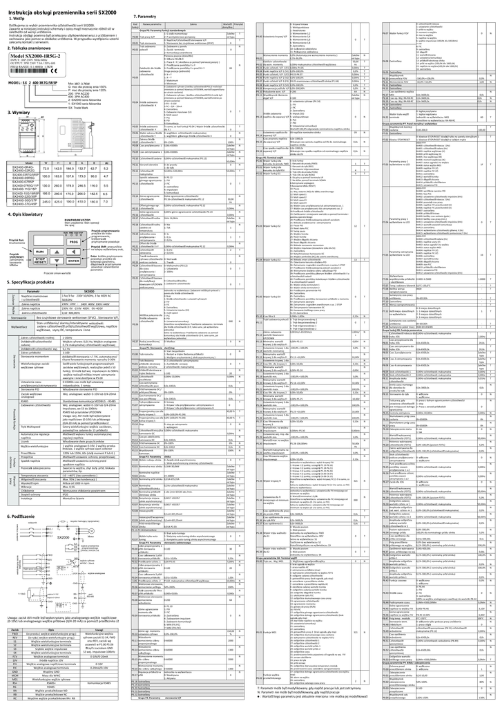 Instrukcja obsługi przemiennika serii SX2000 1. Wstęp Dziękujemy za wybór przemiennika częstotliwości serii SX2000. Zawarte w niniejszej instrukcji schematy i opisy mogą nieznacznie różnić się w zależności od wersji urządzenia. Instrukcja obsługi powinna być przekazana użytkownikowi wraz z urządzeniem i zachowana jako pomoc w obsłudze urządzenia. W przypadku wystąpienia usterki zalecamy kontakt z serwisem. 2. Tabliczka znamionowa 7. Parametry Kod funkcji P0.00 P0.01 P0.02 Model SX2000-1R5G-2 INPUT: 1HP 230V 50Hz/60Hz OUTPUT: 3PH 230V 7.0A 150% 60S P0.03 MODEL: SX 2 400 3R7G/5R5P Moc G: moc dla przeciążenia 150% P: moc dla przeciążenia 120% 200: 1PH AC230 400: 3PH AC400 2: SX2000 seria falownika 1: SX1000 seria falownika SX: Trade Mark Nazwa parametru Zakres Wartość Priorytet domyślna Grupa P0: Parametry funkcji standardowych 1: G stało momentowy Tryb pracy G/P 2: P wentylatorowo-pompowy 0: Napięcie/Częstotliwość sterowanie V/F Tryb sterowania 1: Sterowanie bez czujnikowe wektorowe (SFVC) Tryb zadawania 0: Zadawanie z panelu poleceń 1: Zaciski terminala 2: Komunikacja zewnętrzna Pierwsza pozycja (dziesiątki) 0: Główne źródło X 1: Praca X i Y ( określana za pomocą pierwszej pozycji ) 2: Przełączanie pomiędzy X a Y Zależności dla źródła 3: Przełączanie pomiędzy X a pracą X i Y zadawania Druga pozycja (jednostki) częstotliwości 0: X + Y 1: X – Y 2: Maksimum 3: Minimum P0.04 Źródło zadawania częstotliwości X 3. Wymiary P0.05 Źródło zadawania częstotliwości Y P0.06 Wybór zakresu źródła częstotliwości Y Zakresu źródła P0.07 częstotliwości Y P0.08 Czas przyśpieszania 1 0: Zadawanie cyfrowe ( bieżąca częstotliwość P01.0 może być zmieniana za pomocą klawiszy UP/DOWN, wartość zapamiętana po utracie zasilania) 1: Zadawanie cyfrowe ( bieżąca częstotliwość P01.0 może być zmieniana za pomocą klawiszy UP/DOWN, wartość zniknie po utracie zasilania) 2:FIV – 0-10V 3:FIC – 0/4 – 20mA 4: Zastrzeżony 5: Zadawanie impulsowe (S3) 6: Multi speed 7: PLC 8: PID 9: Komunikacja To samo, co kod funkcji P0.04 ( Wybór źródła częstotliwości dla X ) 0: względem częstotliwości maksymalnej 1: względem głównego źródła częstotliwości X SX2400-0R4GSX2400-02R2G SX2400-03R7G/5R5P SX2400-05R5G SX2400-07R5P SX2400-07R5G/11P SX2400-11G/15P SX2400-15G/18R5PSX2400-22G/30P SX2400-30G/37P 245.0 SX2400-37G/45P P0.11 Kierunek obrotów P0.12 Częstotliwość maksymalna Sposób zadawania górnego ograniczenia P0.13 częstotliwości 425.0 190.0 410.0 180.0 7.0 4. Opis klawiatury RUN/FWD/REV/STOP: Stan urządzenia: Stan operacji bieżącej Przycisk Run: Uruchomienie PROG Przycisk programowania przejście do trybu programowania, krótkotrwałe przytrzymanie powoduje Przycisk Shift przesunięcie na kolejny wyświetlany znak, Przycisk STOP/RESET: Zatrzymanie, kasowanie błędów Enter krótkie przytrzymanie powoduje przejście do kolejnego parametru, długotrwałe przytrzymanie powoduje zatwierdzenie parametru Przyciski zmian wartości 5. Specyfikacja produktu Parametr SX2000 Zasilanie Wyjście 1 faz/3 faz 230V 50/60Hz, 3 faz 400V AC 50/60Hz 230V: 170V - 240V 400V: 330V- 440V 230V: 0V -23 0V 400V: 0V -40 0V 0,10 -400,00Hz Napięcie znamionowe i cz ęstotliwość Zakres napięcia Zakres napięcia Zakres częstotliwości Sterowanie Bez czujnikowe sterowanie wektorowe (SFVC) , Sterowanie V/F, Wyświetlacz Stan urządzenia/ alarmy/interaktywne wskazówki: zadana częstotliwość prąd/częstotliwość wyjściowa, napięcie wyjściowe, szyny DC, temperatura i inne Sterowanie Zakres częstotliwości nośnej Dokładność częstotliwości zadanej Dokładność częstotliwości wyj. Zakres prędkości Sterowanie momentem Wielofunkcyjnye zaciski wejściowe cyfrowe Ustawienia czasu przyśpieszania/zatrzymywania Sterowanie PID Zaciski wejściowe analogowe RS485 Zadawanie częstotliwości 1-16kHz Wejście cyfrowe: 0,01 Hz; Wejście analogowe: 0,1% maksymalnej częstotliwości wyjściowej 0,1 Hz 1:100 dokładność sterowania +/- 5%, automatyczne/ ręczne forsowanie momentu rozruchu 0-30% Sześć wielo funkcyjneych programowalnych zacisków wejściowych, realizujące jedną z 50 funkcji, S3 może być wej. impulsowym do 50kHz. wejścia realizują między innymi zatrzymanie awaryjne i inne .dostępne w P5.00 0-65000s czas może być ustawiany indywidualnie, 3 rampy Wbudowanie sterowanie PID Wej. analogowe: wybór 0 -10V lub 0/4-20mA Pozostałe funkcje Standardowa komunikacja MODBUS - RS485 Wej. analogowe: wybór 0 -10V lub 0/4-20mA Impulsowo, we S3 do 100kHz , RS485 lub przycisków UP/DOWN Uwaga: wej. AVI może być wykorzystane jako napięciowe (0-10V) lub prądowego (0/4-20 mA) za pomocą przełącznika J2 Cztery wielofunkcyjne wejścia zaciskowe , pozwalają na zadanie do 15 prędkości Możliwość wyboru funkcji automatycznej regulacji napięcia Wbudowanie dwie grupy liczników 1 wyjście analogowe 0-10V, 2 wyjścia przekażnikowe, 1 wyjście cyfrowe open collector Tryb Multispeed Automatyczna regulacja napięcia Licznik Wyjścia wielofunkcyjne Funkcje ochronne Przeciążenie Przepięcie Spadek napięcia 120% lub 150%, 60s (stały moment P lub G ) Możliwość ustawieni ochrony przepięciowej Możliwość ustawienia ochrony przed spadkiem napięcia Zwarcie na wyjściu, zbyt duży prąd, blokada parametrów, itp. Pozostałe zabezpieczenia Warunki pracy Temperatura otoczenia Wilgotność otoczenia Wysokość npm Wibracje Chłodzenie Stopień ochrony Instalacja -10 - +40°C ( bez zamrożenia ) Max. 95% ( bez kondensacji ) Niższa od 1000 m npm Max. 0,5G Wymuszone chłodzenie powietrzem IP20 Montaż na ścianie 6. Podłączenie rezystor hamujący (opcjonalnie) zasilanie 3-fazowe wyłącznik SX2000 wielofunkcyjny zacisk wejściowy wyjście przekaźnika programowalnego 1~10kΩ wyjście cyfrowe wyjście analogowe wejście 0~10V wejście 0~20mA port RS-485 Uwaga: zacisk AVI może być wykorzystany jako analogowego wejście napięciowe (
