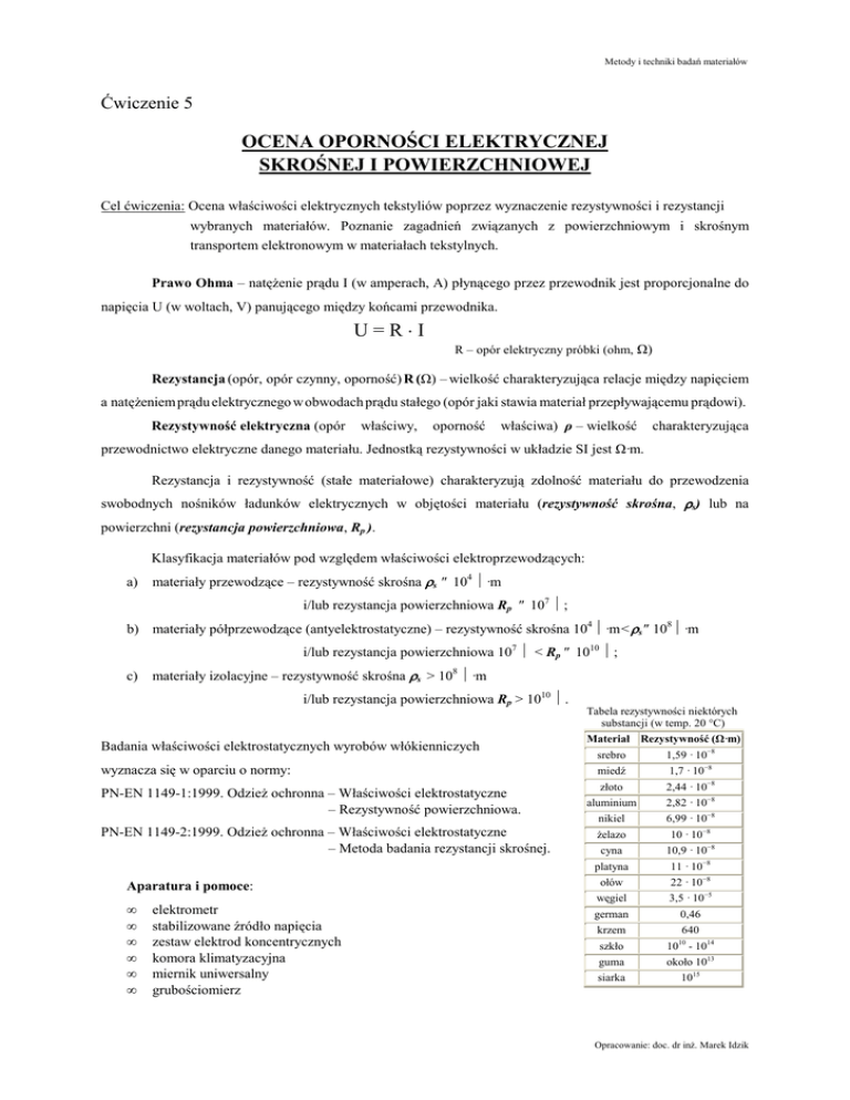 Metody i techniki badań materiałów Ćwiczenie 5 OCENA OPORNOŚCI ELEKTRYCZNEJ SKROŚNEJ I POWIERZCHNIOWEJ Cel ćwiczenia: Ocena właściwości elektrycznych tekstyliów poprzez wyznaczenie rezystywności i rezystancji wybranych materiałów. Poznanie zagadnień związanych z powierzchniowym i skrośnym transportem elektronowym w materiałach tekstylnych. Prawo Ohma – natężenie prądu I (w amperach, A) płynącego przez przewodnik jest proporcjonalne do napięcia U (w woltach, V) panującego między końcami przewodnika. U=R.I R – opór elektryczny próbki (ohm, Ω) Rezystancja (opór, opór czynny, oporność) R (Ω) – wielkość charakteryzująca relacje między napięciem a natężeniem prądu elektrycznego w obwodach prądu stałego (opór jaki stawia materiał przepływającemu prądowi). Rezystywność elektryczna (opór właściwy, oporność właściwa) ρ – wielkość charakteryzująca przewodnictwo elektryczne danego materiału. Jednostką rezystywności w układzie SI jest Ω·m. Rezystancja i rezystywność (stałe materiałowe) charakteryzują zdolność materiału do przewodzenia swobodnych nośników ładunków elektrycznych w objętości materiału (rezystywność skrośna, ρs) lub na powierzchni (rezystancja powierzchniowa, Rp ). Klasyfikacja materiałów pod względem właściwości elektroprzewodzących: a) materiały przewodzące – rezystywność skrośna ρs ≤ 104 Ω·m i/lub rezystancja powierzchniowa Rp ≤ 107 Ω; b) materiały półprzewodzące (antyelektrostatyczne) – rezystywność skrośna 104 Ω·m < ρs ≤ 108 Ω·m i/lub rezystancja powierzchniowa 107 Ω < Rp ≤ 1010 Ω; c) materiały izolacyjne – rezystywność skrośna ρs > 108 Ω·m i/lub rezystancja powierzchniowa Rp > 1010 Ω. Badania właściwości elektrostatycznych wyrobów włókienniczych wyznacza się w oparciu o normy: PN-EN 1149-1:1999. Odzież ochronna – Właściwości elektrostatyczne – Rezystywność powierzchniowa. PN-EN 1149-2:1999. Odzież ochronna – Właściwości elektrostatyczne – Metoda badania rezystancji skrośnej. Aparatura i pomoce: • • • • • • elektrometr stabilizowane źródło napięcia zestaw elektrod koncentrycznych komora klimatyzacyjna miernik uniwersalny grubościomierz Tabela rezystywności niektórych substancji (w temp. 20 °C) Materiał Rezystywność (Ω·m) srebro 1,59 · 10−8 miedź 1,7 · 10−8 złoto 2,44 · 10−8 aluminium 2,82 · 10−8 nikiel 6,99 · 10−8 żelazo 10 · 10−8 cyna 10,9 · 10−8 platyna 11 · 10−8 ołów 22 · 10−8 węgiel 3,5 · 10−5 german 0,46 krzem 640 szkło 1010 - 1014 guma około 1013 siarka 1015 Opracowanie: doc. dr inż. Marek Idzik Metody i techniki badań materiałów Zadania do wykonania: 1. Przeprowadzić badanie rezystancji powierzchniowej wybranych materiałów tekstylnych. 2. Przeprowadzić badanie rezystancji skrośnej wybranych materiałów tekstylnych. 3. Wykonać sprawozdanie. Uwaga: Pomiary powinny być wykonane w temperaturze 23±1°C i przy wilgotności 25±5%. 1. Badanie rezystancji powierzchniowej Z wybranych materiałów tekstylnych wyciąć po 10 próbek o wymiarach około 10 x 10 cm i poddać aklimatyzacji w komorze klimatyzacyjnej w czasie 24 h. Następnie umieścić kolejno każdą próbkę na izolacyjnej podstawie i postawić na próbce koncentryczne elektrody: - walcową pomiarową o średnicy zewnętrznej d1 = 50,4 mm, - pierścieniową napięciową o średnicy wewnętrznej d2 = 69,2 mm. Podłączyć elektrody do elektrometru oraz do stabilizowanego źródła napięcia. Pomiar prądu zanotować po czasie 30 sekund od chwili włączenia napięcia. Dla każdej próbki zmierzyć rezystancję powierzchniową (Rp), obliczyć wartość średnią, a następnie obliczyć rezystywność powierzchniową (ρp). Rezystywność powierzchniową próbek obliczyć wg wzoru: ρp = gdzie: π ⋅ (d1 + d 2 ) d 2 − d1 ⋅ Rp ,Ω ρp – rezystywność powierzchniowa próbki, Ω Rp – rezystancja powierzchniowa próbki, Ω d1, d2 – średnice elektrod, mm 2. Badanie rezystancji skrośnej Z wybranych materiałów tekstylnych wyciąć po 10 próbek o wymiarach około 10 x 10 cm i poddać aklimatyzacji w komorze klimatyzacyjnej w czasie 24 h. Zmierzyć grubość próbki g (m). Następnie umieścić kolejno każdą próbkę na elektrodzie napięciowej i postawić na próbce koncentryczną elektrodę pomiarową (średnica d1 = 50,4 mm). Elektrody docisnąć do próbki. Podłączyć elektrody do elektrometru oraz do stabilizowanego źródła napięcia. Pomiar prądu zanotować po czasie 30 sekund od chwili włączenia napięcia. Dla każdej próbki zmierzyć rezystancję skrośną (Rs), obliczyć wartość średnią, a następnie obliczyć rezystywność skrośną (ρs). Rezystywność skrośną próbek obliczyć wg wzoru: ρS = Rs ⋅ A g , Ω·m ρs – rezystywność skrośna próbki, Ω·m Rs – rezystancja skrośna próbki, Ω A – efektywne pole powierzchni górnej elektrody pomiarowej, m2 g – odległość między elektrodą napięciową i pomiarową (grubość próbki), m. 3. Wyciągnąć wnioski z przeprowadzonych badań Opracowanie: doc. dr inż. Marek Idzik