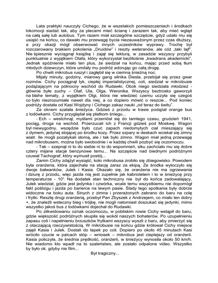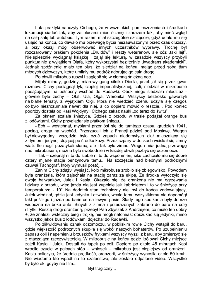 Lata praktyki nauczyły Cichego, Ŝe w wszelakich pomieszczeniach i środkach lokomocji siadać tak, aby za plecami mieć ścianę i zarazem tak, aby mieć wgląd na całą salę lub autobus. Tym razem miał szczególne szczęście, gdyŜ udało mu się usiąść na końcu, co dawało mu przewagę bycia niezauwaŜonym przez czas dłuŜszy, a przy okazji mógł obserwować innych uczestników wyprawy. Trochę był rozczarowany brakiem pokolenia „Druidów” i reszty weteranów, ale cóŜ „taki lajf”. Nie śpiesznie wyciągnął ksiąŜkę i zajął się lekturą, w zasadzie wszyscy przybyli punktualnie z wyjątkiem Olafa, który wykorzystał bezlitośnie „kwadrans akademicki”. Jednak spóźnienie miało ten plus, Ŝe siedział na końcu, mając przed sobą tłum młodych dziewczyn, które umilały mu podróŜ adorując go całą drogę. Po chwili mikrobus ruszył i zagłębił się w ciemną śnieŜną noc. Mijały minuty, godziny, miarowy gang silnika Diesla, przebijał się przez gwar rozmów. Cichy pociągnął łyk, ciepłej imperialistycznej, coli, siedział w mikrobusie podąŜającym na północny wschód do Rudawki. Obok niego siedziała młodzieŜ głównie byłe zuchy – Olaf, Ula, Olga, Weronika. Wszyscy beztrosko gaworzyli na błahe tematy, z wyjątkiem Olgi, która nie wiedzieć czemu uczyła się czegoś co było niezrozumiałe nawet dla niej, a co dopiero mówić o reszcie... Pod koniec podróŜy dostała od Kasi Wojdyny i Cichego zakaz nauki „od teraz do świtu”. Za oknem szalała śnieŜyca. Gdzieś z przodu w trasie podąŜał orange bus z lodówkami. Cichy przyglądał się płatkom śniegu... - Ech – westchnął, myślami przeniósł się do tamtego czasu, grudzień 1941, pociąg, droga na wschód. Przerzucali ich z Francji gdzieś pod Moskwę. Wagon był niewygodny, wszędzie było czuć zapach niedomytych ciał mieszający się z dymem, jedynej stojącej po środku kozy. Przez szpary w deskach wciskał się zimny wiatr. Ile mogli pozatykali słomą, ale i tak było zimno. Wagon miał jedną przewagę nad mikrobusem, moŜna było swobodnie i w kaŜdej chwili pozbyć się oczomoczu. - Tak – szepnął ni to do siebie ni to do wspomnień, siku zachciało mu się dobre cztery mijane stacje benzynowe temu... Na szczęście nad biednymi podróŜnymi czuwał Tachograf, który wymusił postój... Zanim Cichy zdąŜył wysiąść, koło mikrobusa zrobiło się zbiegowisko. Powodem była oranŜeria, która zajechała na stację zaraz za ekipą. Ze środka wytoczyło się dwoje bałwanków, Julek i Kasia. Okazało się, Ŝe oranŜeria nie ma ogrzewania i dziurę z przodu, więc jazda nią jest zupełnie jak kabrioletem i to w śnieŜycę przy temperaturze - 10°. Na dodatek stan techniczny nie był do końca zadowalający, Julek wiedział, gdzie jest jedynka i czwórka, wcale temu wszystkiemu nie dopomógł fakt poślizgu i jazda po barierce na lewym pasie. Ślady tego spotkania były dobrze widoczne na boku auta. Sinych z zimna i przeraŜonych zabrano do baru na colę i frytki. Resztę drogi oranŜerią, przebył Pan Zbyszek z Andrzejem, co miało ten dobry +, Ŝe znaleźli wsteczny bieg i trójkę, nie mogli natomiast doszukać się jedynki, mimo wszystko jakoś bus z lodówkami dojechał do Rudawki. Po zlikwidowaniu oznak oczomoczu, w pobliskim rowie Cichy wstąpił do baru, gdzie większość podróŜnych skupiła się wokół naszych bohaterów. Po uzupełnieniu zapasu coli i napełnieniu brzuszków frytkami wszyscy wyszli z baru, aby zmierzyć się z otaczającą rzeczywistością. W mikrobusie na końcu gdzie królował Cichy miejsce zajęli Kasia i Julek. Dostali do łapek po coli. Dopiero po około 45 minutach Kasi wróciło czucie w palcach stóp – wniosek – mikrobus jest cieplejszy od oranŜerii. Kasia policzyła, Ŝe średnia prędkość, oranŜerii, w śnieŜycy wynosiła około 50 km/h. Nie wiadomo kto wpadł na to szaleństwo, ale zostało odpalone video. Wszystko by było ok. gdyby nie film... Był tragiczny... Kevin Costner w roli listonosza ratującego USA... Film miał jeden plus. MoŜna było przysnąć i po obudzeniu oglądać bez stresu dalej, bo fabuła była tak płytka, Ŝe nic właściwie się nie zmieniało i poszczególne (przespane) sceny nie miały wpływu na ciągłość akcji. Cichy szybko doszedł do wniosku, Ŝe migające w świetle reflektorów, płatki śniegu maja większy sens. Zastanawiał się nad tym, Ŝe kaŜdy płatek ma swój niepowtarzalny kształt, ale czy kaŜdej zimy pada jeden zestaw płatków i co roku się powtarza, czy za kaŜdym razem pada inny zestaw... Do szkoły w Rudawce dotarliśmy około północy. Wiedzeni przeczuciem Cichy, Kasia i Julek nie pchali się zbytnio do sal. Szybko okazało się, Ŝe przeczucie ich nie myliło, Druh Jarek stojąc w progu szybko i sprawnie rozparcelował nas po pokojach. Jego zamysł został delikatnie zmodyfikowany i Kasia zamiast z paniami nauczycielkami, wylądowała w pokoju z Pawłem, Julką, Pelem, Cichym, Kasią i Marcinem. Po wykonaniu szybkiego rozpoznania okazało się, Ŝe kolacja zrobiona przez Druha (bądź na polecenie Druha1), faktycznie jest, tylko trzeba się wysilić i przemieścić się do kuchni w innym mieszkanku. Cichy szybko napełnił brzuch i wziął jeszcze ze trzy kanapki w kieszeń na zapas. Gdy większość, po dokonaniu wieczornej czynności mycia, skierowała się spać, Cichy, Pele, Kasia, i Julek zajęli się grą w Scrabble, która trwała do około 2 w nocy. Grali w kuchni, bo w ich pokoju Paweł czytał Julce do snu bajkę o Panu Mrówce... (kimkolwiek był Pan Mrówka, bajka stanowczo nie nadawała się dla dorosłych...). Po powrocie do pokoju, w/w starali się nikogo nie zbudzić. W zasadzie plan by się powiódł, gdyby nie maleńka mysz... Kasia, choć to odwaŜna dziewczyna, narobiła hurgotu, błyskała latarką i właściwie co tu się rozpisywać... Cichy humanitarnie zamienił się z nią na miejsca snu. Tzn. Kasia spała na