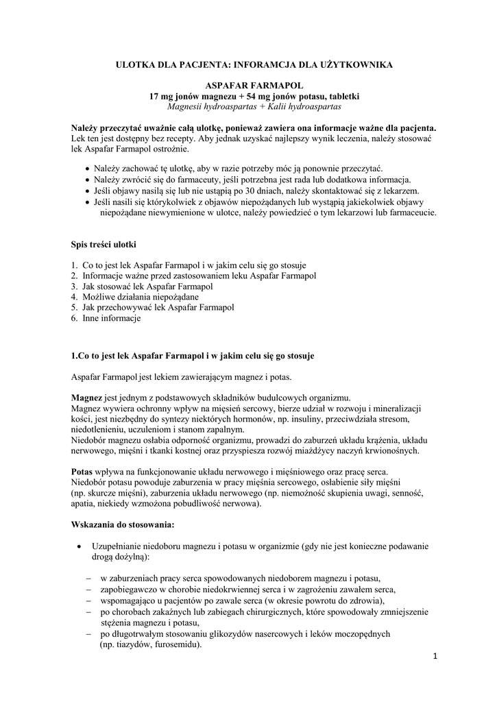 ULOTKA DLA PACJENTA: INFORAMCJA DLA UŻYTKOWNIKA ASPAFAR FARMAPOL 17 mg jonów magnezu + 54 mg jonów potasu, tabletki Magnesii hydroaspartas + Kalii hydroaspartas Należy przeczytać uważnie całą ulotkę, ponieważ zawiera ona informacje ważne dla pacjenta. Lek ten jest dostępny bez recepty. Aby jednak uzyskać najlepszy wynik leczenia, należy stosować lek Aspafar Farmapol ostrożnie. Należy zachować tę ulotkę, aby w razie potrzeby móc ją ponownie przeczytać. Należy zwrócić się do farmaceuty, jeśli potrzebna jest rada lub dodatkowa informacja. Jeśli objawy nasilą się lub nie ustąpią po 30 dniach, należy skontaktować się z lekarzem. Jeśli nasili się którykolwiek z objawów niepożądanych lub wystąpią jakiekolwiek objawy niepożądane niewymienione w ulotce, należy powiedzieć o tym lekarzowi lub farmaceucie. Spis treści ulotki 1. 2. 3. 4. 5. 6. Co to jest lek Aspafar Farmapol i w jakim celu się go stosuje Informacje ważne przed zastosowaniem leku Aspafar Farmapol Jak stosować lek Aspafar Farmapol Możliwe działania niepożądane Jak przechowywać lek Aspafar Farmapol Inne informacje 1.Co to jest lek Aspafar Farmapol i w jakim celu się go stosuje Aspafar Farmapol jest lekiem zawierającym magnez i potas. Magnez jest jednym z podstawowych składników budulcowych organizmu. Magnez wywiera ochronny wpływ na mięsień sercowy, bierze udział w rozwoju i mineralizacji kości, jest niezbędny do syntezy niektórych hormonów, np. insuliny, przeciwdziała stresom, niedotlenieniu, uczuleniom i stanom zapalnym. Niedobór magnezu osłabia odporność organizmu, prowadzi do zaburzeń układu krążenia, układu nerwowego, mięśni i tkanki kostnej oraz przyspiesza rozwój miażdżycy naczyń krwionośnych. Potas wpływa na funkcjonowanie układu nerwowego i mięśniowego oraz pracę serca. Niedobór potasu powoduje zaburzenia w pracy mięśnia sercowego, osłabienie siły mięśni (np. skurcze mięśni), zaburzenia układu nerwowego (np. niemożność skupienia uwagi, senność, apatia, niekiedy wzmożona pobudliwość nerwowa). Wskazania do stosowania: Uzupełnianie niedoboru magnezu i potasu w organizmie (gdy nie jest konieczne podawanie drogą dożylną): w zaburzeniach pracy serca spowodowanych niedoborem magnezu i potasu, zapobiegawczo w chorobie niedokrwiennej serca i w zagrożeniu zawałem serca, wspomagająco u pacjentów po zawale serca (w okresie powrotu do zdrowia), po chorobach zakaźnych lub zabiegach chirurgicznych, które spowodowały zmniejszenie stężenia magnezu i potasu, po długotrwałym stosowaniu glikozydów nasercowych i leków moczopędnych (np. tiazydów, furosemidu). 1 2. Informacje ważne przed zastosowaniem leku Aspafar Farmapol Kiedy nie stosować leku Aspafar Farmapol Jeśli pacjent ma uczulenie (nadwrażliwość) na substancje czynne lub którykolwiek z pozostałych składników leku (patrz punkt 6: Inne informacje). Jeśli pacjent ma ciężką niewydolność nerek. Jeśli pacjent ma zakażenia dróg moczowych (pęcherza moczowego, nerek). Jeśli pacjent ma zwiększone stężenie potasu we krwi. Jeśli pacjent ma zwiększone stężenie magnezu we krwi. Jeśli pacjent ma zaburzenia pracy serca (uczucie zbyt wolnego, szybkiego lub nierównego bicia serca). Jeśli pacjent ma myasthenia gravis (rzadka choroba objawiająca się nadmiernym osłabieniem mięśni). Kiedy zachować szczególną ostrożność stosując lek Aspafar Farmapol jeśli pacjent ma chorobę wrzodową żołądka; jeśli lek jest stosowany długo, należy regularnie badać stężenie magnezu i potasu we krwi. Stosowanie innych leków Należy powiedzieć lekarzowi lub farmaceucie o wszystkich przyjmowanych aktualnie lub ostatnio lekach, również tych, które wydawane są bez recepty. Nie należy stosować leku Aspafar Farmapol jednocześnie z następującymi lekami: antybiotykami z grupy tetracyklin, doustnymi lekami przeciwzakrzepowymi pochodnymi hydroksykumaryny (leki te zapobiegają powstawaniu skrzepów we krwi), lekami lub suplementami diety zawierającymi fosforany, wapń i żelazo. Leki te stosowane razem z lekiem Aspafar Farmapol osłabiają wchłanianie leku z przewodu pokarmowego, przez co zmniejszają jego skuteczność. Stosowanie leku Aspafar Farmapol z jedzeniem i piciem Należy ograniczyć stosowanie soli w pożywieniu. Sól zwiększa wydalanie potasu z moczem. Ciąża i karmienie piersią Przed zastosowaniem jakiegokolwiek leku należy poradzić się lekarza lub farmaceuty. Prowadzenie pojazdów i obsługiwanie maszyn Lek nie wpływa na zdolność prowadzenia pojazdów mechanicznych i obsługiwanie urządzeń mechanicznych w ruchu. Ważne informacje o niektórych składnikach leku Aspafar Farmapol Lek zawiera cukier sacharozę. Jedna tabletka zawiera 52,4 mg sacharozy. Należy wziąć to pod uwagę u pacjentów chorych na cukrzycę. Jeżeli stwierdzono wcześniej u pacjenta nietolerancję niektórych cukrów, pacjent powinien skontaktować się z lekarzem przed przyjęciem leku. 2 3. Jak stosować lek Aspafar Farmapol Lek Aspafar Farmapol należy zawsze stosować zgodnie z zaleceniami lekarza. W razie wątpliwości należy skontaktować się z lekarzem lub farmaceutą. Zazwyczaj stosowana dawka, to: Dorośli i młodzież w wieku powyżej 12 lat: 1 do 3 tabletek dwa razy na dobę. Nie należy przyjmować więcej niż 6 tabletek na dobę. Lek należy przyjmować rano i wieczorem po posiłku, popijając wodą. Leku Aspafar Farmapol nie należy stosować u dzieci w wieku poniżej 12 lat. Jeśli dolegliwości nie ustąpią po 30 dniach stosowania leku, należy skontaktować się z lekarzem. Zastosowanie większej niż zaleca dawki leku Aspafar Farmapol W przypadku przyjęcia większej niż zalecana dawki leku, należy niezwłocznie skontaktować się z lekarzem. Jeśli wystąpią poniższe objawy zatrucia, pacjenta należy jak najszybciej przewieźć do szpitala. Objawy zatrucia lekiem Aspafar Farmapol: biegunka, nudności, zaburzenia pracy serca (np. 