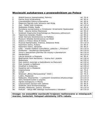 Wycieczki autokarowe z przewodnikiem po Polsce 1. 2. 3. 4. 5. 6. 7. 8. 9. 10. 11. 12. 13. 14. 15. 16. 17. 18. 19. 20. 21. 22. 23. 24. 25. 26. 27. 28. 29. 30. 31. 32. 33. 34. 35. 36. 37. 38. Wokół Puszczy Kampinoskiej, Palmiry Farma Iluzji k/Garwolina Czarodziejska Dolina k/Garwolina Magiczne Ogrody koło Janowca nad Wisłą Zoo – Safari koło Uniejowa Niebieskie Źródła, Spała Porcelana wyczarowana w Ćmielowie i Krzemionki Opatowskie Płock – dawna stolica Mazowsza Szlakiem Zygmunta Krasińskiego po Mazowszu północnym Tajemnice twierdzy Modlin Szlak Henryka Sienkiewicza na Podlasiu Muzeum Witolda Gombrowicza we Wsoli Jedyny w Polsce obraz El Greco Puszcza Kampinoska, Granica, Żelazowa Wola Kazimierz Dolny, Puławy Kazimierz Dolny, Janowiec Łódź – miasto wielkich manufaktur, pałaców i „Filmówki” Kozłówka – rezydencja Zamoyskich Toruń z pieczeniem piernika lub wizytą w planetarium Sandomierz Lekcja botaniki w Rogowie Biebrzański Park Narodowy – kraina łosi i ptaków Białowieża Park dzikich zwierząt w Kadzidłowie na Mazurach Park Jurajski w Bałtowie DinoPark w Kołacinku Kopalnia soli w Kłodawie Częstochowa Licheń Szlakiem „Bitwy Warszawskiej” 1920 r. Lublin, Majdanek Nałęczów, Wojciechów – z pokazem kowalstwa artystycznego Góry Świętokrzyskie w pigułce Ogród zoologiczny w Płocku Leszczynowe Zacisze koło Jadowa Szlakiem Jana Kochanowskiego Arkadia, Nieborów, Łowicz, Sromów Pułtusk – lekcja ABC dobrego wychowania z obiadem od od od od od od od od od od od od od od od od od od od od od od od od od od od od od od od od od od od od od od 70 zł 90 zł 90 zł 90 zł 110 zł 80 zł 110 zł 90 zł 90 zł 90 zł 90 zł 90 zł 90 zł 110 zł 90 zł 90 zł 110 zł 110 zł 110 zł 110 zł 90 zł 120 zł 120 zł 120 zł 120 zł 120 zł 120 zł 70 zł 70 zł 70 zł 110 zł 110 zł 110 zł 90 zł 90 zł 90 zł 110 zł 110 zł Uwaga: na wszystkie wycieczki krajowe realizowane w miesiącach marzec, kwiecień, listopad udzielamy 10% rabatu Szczegółowe programy: 1. Wokół Puszczy Kampinoskiej, Palmiry Palmiry – Cmentarz Ofiar II Wojny Światowej, Muzeum, Roztoka – spacer ścieżką przyrodniczą do stanowisk rzadkich roślin i żeremi bobrów, aktywny wypoczynek na polanie - gry i zabawy na świeżym powietrzu, możliwość organizacji ogniska z pieczeniem kiełbasek. Il. uczniów Cena/os. 20-29 90 zł 30-39 80 zł 40-45 70 zł Uwaga: w cenie wycieczki koszty transportu, usługi przewodnika terenowego i pilotarskie, niezbędne rezerwacje, koszty zwiedzania muzeum w Palmirach, ubezpieczenie NNW. Maksymalna ilość uczniów i opiekunów w autokarze – 49 osób. Czas trwania wycieczki – do 8 godz. 2. Farma Iluzji koło Garwolina Wizyta w Farmie Iluzji – miejscu gdzie dominuje przygoda w świecie magii i iluzji. Zobaczymy Muzeum Iluzji, Latającą Chatę, Lewitujące piłeczki, Studnię nieskończoności, Niemożliwy trójkąt, Ścieżkę Złudzeń, Czarodziejską Kulę, Lewitujący Kran, Magiczny Domek, Świat w skali makro: Krzesło Olbrzyma, Gnoma Carlosa, Kubek z Kredkami, Giga-Szachy oraz Wiklinowy labirynt, Zatokę Piratów, Drewniany Plac Zabaw i inne atrakcje. Możliwe zorganizowanie ogniska z pieczeniem kiełbasek. Il. uczniów Cena/os. 20-29 120 zł 30-39 105 zł 40-45 90 zł Uwaga: w cenie wycieczki koszty transportu, usługi pilotarskie, niezbędne rezerwacje, koszty wstępów do Farmy Iluzji (pakiet podstawowy), ubezpieczenie NNW. Maksymalna ilość uczniów i opiekunów w autokarze – 49 osób. Czas trwania wycieczki – do 10 godz. 3. Czarodziejska Dolina koło Garwolina Wizyta w Rodzinnym Parku Rozrywki Czarodziejska Dolina – miejscu gdzie dominuje rozrywka z elementami sportu i nauki, magia i świat baśniowy. Zobaczymy „Zaklęty Ogród”, „Dwór Czarodziejskich Wróżek”, „Tabor Czarodzieja” i „Nawiedzoną Stację”, „Dolinę Dmuchańców”, „Krainę Ślepych Zaułków”, „Obóz Zbójcerzy”, „Dolinę Smoków” oraz sale warsztatowe i salę zabaw. Możliwe zorganizowanie ogniska z pieczeniem kiełbasek. Il. uczniów Cena/os. 20-29 120 zł 30-39 105 zł 40-45 90 zł Uwaga: w cenie wycieczki koszty transportu, usługi pilotarskie, niezbędne rezerwacje, koszty wstępów do Czarodziejskiej Doliny (pakiet podstawowy), ubezpieczenie NNW. Maksymalna ilość uczniów i opiekunów w autokarze – 49 osób. Czas trwania wycieczki – do 10 godz. 4. Magiczne Ogrody koło Janowca nad Wisłą Wizyta w Magicznych Ogrodach z tajemniczymi baśniowymi postaciami. Ogrody podzielone są na sektory tematyczne m.in.: Dom Czarodzieja, Marchewkowe Pole, Robankowe Wzgórze, Bulwiakowa Osada, Wodny Świat, Smocze Gniazdo, Krasnoludzki Gród i Mroczysko Il. uczniów Cena/os. 20-29 120 zł 30-39 105 zł 40-45 90 zł Uwaga: w cenie wycieczki koszty transportu, usługi pilotarskie, niezbędne rezerwacje, koszty wstępów do Magicznych Ogrodów, ubezpieczenie NNW. Maksymalna ilość uczniów i opiekunów w autokarze – 49 osób. Czas trwania wycieczki – do 10 godz. 5. Zoo – Safari koło Uniejowa obejrzenie z przewodnikiem Zoo Safari gdzie na powierzchni 22 ha zgromadzono ponad 250 zwierząt reprezentujących 60 gatunków z 5 kontynentów (są to m.in. białe lwy, tygrysy, alpaki, zebu, bawoły, osły, tapir, koziorożec markur, zebry, małpy, kangury, wielbłądy, fokę). Zwiedzanie podstawowe trwa ok. 2,5 godz. Możliwe dodatkowe atrakcje: dzieci mogą pojeździć na kucyku szetlandzkim oraz „poszaleć” w figlarni, zaś dorośli mogą pojeździć na wielbłądzie. Il. uczniów Cena/os. 20-29 170 zł 30-39 135 zł 40-45 110 zł Uwaga: w cenie wycieczki koszty transportu, usługi pilotarskie i przewodnickie, niezbędne rezerwacje, koszty wstępu do ogrodu zoologicznego (bilet podstawowy), ubezpieczenie NNW. Maksymalna ilość uczniów i opiekunów w autokarze – 49 osób. Czas trwania wycieczki – do 8 godz. 6. Niebieskie Źródła, Spała, Konewka Tomaszów Mazowiecki - słynny rezerwat „Niebieskie Źród