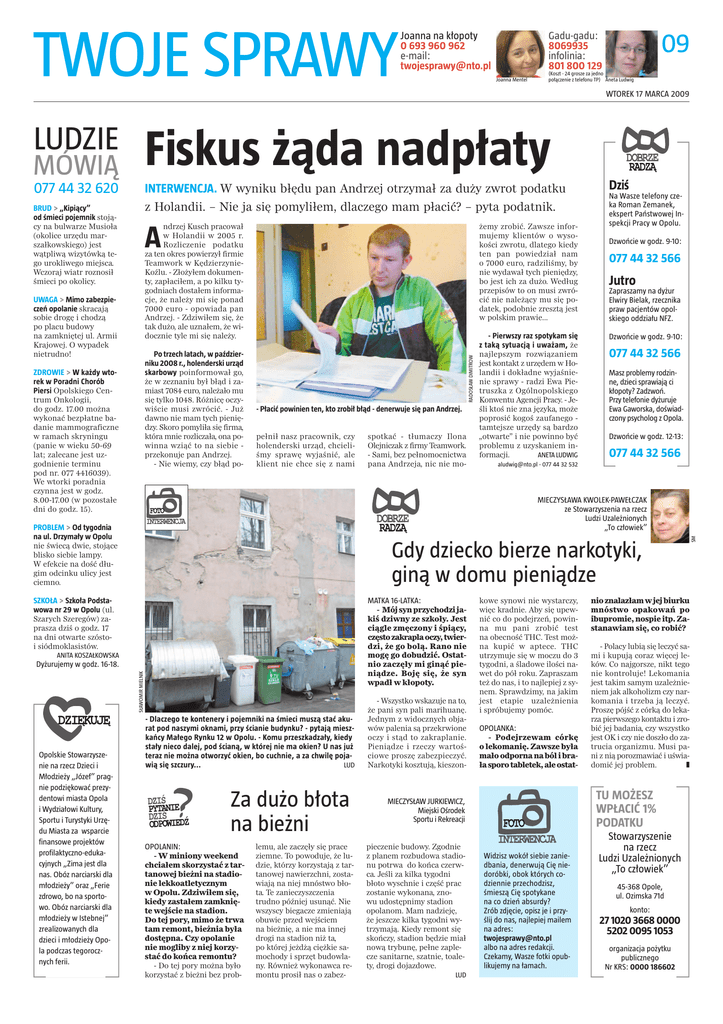 TWOJE SPRAWY Joanna na kłopoty 0 693 960 962 e-mail: [email protected] Gadu-gadu: 8069935 infolinia: 801 800 129 Joanna Mentel 09 (Koszt - 24 grosze za jedno połączenie z telefonu TP) Aneta Ludwig WTOREK 17 MARCA 2009 LUDZIE Fiskus żąda nadpłaty 077 44 32 620 INTERWENCJA. W wyniku błędu pan Andrzej otrzymał za duży zwrot podatku z Holandii. – Nie ja się pomyliłem, dlaczego mam płacić? – pyta podatnik. MÓWIĄ BRUD > „Kipiący” od śmieci pojemnik stojący na bulwarze Musioła (okolice urzędu marszałkowskiego) jest wątpliwą wizytówką tego urokliwego miejsca. Wczoraj wiatr roznosił śmieci po okolicy. ndrzej Kusch pracował w Holandii w 2005 r. Rozliczenie podatku za ten okres powierzył firmie Teamwork w KędzierzynieKoźlu. - Złożyłem dokumenty, zapłaciłem, a po kilku tygodniach dostałem informacje, że należy mi się ponad 7000 euro - opowiada pan Andrzej. - Zdziwiłem się, że tak dużo, ale uznałem, że widocznie tyle mi się należy. żemy zrobić. Zawsze informujemy klientów o wysokości zwrotu, dlatego kiedy ten pan powiedział nam o 7000 euro, radziliśmy, by nie wydawał tych pieniędzy, bo jest ich za dużo. Według przepisów to on musi zwrócić nie należący mu się podatek, podobnie zresztą jest w polskim prawie... UWAGA > Mimo zabezpieczeń opolanie skracają sobie drogę i chodzą po placu budowy na zamkniętej ul. Armii Krajowej. O wypadek nietrudno! Po trzech latach, w październiku 2008 r., holenderski urząd skarbowy poinformował go, że w zeznaniu był błąd i zamiast 7084 euro, należało mu się tylko 1048. Różnicę oczywiście musi zwrócić. - Już dawno nie mam tych pieniędzy. Skoro pomyliła się firma, która mnie rozliczała, ona powinna wziąć to na siebie przekonuje pan Andrzej. - Nie wiemy, czy błąd po- ZDROWIE > W każdy wtorek w Poradni Chorób Piersi Opolskiego Centrum Onkologii, do godz. 17.00 można wykonać bezpłatne badanie mammograficzne w ramach skryningu (panie w wieku 50-69 lat; zalecane jest uzgodnienie terminu pod nr. 077 4416039). We wtorki poradnia czynna jest w godz. 8.00-17.00 (w pozostałe dni do godz. 15). RADOSŁAW DIMITROW A - Płacić powinien ten, kto zrobił błąd - denerwuje się pan Andrzej. pełnił nasz pracownik, czy holenderski urząd, chcieliśmy sprawę wyjaśnić, ale klient nie chce się z nami Na Wasze telefony czeka Roman Zemanek, ekspert Państwowej Inspekcji Pracy w Opolu. Dzwońcie w godz. 9-10: 077 44 32 566 Jutro Zapraszamy na dyżur Elwiry Bielak, rzecznika praw pacjentów opolskiego oddziału NFZ. Dzwońcie w godz. 9-10: 077 44 32 566 Masz problemy rodzinne, dzieci sprawiają ci kłopoty? Zadzwoń. Przy telefonie dyżuruje Ewa Gaworska, doświadczony psycholog z Opola. Dzwońcie w godz. 12-13: 077 44 32 566 [email protected] - 077 44 32 532 Gdy dziecko bierze narkotyki, giną w domu pieniądze MATKA 16-LATKA: - Mój syn przychodzi jakiś dziwny ze szkoły. Jest ciągle zmęczony i śpiący, często zakrapla oczy, twierdzi, że go bolą. Rano nie mogę go dobudzić. Ostatnio zaczęły mi ginąć pieniądze. Boję się, że syn wpadł w kłopoty. SZKOŁA > Szkoła Podstawowa nr 29 w Opolu (ul. Szarych Szeregów) zaprasza dziś o godz. 17 na dni otwarte szóstoi siódmoklasistów. ANITA KOSZAŁKOWSKA SŁAWOMIR MIELNIK Dyżurujemy w godz. 16-18. - Dlaczego te kontenery i pojemniki na śmieci muszą stać akurat pod naszymi oknami, przy ścianie budynku? - pytają mieszkańcy Małego Rynku 12 w Opolu. - Komu przeszkadzały, kiedy stały nieco dalej, pod ścianą, w której nie ma okien? U nas już teraz nie można otworzyć okien, bo cuchnie, a za chwilę pojaLUD wią się szczury... Za dużo błota na bieżni OPOLANIN: - W miniony weekend chciałem skorzystać z tartanowej bieżni na stadionie lekkoatletycznym w Opolu. Zdziwiłem się, kiedy zastałem zamknięte wejście na stadion. Do tej pory, mimo że trwa tam remont, bieżnia była dostępna. Czy opolanie nie mogliby z niej korzystać do końca remontu? - Do tej pory można było korzystać z bieżni bez prob- lemu, ale zaczęły się prace ziemne. To powoduje, że ludzie, którzy korzystają z tartanowej nawierzchni, zostawiają na niej mnóstwo błota. Te zanieczyszczenia trudno później usunąć. Nie wszyscy biegacze zmieniają obuwie przed wejściem na bieżnię, a nie ma innej drogi na stadion niż ta, po której jeżdżą ciężkie samochody i sprzęt budowlany. Również wykonawca remontu prosił nas o zabez- - Wszystko wskazuje na to, że pani syn pali marihuanę. Jednym z widocznych objawów palenia są przekrwione oczy i stąd to zakraplanie. Pieniądze i rzeczy wartościowe proszę zabezpieczyć. Narkotyki kosztują, kieszon- kowe synowi nie wystarczy, więc kradnie. Aby się upewnić co do podejrzeń, powinna mu pani zrobić test na obecność THC. Test można kupić w aptece. THC utrzymuje się w moczu do 3 tygodni, a śladowe ilości nawet do pół roku. Zapraszam też do nas, i to najlepiej z synem. Sprawdzimy, na jakim jest etapie uzależnienia i spróbujemy pomóc. OPOLANKA: - Podejrzewam córkę o lekomanię. Zawsze była mało odporna na ból i brała sporo tabletek, ale ostat- LUD - Polacy lubią się leczyć sami i kupują coraz więcej leków. Co najgorsze, nikt tego nie kontroluje! Lekomania jest takim samym uzależnieniem jak alkoholizm czy narkomania i trzeba ją leczyć. Proszę pójść z córką do lekarza pierwszego kontaktu i zrobić jej badania, czy wszystko jest OK i czy nie doszło do zatrucia organizmu. Musi pani z nią porozmawiać i uświadomić jej problem. ❚ TU MOŻESZ WPŁACIĆ 1% PODATKU MIECZYSŁAW JURKIEWICZ, Miejski Ośrodek Sportu i Rekreacji pieczenie budowy. Zgodnie z planem rozbudowa stadionu potrwa do końca czerwca. Jeśli za kilka tygodni błoto wyschnie i część prac zostanie wykonana, znowu udostępnimy stadion opolanom. Mam nadzieję, że jeszcze kilka tygodni wytrzymają. Kiedy remont się skończy, stadion będzie miał nową trybunę, pełne zaplecze sani