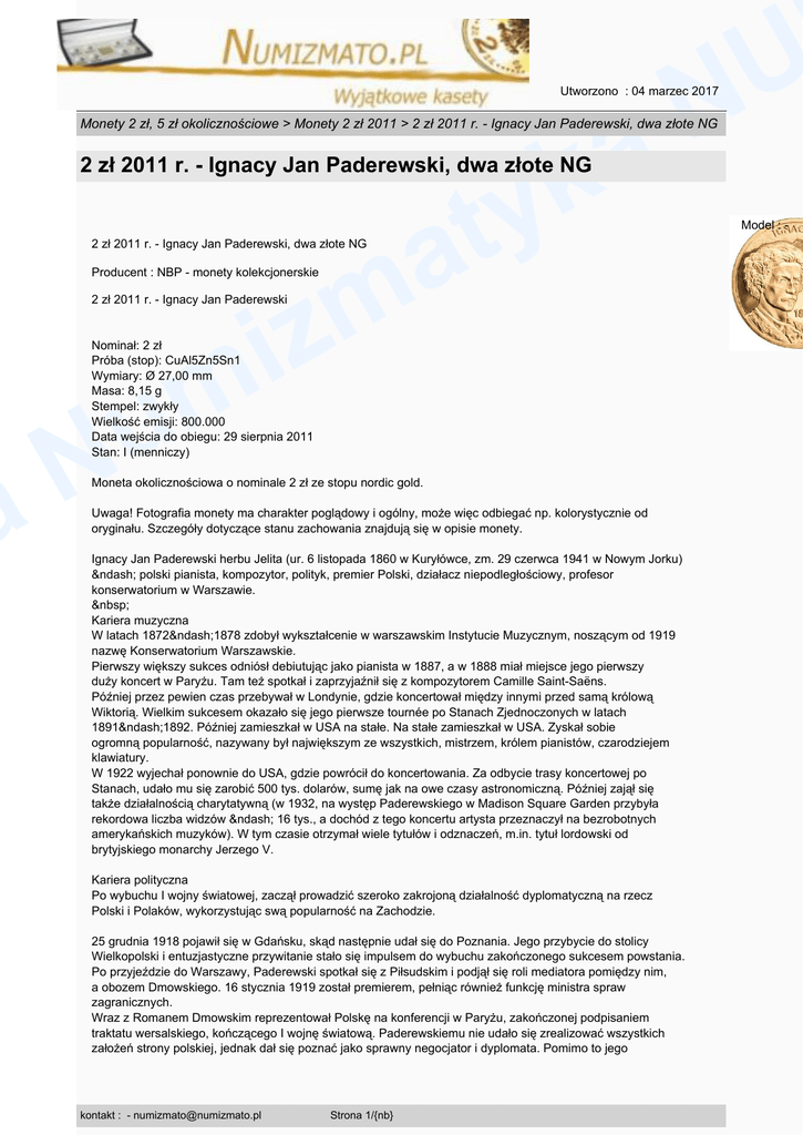 U N Utworzono : 04 marzec 2017 a k Monety 2 zł, 5 zł okolicznościowe > Monety 2 zł 2011 > 2 zł 2011 r. - Ignacy Jan Paderewski, dwa złote NG y t a 2 zł 2011 r. - Ignacy Jan Paderewski, dwa złote NG 2 zł 2011 r. - Ignacy Jan Paderewski, dwa złote NG m z i m u Producent : NBP - monety kolekcjonerskie 2 zł 2011 r. - Ignacy Jan Paderewski Nominał: 2 zł Próba (stop): CuAl5Zn5Sn1 Wymiary: Ø 27,00 mm Masa: 8,15 g Stempel: zwykły Wielkość emisji: 800.000 Data wejścia do obiegu: 29 sierpnia 2011 Stan: I (menniczy) N a Moneta okolicznościowa o nominale 2 zł ze stopu nordic gold. Uwaga! Fotografia monety ma charakter poglądowy i ogólny, może więc odbiegać np. kolorystycznie od oryginału. Szczegóły dotyczące stanu zachowania znajdują się w opisie monety. Ignacy Jan Paderewski herbu Jelita (ur. 6 listopada 1860 w Kuryłówce, zm. 29 czerwca 1941 w Nowym Jorku) – polski pianista, kompozytor, polityk, premier Polski, działacz niepodległościowy, profesor konserwatorium w Warszawie. Kariera muzyczna W latach 1872–1878 zdobył wykształcenie w warszawskim Instytucie Muzycznym, noszącym od 1919 nazwę Konserwatorium Warszawskie. Pierwszy większy sukces odniósł debiutując jako pianista w 1887, a w 1888 miał miejsce jego pierwszy duży koncert w Paryżu. Tam też spotkał i zaprzyjaźnił się z kompozytorem Camille Saint-Saëns. Później przez pewien czas przebywał w Londynie, gdzie koncertował między innymi przed samą królową Wiktorią. Wielkim sukcesem okazało się jego pierwsze tournée po Stanach Zjednoczonych w latach 1891–1892. Później zamieszkał w USA na stałe. Na stałe zamieszkał w USA. Zyskał sobie ogromną popularność, nazywany był największym ze wszystkich, mistrzem, królem pianistów, czarodziejem klawiatury. W 1922 wyjechał ponownie do USA, gdzie powrócił do koncertowania. Za odbycie trasy koncertowej po Stanach, udało mu się zarobić 500 tys. dolarów, sumę jak na owe czasy astronomiczną. Później zajął się także działalnością charytatywną (w 1932, na występ Paderewskiego w Madison Square Garden przybyła rekordowa liczba widzów – 16 tys., a dochód z tego koncertu artysta przeznaczył na bezrobotnych amerykańskich muzyków). W tym czasie otrzymał wiele tytułów i odznaczeń, m.in. tytuł lordowski od brytyjskiego monarchy Jerzego V. Kariera polityczna Po wybuchu I wojny światowej, zaczął prowadzić szeroko zakrojoną działalność dyplomatyczną na rzecz Polski i Polaków, wykorzystując swą popularność na Zachodzie. 25 grudnia 1918 pojawił się w Gdańsku, skąd następnie udał się do Poznania. Jego przybycie do stolicy Wielkopolski i entuzjastyczne przywitanie stało się impulsem do wybuchu zakończonego sukcesem powstania. Po przyjeździe do Warszawy, Paderewski spotkał się z Piłsudskim i podjął się roli mediatora pomiędzy nim, a obozem Dmowskiego. 16 stycznia 1919 został premierem, pełniąc również funkcję ministra spraw zagranicznych. Wraz z Romanem Dmowskim reprezentował Polskę na konferencji w Paryżu, zakończonej podpisaniem traktatu wersalskiego, kończącego I wojnę światową. Paderewskiemu nie udało się zrealizować wszystkich założeń strony polskiej, jednak dał się poznać jako sprawny negocjator i dyplomata. Pomimo to jego kontakt : - [email protected] Strona 1/{nb} Model : - U N Utworzono : 04 marzec 2017 a k Monety 2 zł, 5 zł okolicznościowe > Monety 2 zł 2011 > 2 zł 2011 r. - Ignacy Jan Paderewski, dwa złote NG y t a 2 zł 2011 r. - Ignacy Jan Paderewski, dwa złote NG bezpartyjny rząd był krytykowany w kraju zarówno przez lewicę, jak i prawicę. Paderewski wiedział, iż jego gabinet ma charakter tylko i wyłącznie przejściowy, dlatego w grudniu 1919 podał się do dymisji. W 1921 r. wysłannikiem rządu polskiego do Ligi Narodów. Po śmierci Piłsudskiego w 1935, Paderewski współtworzył tzw. Front Morges. Organizacja ta, opozycyjnie nastawiona wobec polskiego reżimu autorytarnego, miała charakter centroprawicowy, a jednym z jej głównych założycieli był generał Władysław Sikorski. Front Morges domagał się demokratyzacji życia politycznego w kraju, ale również postulował wybór Paderewskiego na prezydenta Polski. Po wybuchu II wojny światowej, Paderewski wszedł w skład władz Polski na uchodźstwie. Został przewodniczącym Rady Narodowej Rzeczypospolitej Polskiej w Londynie, która stanowiła substytut Sejmu na emigracji. W 1940 wyjechał ponownie do USA, aby tam znów prowadzić działalność niepodległościową. W 1940, mimo podupadającego zdrowia, udał się raz jeszcze do USA, by działać na rzecz Polski. Spowodował między innymi uzyskanie przez rząd Sikorskiego kredytów na uzbrojenie polskich sił zbrojnych na Zachodzie. (wg Wikipedii) m z i m u N a Cena : 4,00 zł Brutto ( 4,00 zł Netto) Dostępność: Produkt dostępny w naszym sklepie od 04 luty 2011 kontakt : - [email protected] Strona 2/{nb}
