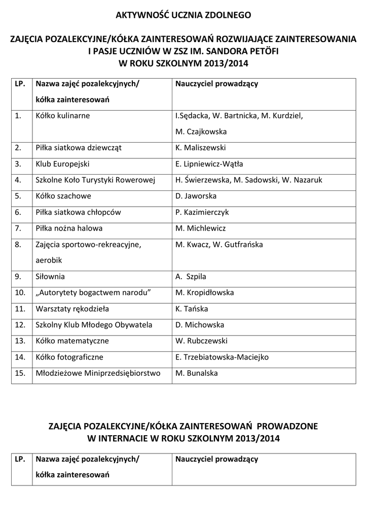 AKTYWNOŚĆ UCZNIA ZDOLNEGO ZAJĘCIA POZALEKCYJNE/KÓŁKA ZAINTERESOWAŃ ROZWIJAJĄCE ZAINTERESOWANIA I PASJE UCZNIÓW W ZSZ IM. SANDORA PETÖFI W ROKU SZKOLNYM 2013/2014 LP. Nazwa zajęć pozalekcyjnych/ Nauczyciel prowadzący kółka zainteresowań 1. Kółko kulinarne I.Sędacka, W. Bartnicka, M. Kurdziel, M. Czajkowska 2. Piłka siatkowa dziewcząt K. Maliszewski 3. Klub Europejski E. Lipniewicz-Wątła 4. Szkolne Koło Turystyki Rowerowej H. Świerzewska, M. Sadowski, W. Nazaruk 5. Kółko szachowe D. Jaworska 6. Piłka siatkowa chłopców P. Kazimierczyk 7. Piłka nożna halowa M. Michlewicz 8. Zajęcia sportowo-rekreacyjne, M. Kwacz, W. Gutfrańska aerobik 9. Siłownia A. Szpila 10. „Autorytety bogactwem narodu” M. Kropidłowska 11. Warsztaty rękodzieła K. Tańska 12. Szkolny Klub Młodego Obywatela D. Michowska 13. Kółko matematyczne W. Rubczewski 14. Kółko fotograficzne E. Trzebiatowska-Maciejko 15. Młodzieżowe Miniprzedsiębiorstwo M. Bunalska ZAJĘCIA POZALEKCYJNE/KÓŁKA ZAINTERESOWAŃ PROWADZONE W INTERNACIE W ROKU SZKOLNYM 2013/2014 LP. Nazwa zajęć pozalekcyjnych/ kółka zainteresowań Nauczyciel prowadzący 1. Klub Ośmiu Młodzieżowego A. Odolińska, A. Sposób Wolontariatu 2. Poznajemy miasto Ostróda A. Sposób 3. Zajęcia decoupage E. Meyer, A. Krezymon, A. Odolińska, D.Muchowska 4. Zajęcia na sali gimnastycznej – piłka A. Kołodziejska nożna, piłka siatkowa 5. Zajęcia fitness dziewcząt U. Piasecka 6. Zajęcia na siłowni P. Zwaliński 7. Zajęcia kulinarne A. Krezymon 8. Zajęcia rękodzielnicze A. Krezymon 9. Bądź w formie D. Muchowska 10. Zajęcia w sali tenisa stołowego E. Czekil 11. Internacka Grupa Wokalna A. Kołodziejska
