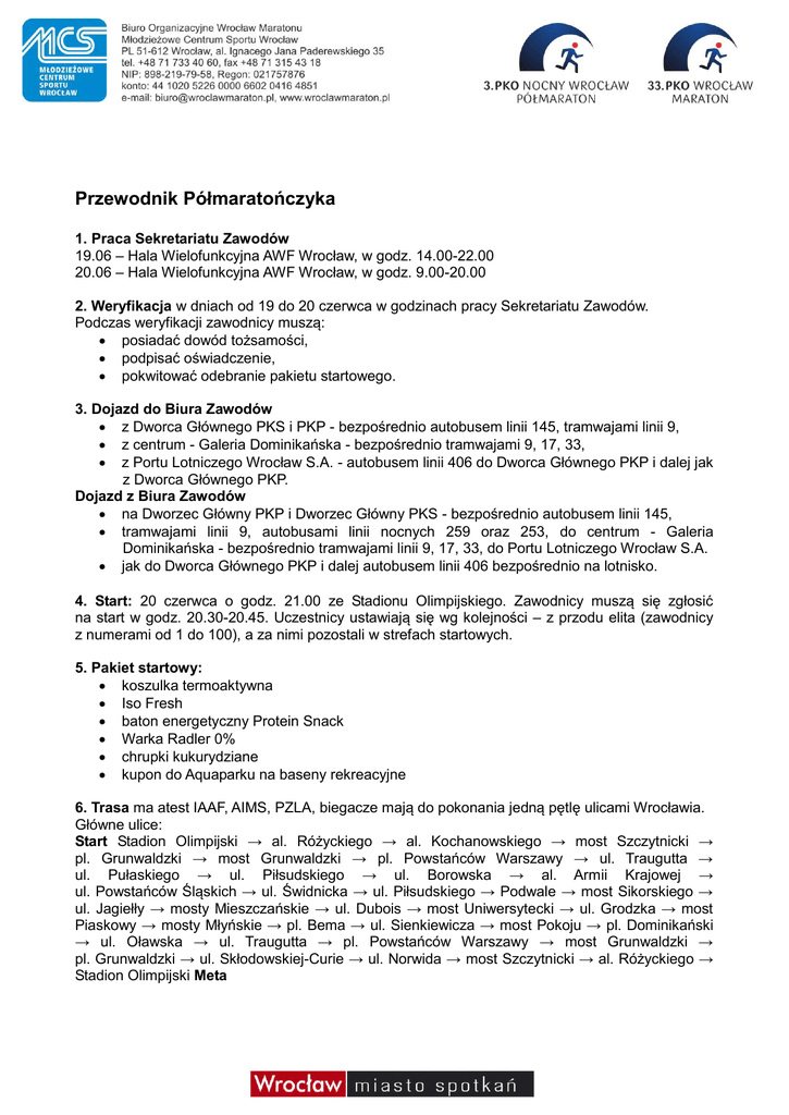 Przewodnik Półmaratończyka 1. Praca Sekretariatu Zawodów 19.06 – Hala Wielofunkcyjna AWF Wrocław, w godz. 14.00-22.00 20.06 – Hala Wielofunkcyjna AWF Wrocław, w godz. 9.00-20.00 2. Weryfikacja w dniach od 19 do 20 czerwca w godzinach pracy Sekretariatu Zawodów. Podczas weryfikacji zawodnicy muszą: posiadać dowód tożsamości, podpisać oświadczenie, pokwitować odebranie pakietu startowego. 3. Dojazd do Biura Zawodów z Dworca Głównego PKS i PKP - bezpośrednio autobusem linii 145, tramwajami linii 9, z centrum - Galeria Dominikańska - bezpośrednio tramwajami 9, 17, 33, z Portu Lotniczego Wrocław S.A. - autobusem linii 406 do Dworca Głównego PKP i dalej jak z Dworca Głównego PKP. Dojazd z Biura Zawodów na Dworzec Główny PKP i Dworzec Główny PKS - bezpośrednio autobusem linii 145, tramwajami linii 9, autobusami linii nocnych 259 oraz 253, do centrum - Galeria Dominikańska - bezpośrednio tramwajami linii 9, 17, 33, do Portu Lotniczego Wrocław S.A. jak do Dworca Głównego PKP i dalej autobusem linii 406 bezpośrednio na lotnisko. 4. Start: 20 czerwca o godz. 21.00 ze Stadionu Olimpijskiego. Zawodnicy muszą się zgłosić na start w godz. 20.30-20.45. Uczestnicy ustawiają się wg kolejności – z przodu elita (zawodnicy z numerami od 1 do 100), a za nimi pozostali w strefach startowych. 5. Pakiet startowy: koszulka termoaktywna Iso Fresh baton energetyczny Protein Snack Warka Radler 0% chrupki kukurydziane kupon do Aquaparku na baseny rekreacyjne 6. Trasa ma atest IAAF, AIMS, PZLA, biegacze mają do pokonania jedną pętlę ulicami Wrocławia. Główne ulice: Start Stadion Olimpijski → al. Różyckiego → al. Kochanowskiego → most Szczytnicki → pl. Grunwaldzki → most Grunwaldzki → pl. Powstańców Warszawy → ul. Traugutta → ul. Pułaskiego → ul. Piłsudskiego → ul. Borowska → al. Armii Krajowej → ul. Powstańców Śląskich → ul. Świdnicka → ul. Piłsudskiego → Podwale → most Sikorskiego → ul. Jagiełły → mosty Mieszczańskie → ul. Dubois → most Uniwersytecki → ul. Grodzka → most Piaskowy → mosty Młyńskie → pl. Bema → ul. Sienkiewicza → most Pokoju → pl. Dominikański → ul. Oławska → ul. Traugutta → pl. Powstańców Warszawy → most Grunwaldzki → pl. Grunwaldzki → ul. Skłodowskiej-Curie → ul. Norwida → most Szczytnicki → al. Różyckiego → Stadion Olimpijski Meta Trasa, która liczy 21,0975 km, będzie miała oznaczone wszystkie kilometry (od 1 do 21 km). Punkty pomiaru czasu znajdą się na: starcie; 5; 10; 15; 18 kilometrze oraz na mecie. Natomiast punkty odżywiania staną na: 6, 12, 15 i 18 kilometrze. Za nimi będą znajdowały się punkty medyczne oraz toalety. 7. Główne nagrody rzeczowe do rozlosowania wśród tych zawodników, którzy dobiegną do mety: samochód osobowy KIA Picanto, iPady. 8. Loteria W związku z tym, że wielu spośród naszych zawodników zaraz po biegu wraca do domu postanowiliśmy zmienić zasady losowania nagród. W tym roku obecność uczestnika podczas losowania nie jest wymagana. Ze zwycięzcami skontaktujemy się za pośrednictwem wiadomości SMS oraz telefonicznie. Losowanie nagród o godz. 00:30. 9. Pomiar czasu W 3. PKO Nocnym Wrocław Półmaratonie pomiar czasu i ustalenie kolejności będzie dokonywane systemem elektronicznego pomiaru czasu. Każdy zawodnik podczas weryfikacji otrzyma CHIP wbudowany w numer startowy. Pierwszych 50 zawodników będzie sklasyfikowanych według miejsca zajętego na mecie (czas brutto). 51 zawodnik i kolejni będą sklasyfikowani według faktycznie uzyskanego czasu przebiegnięcia półmaratonu (czas netto). 10. Szatnia i przechowalnia odzieży w dniu 20 czerwca będzie znajdowała się na Stadionie Olimpijskim w Hali Wielofunkcyjnej AWF Wrocław i będzie przyjmowała do depozytu rzeczy osobiste zawodników zapakowane do worków (dostarczonych przez organizatora przy weryfikacji). Przebieralnie i przechowalnia będą czynne bez przerwy w dniu 20 czerwca od godz. 17.00 do 21 czerwca do godz. 1.00. Wydawanie worków z depozytu będzie odbywało się za okazaniem numeru startowego. 11. Toalety będą znajdowały się w dniu 20 czerwca na Stadionie Olimpijskim obok startu i mety. Przebieralnie, toalety, natryski z ciepłą wodą będą udostępnione w dniu 20 czerwca w godz. od 17.00 do 21 czerwca do godz. 1.00 w Hali Wielofunkcyjnej AWF Wrocław na Stadionie Olimpijskim. 12. Pacemakerzy poprowadzą zawodników na następujące czasy: 1:30, 1:40, 1:50, 2:00, 2:10, 2:20, 2:30. 13. Parkingi Na terenie Stadionu Olimpijskiego będzie znajdować się 2000 miejsc parkingowych dla samochodów osobowych. Wjazd na Stadion Olimpijski 19 i 20 czerwca 2015 r. będzie możliwy jedynie od ul. Mickiewicza od godz. 8.00. Prosimy, aby ci, którzy chcą skorzystać z parkingu przyjechali odpowiednio wcześniej i stosowali się do zaleceń służb organizatora. W pobliżu Stadionu Olimpijskiego zostaną uruchomione dodatkowe parkingi, tj.: parking przy VOLVO, ul. Mydlana (pojemność około 800 aut) – bezpłatny i niestrzeżony – idealny dla zawodników jadących z kierunku Warszawa, Poznań, Oleśnica, JelczLaskowice, Oława, Opole, Strzelin, przy ul. Mickiewicza (pojemność około 100 aut) – bezpłatny i niestrzeżony, parking podziemny przy Hali Stulecia (800 aut) – płatny zgodnie z cennikiem i regulaminem parkingu. 14. Komunikacja miejska oraz taxi dla biegaczy Uczestnicy 3. PKO Nocnego Wrocław Półmaratonu będą mogli poruszać się wrocławską komunikacją miejską i podmiejską bez biletu, okazując jedynie numer startowy w dniach 20 i 21 czerwca 2015 r. Dodatkowo 20 czerwca zostanie uruchomiona specjalna linia autobusowa S1, która będzie kursowała na odcinku parking przy VOLVO (ul. Mydlana) do okolic pl. Grunwaldzkiego w godz. od 19.00 do 20.40 oraz w godz. od 22.40 do 1.00. Dzięki współpracy z korporacją taksówkarską RADIO TAXI EXPRES uzyskaliśmy specjalną ofertę dla uczestników 3. PKO Nocnego