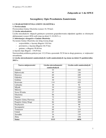 Nr sprawy 271.2.4.2015 Załącznik nr 1 do SIWZ Szczegółowy Opis Przedmiotu Zamówienia I. CHARAKTERYSTYKA GMINY OLSZÓWKA 1. Powierzchnia Powierzchnia Gminy Olszówka wynosi: 81,70 km2. 2. Liczba mieszkańców Liczba mieszkańców objętych gminnym systemem gospodarowania odpadami zgodnie ze złożonymi deklaracjami wynosi 4036 osób (stan na dzień 31.10.2015 r.). 3. Informacja o drogach w Gminie Olszówka Na terenie Gminy Olszówka sieć dróg tworzą drogi: wojewódzkie, o łącznej długości 10,8 km powiatowe, o łącznej długości 44,75 km gminne, o długości 99,40 km co łącznie daje długość : 154,95 km. Nawierzchnią asfaltową pokryte jest 115,19 km a pozostałe 39,76 km to drogi gruntowe, w większości utwardzone. 4. Liczba nieruchomości zamieszkałych i osób zamieszkałych wg stanu na dzień 31 października 2015 r. Nazwa miejscowości Adamin Dębowiczki Drzewce Głębokie Grabina Krzewata Łubianka Młynik Mniewo Nowa Wioska Olszówka Ostrów Ponętów Górny Pierwszy Ponętów Górny Drugi Przybyszew Szczepanów Tomaszew Umień Zawadka Złota Suma Liczba nieruchomości zamieszkałych 55 45 69 84 30 114 30 39 64 27 96 72 52 86 19 28 60 63 36 44 1113 Liczba osób zamieszkałych 200 136 249 339 116 429 92 138 218 103 322 244 201 389 68 79 219 197 139 158 4036 1 Nr sprawy 271.2.4.2015 5. Typ zabudowy Zabudowa jednorodzinna i nieliczna zabudowa wielorodzinna (dwie nieruchomości w m. Ponętów Górny Drugi). 6. Ilość zebranych odpadów komunalnych na terenie gminy Olszówka w latach 2010-2014 (na podstawie sprawozdań przedkładanych przez przedsiębiorców odbierających odpady komunalne z terenu gminy Olszówka). Rodzaj odebranych odpadów 2010 (w Mg) 2011 (w Mg) 2012 (w Mg) 2013 (w Mg) 2014 (w Mg) Zmieszane (niesegregowane) odpady komunalne 189,6 162,7 155,3 310,7 457,5 Papier i tektura 34,3 7,5 10,2 14,6 13,7 Tworzywa sztuczne 10,2 5,9 34 18,6 31,5 Szkło 15 15,1 8,9 19,3 43,8 II. SPOSÓB ODBIORU ODPADÓW KOMUNALNYCH 1. Zabudowa jednorodzinna, zagrodowa oraz samodzielne lokale mieszkaniowe. Na terenie tej zabudowy obowiązywać będzie system mieszany zbiorki odpadów komunalnych poprzez pojemniki i worki. 1) Niesegregowane (zmieszane) odpady komunalne oraz pozostałe odpady zmieszane po segregacji (kod 20 03 01). Niesegregowane (zmieszane) odpady komunalne oraz pozostałe odpady zmieszane po segregacji gromadzone będą w pojemnikach, które dostarcza Wykonawca. Załadunek pojemnika ustawionego w miejscu wyodrębnionym, dostępnym dla pracowników przedsiębiorcy odbierającego odpady, bez konieczności otwierania wejścia na teren nieruchomości lub, gdy takiej możliwości nie ma, wystawionego w dniu odbioru, zgodnie z harmonogramem przed wejście na teren nieruchomości. Obowiązkiem Wykonawcy będzie również odebranie dostawionych przy pojemnikach worków z odpadami komunalnymi niesegregowanymi (właściciele ww. nieruchomości mają możliwość dostawienia tego rodzaju worków własnych, w przypadku gdy pojemność pojemnika w danym miesiącu okaże się niewystarczająca). 2) Selektywnie zbierane odpady komunalne. Na terenie zabudowy selektywna zbiórka odpadów komunalnych będzie odbywać się w systemie workowym. Wprowadza się następujące rodzaje worków z przeznaczeniem na: a) tworzywa sztuczne, opakowania z metali, opakowania wielomateriałowe (kod 20 01 39) – kolor żółty; b) szkło (20 01 02) – kolor biały; c) odpady ulegające biodegradacji, w tym odpady zielone (kod 20 01 08, 20 02 01) – kolor brązowy; z opisem określającym rodzaj gromadzonego odpadu. Worki dostarcza Wykonawca w zależności od potrzeb mieszkańców. Przy jednorazowym odbiorze worków na odpady segregowane z każdego punktu odbioru w zabudowie jednorodzinnej Wykonawca odbierający odpady zobowiązany jest do pozostawienia tej samej ilości worków danego rodzaju. 2 Nr sprawy 271.2.4.2015 2. Zabudowa wielorodzinna Na terenie zabudowy wielorodzinnej obowiązywać będzie system zbiorki odpadów komunalnych poprzez pojemniki. 1) Niesegregowane ( zmieszane) odpady komunalne oraz pozostałe odpady zmieszane po segregacji (20 03 01). Niesegregowane (zmieszane) odpady komunalne oraz pozostałe odpady zmieszane po segregacji gromadzone będą w pojemnikach, które dostarcza Wykonawca. Załadunek pojemnika ustawionego w miejscu wyodrębnionym, dostępnym dla pracowników przedsiębiorcy odbierającego odpady. 2) Selektywnie zbierane odpady komunalne. Selektywna zbiórka odpadów komunalnych będzie odbywać się w systemie pojemnikowym. Wprowadza się następujące rodzaje pojemników oznaczone odpowiednimi kolorami w stosunku do każdego rodzaju odpadu zbieranego selektywnie z przeznaczeniem na: a) tworzywa sztuczne, opakowania z metali, opakowania wielomateriałowe (kod 20 01 39) – kolor żółty; b) szkło (kod 20 01 02) – kolor biały; c) odpady ulegające biodegradacji, w tym odpady zielone (kod 20 01 08, 20 02 01) – kolor brązowy; d) papier i tektura (kod 20 01 01) - kolor niebieski; z opisem określającym rodzaj gromadzonego odpadu. Pojemniki do selektywnej zbiórki zapewni Zamawiający. Poprzez zabudowę wielorodzinną rozumie się dwa budynki zlokalizowane w Ponętowie Górnym Drugim nr 73 i 74. 3. Punkt Selektywnego Zbierania Odpadów Komunalnych Odbieranie odpadów komunalnych z Punktu Selektywnego Zbierania Odpadów Komunalnych, z podziałem na następujące frakcje: a) tworzywa sztuczne, opakowania z metali, opakowania wielomateriałowe (kod 20 01 39), b) szkło (kod 20 01 02), c) papier i tektura ( kod 20 01 01) d) metale (kod 20 01 40), e) zużyty sprzęt elektroniczny i elektryczny (kod 20 01 35, 20 01 36), f) zużyte baterie i akumulatory (kod 20 01 33, 20 01 34), g) zużyte opony (kod 16 01 03), h) meble i inne odpady wielkogabarytowe (kod 20 03 07). Punkt Selektywnego Zbierania Odpadów Komunalnych znajduje się przy Oczyszczalni Ścieków w m. Olszówka. III. CZĘSTOTLIWOŚĆ ODBIORU ODPADÓW KOMUNALNYCH 1) Lp. 1. Zabudowa jednorodzinna Rodzaj