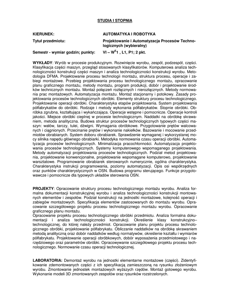 STUDIA I STOPNIA KIERUNEK: AUTOMATYKA I ROBOTYKA Tytuł przedmiotu: Projektowanie i Automatyzacja Procesów Technologicznych (wybieralny) Semestr - wymiar godzin; punkty: VI – WE1 , L1, P1; 2 pkt. WYKŁADY: Wyrób w procesie produkcyjnym. Rozwinięcie wyrobu, zespół, podzespół, części. Klasyfikacja części maszyn, przegląd stosowanych klasyfikatorów. Komputerowa analiza technologiczności konstrukcji części maszyn i analiza technologiczności konstrukcji wyrobu. Metodologia DFMA. Projektowanie procesu technologii montażu, struktura procesu, operacje i zabiegi montażowe. Przebieg projektowania procesu technologicznego montażu, opracowanie planu graficznego montażu, metody montażu, program produkcji, dobór i projektowanie środków technicznych montażu. Montaż połączeń rozłącznych i nierozłącznych. Metody normowania prac montażowych. Automatyzacja montażu. Montaż stacjonarny i potokowy. Zasady projektowania procesów technologicznych obróbki. Elementy struktury procesu technologicznego. Projektowanie operacji obróbki. Charakterystyka etapów projektowania. System projektowania półfabrykatów do obróbki. Rodzaje i metody wykonania półfabrykatów. Stopnie obróbki. Obróbka zgrubna, kształtująca i wykańczająca. Operacje wstępne i pomocnicze. Operacje kontroli jakości. Miejsce obróbki cieplnej w procesie technologicznym. Naddatki na obróbkę skrawaniem, metoda analityczna. Budowa struktur procesów technologicznych typowych części maszyn: wałów, tarczy, tulei, dźwigni. Wymagania obróbkowe. Przygotowanie prętów walcowanych i ciągnionych. Przecinanie prętów i wykonanie nakiełków. Bazowanie i mocowanie przedmiotów obrabianych. System doboru obrabiarek. Sprawdzenie wymaganej i wykorzystanej mocy silnika napędu głównego obrabiarki. Metodyka normowania czasu operacji obróbki. Automatyzacja procesów technologicznych. Minimalizacja pracochłonności. Automatyzacja projektowania procesów technologicznych. Systemy komputerowego wspomaganego projektowania. Metody automatyzacji projektowania procesów technologicznych. Podział metod projektowania, projektowanie konwencjonalne, projektowanie wspomagane komputerowo, projektowanie warsztatowe. Programowanie obrabiarek sterowanych numerycznie, ogólna charakterystyka. Charakterystyka instrukcji programowania, poziomy automatyzacji. Opis osi współrzędnych oraz punktów charakterystycznych w OSN. Budowa programu sterującego. Funkcje przygotowawcze i pomocnicze dla typowych układów sterowania OSN. PROJEKTY: Opracowanie struktury procesu technologicznego montażu wyrobu. Analiza formalna dokumentacji konstrukcyjnej wyrobu i analiza technologiczności konstrukcji montowanych elementów i zespołów. Podział konstrukcji na jednostki montażowe, kolejność operacji i zabiegów montażowych. Specyfikacja elementów zastosowanych do montażu wyrobu. Opracowanie szczegółowego projektu procesu technologicznego montażu wyrobu. Opracowanie graficznego planu montażu. Opracowanie projektu procesu technologicznego obróbki przedmiotu. Analiza formalna dokumentacji i analiza technologiczności konstrukcji. Określenie klasy konstrukcyjno– technologicznej, do której należy przedmiot. Opracowanie planu projektu procesu technologicznego obróbki, projektowanie półfabrykatu. Obliczanie naddatków na obróbkę skrawaniem metodą analityczną oraz dobór naddatków według normatywów, określenie kształtu i wymiarów półfabrykatu. Projektowanie operacji obróbkowych, dobór wyposażenia przedmiotowego i narzędziowego oraz parametrów obróbki. Opracowywanie szczegółowego projektu procesu technologicznego. Normowanie czasu operacji technologicznej. LABORATORIA: Demontaż wyrobu na jednostki elementarne montażowe (części). Zidentyfikowanie zdemontowanych części z ich specyfikacją zamieszczoną na rysunku złożeniowym wyrobu. Zmontowanie jednostek montażowych wyższych rzędów. Montaż gotowego wyrobu. Wykonanie modeli 3D zmontowanych zespołów oraz rysunków rozstrzelonych. Projektowanie struktury operacji obróbki z zastosowaniem optymalizacji. Opracowanie procesu technologicznego obróbki. Analiza przebiegu obróbki otworów na obrabiarce Arrow 500 w aspekcie optymalizacji pomocniczych przemieszczeń narzędzia. Optymalizacja kolejności obróbki otworów za pomocą pakietu QSB. Programowanie obrabiarki. Programowanie ręczne z zastosowaniem systemu MTS. Przegląd instrukcji do programowania OSN, wybór układu współrzędnych, dobór obrabiarki, narzędzi. Programowanie wskazanej operacji tokarskiej-obróbka zgrubna. Opracowanie dokumentacji technologicznej. Osoba odpowiedzialna za przedmiot: Jednostka organizacyjna: Dr inż. Stanisław Gil Instytut Technologii Maszyn i Automatyzacji Produkcji (M-6)
