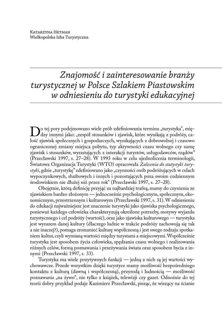 Katarzyna Hetman Wielkopolska Izba Turystyczna Znajomość i zainteresowanie branży turystycznej w Polsce Szlakiem Piastowskim w odniesieniu do turystyki edukacyjnej D o tej pory podejmowano wiele prób zdefiniowania terminu „turystyka”, między innymi jako: „zespół stosunków i zjawisk, które wynikają z podróży, całość zjawisk społecznych i gospodarczych, wynikających z dobrowolnej i czasowo ograniczonej zmiany miejsca pobytu, typ aktywności czasu wolnego czy sumę zjawisk i stosunków, wyrastających z interakcji turystów, usługodawców, rządów” (Przecławski 1997, s. 27–28). W 1993 roku w celu ujednolicenia terminologii, Światowa Organizacja Turystyki (WTO) opracowała Zalecenia do statystyki turystyki, gdzie „turystykę” zdefiniowano jako „czynności osób podróżujących w celach wypoczynkowych, służbowych i innych i pozostających poza swoim codziennym środowiskiem nie dłużej niż przez rok” (Przecławski 1997, s. 27–28). Obojętnie, którą definicję przyjąć za najbardziej trafną, mamy do czynienia ze zjawiskiem bardzo złożonym — jednocześnie psychologicznym, społecznym, ekonomicznym, przestrzennym i kulturowym (Przecławski 1997, s. 31). W odniesieniu do edukacji najważniejsze jest znaczenie turystyki jako zjawiska psychologicznego, ponieważ każdego człowieka charakteryzują określone potrzeby, motywy wyjazdu turystycznego i cel podróży (wartość), oraz jako zjawiska kulturowego — turystyka jest wyrazem danej kultury (dlaczego ludzie w trakcie podróży zachowują się tak a nie inaczej?), pomaga zrozumieć kulturę współczesną i jest swego rodzaju spotkaniem kultur, czyli wymianą wartości między turystami a miejscowymi. Współcześnie turystyka jest sposobem życia człowieka, spędzania czasu wolnego i realizowania różnych celów, formą poznawania i przeżywania świata oraz sposobem bycia z innymi (Przecławski 1997, s. 33). Turystyka ma wiele pozytywnych funkcji — jedną z nich są jej wartości wychowawcze. Przede wszystkim dzięki turystyce mamy możliwość bezpośredniego kontaktu z kulturą (dawną i współczesną), przyrodą i ludnością — możliwość poznawania „na żywo”, nie tylko z książek, telewizji czy gazet. Odnośnie do tej teorii dobry przykład podaje Kazimierz Przecławski, pisząc, że wiszący na ścianie pokoju trójwymiarowy obraz morza, wzbogacony odgłosami fal, ptaków, a nawet rozpylonym w powietrzu zapachem morskiej bryzy, nie da się porównać z przebywaniem na prawdziwej plaży (Przecławski 1997, s. 109–112). Tym samym na pierwszy plan wysuwa się najważniejszy element funkcji wychowawczej — poznawanie świata przez turystykę, szczególnie wśród dzieci i młodzieży. Poza tym dzięki uprawianiu turystyki kształtują się różne postawy u uczniów: życzliwość, sympatia i integracja z odmiennymi zwyczajami czy kulturami, postawa patriotyczna i świadomość narodowa — w szczególności w odniesieniu do krajoznawstwa. Dzięki turystyce tworzą się silne więzy między ludźmi — uczymy się wspólnie pokonywać trudności i niebezpieczeństwa oraz działać solidarnie, aby osiągnąć wyznaczony cel. Turystyka — co jest istotne z punktu widzenia jej funkcji edukacyjnej — stwarza możliwość działania twórczego — przez wykonywanie różnych prac, zadań i dzieł podczas wyjazdu (Przecławski 1997, s. 109–112). Możliwość pracy w zespole integruje uczniów, a dodatkowo pozwala na zdrową rywalizację, która jest elementem aktywizującym w procesie edukacji. Podstawą działalności turystyczno-krajoznawczo-edukacyjnej są wycieczki szkolne. W pracy lekcyjnej, pozalekcyjnej i wychowaniu można wyróżnić: 1) ze względu na liczbę uczestników: wycieczki indywidualne, grupowe i zespołowe — te pełnią najważniejszą rolę w procesie kształcenia; oraz 2) ze względu na poznawane zagadnienia: wycieczki biologiczne, botaniczne, geograficzne, historyczne, plastyczne, polonistyczne i inne, które możemy określić mianem przedmiotowych, czyli skupionych wokół jednego zagadnienia i przedmiotu szkolnego (Denek 1989, s. 138–144). Często — szczególnie ze względu na wprowadzane do szkół w ostatnim czasie tak zwane nauczanie blokowe — organizuje się również wycieczki wieloprzedmiotowe (kompleksowe, interdyscyplinarne, zintegrowane, globalne), łączące tematycznie kilka przedmiotów — na przykład blok przedmiotów humanistycznych lub przyrodniczych. Podziału wycieczek można dokonać, przyjmując też inne klasyfikacje: a) środek transportu — autokarowe, kolejowe, rowerowe, piesze; b) czas trwania — krótkoterminowe (na przykład jednodniowe lub weekendowe) i długoterminowe; c) cel i charakter organizacji — ogólnokrajoznawcze, okolicznościowe, gospodarcze czy kulturalno-oświatowe. Kazimierz Denek (1989, s. 138) podkreśla, że wyjątkowymi walorami odznaczają się właśnie wycieczki weekendowe, zwane „małymi formami krajoznawstwa i turystyki”, ponieważ po pierwsze — stanowią najtańszą formę poznawania okolicy, po drugie — to dobre przygotowanie do dłuższych wyjazdów w celu lepszego poznania kraju ojczystego. Bez względu na to, jaką formę wycieczek wybierzemy, należy przede wszystkim pamiętać, że w odniesieniu do dzieci i młodzieży szkolnej, złe przygotowanie wyjazdu, nieodpowiedni rodzaj transportu, przeładowany lub zbyt skąpy program albo jego brak, nieodpowiedni, niedoświadczony wychowawca, będą stanowić o dysfunkcji, a nie funkcji wychowawczej turystyki. Szkoły powinny dostrzec ogromne możliwości ułatwienia sobie pracy dydaktycznej i wychowawczej przez turystykę, a nie traktować wycieczek jako mus wykonania pewnego planu, co zauważalne WYCIECZKI HISTORYCZNE WĘDRÓWKI TERENOWE WĘDRÓWKI MUZEALNE DOTYCZĄCE DZIEJÓW POLITYCZNYCH DOTYCZĄCE KULTURY DOTYCZĄCE ZAGADNIEŃ SPOŁECZNO-GOSPODARCZYCH Pola bitew, zabytki architektoniczne Muzea o różnej tematyce Miejsca w