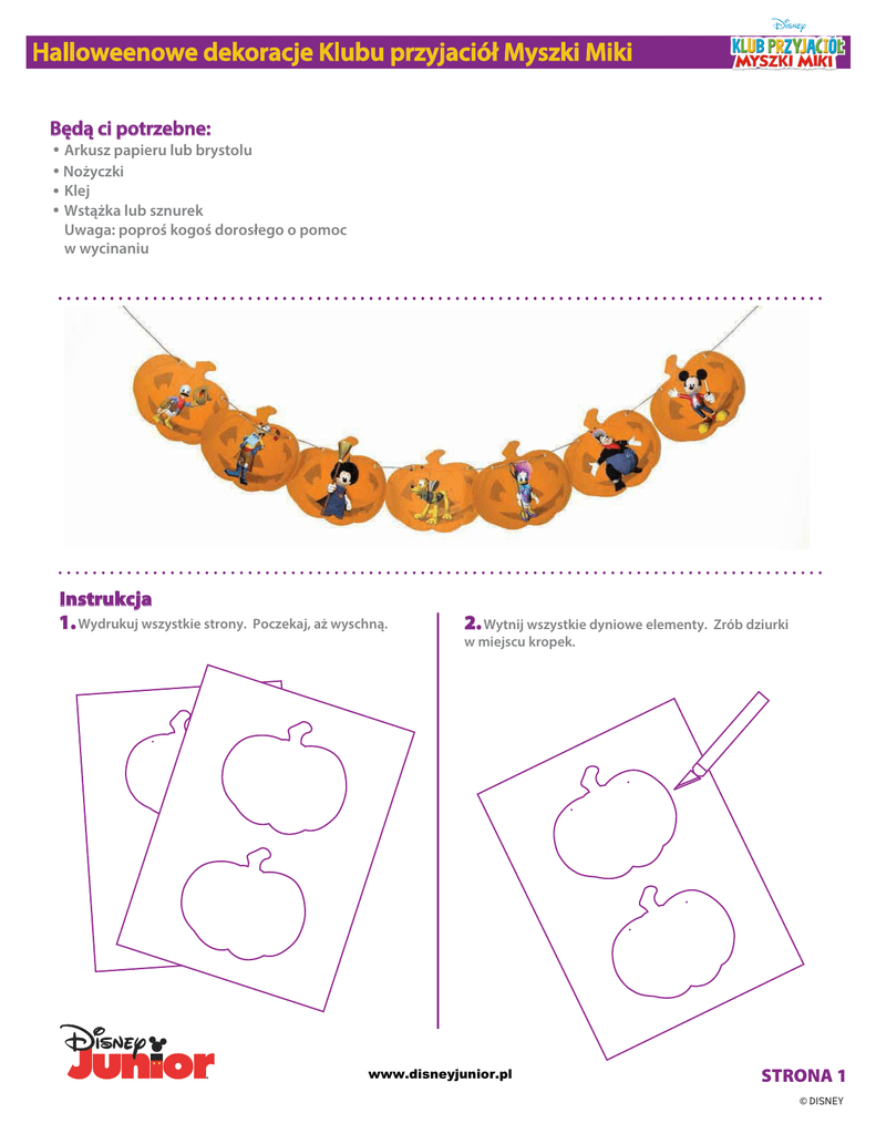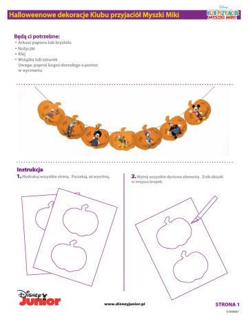 Halloweenowe dekoracje Klubu przyjaciół Myszki Miki Będą ci potrzebne: • Arkusz papieru lub brystolu • Nożyczki • Klej • Wstążka lub sznurek Uwaga: poproś kogoś dorosłego o pomoc w wycinaniu Instrukcja 1. Wydrukuj wszystkie strony. Poczekaj, aż wyschną. 2. Wytnij wszystkie dyniowe elementy. Zrób dziurki w miejscu kropek. www.disneyjunior.pl STRONA 1 © DISNEY Halloweenowe dekoracje Klubu przyjaciół Myszki Miki 3. Połącz ze sobą dyniowe elementy, przeciągając sznurek przez wcześniej zrobione dziurki. Pamiętaj, by sznurek przechodził z tyłu dyni, tak jak przedstawiono na obrazku. www.disneyjunior.pl STRONA 2 © DISNEY Halloweenowe dekoracje Klubu przyjaciół Myszki Miki www.disneyjunior.pl STRONA 3 © DISNEY Halloweenowe dekoracje Klubu przyjaciół Myszki Miki www.disneyjunior.pl STRONA 4 © DISNEY Halloweenowe dekoracje Klubu przyjaciół Myszki Miki www.disneyjunior.pl STRONA 5 © DISNEY Halloweenowe dekoracje Klubu przyjaciół Myszki Miki www.disneyjunior.pl STRONA 6 © DISNEY