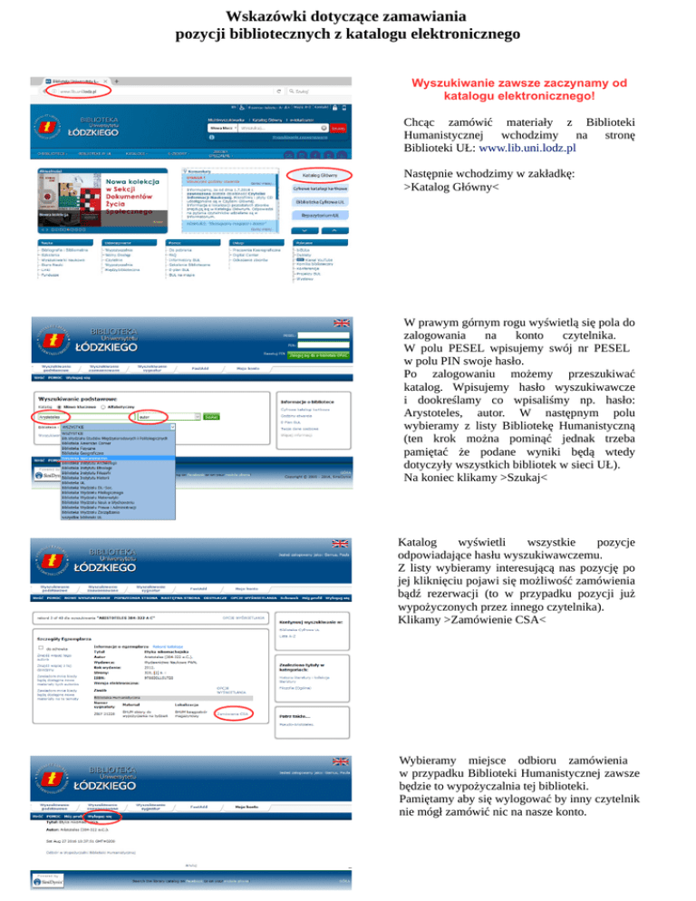 Wskazówki dotyczące zamawiania pozycji bibliotecznych z katalogu elektronicznego Wyszukiwanie zawsze zaczynamy od katalogu elektronicznego! Chcąc zamówić materiały z Biblioteki Humanistycznej wchodzimy na stronę Biblioteki UŁ: www.lib.uni.lodz.pl Następnie wchodzimy w zakładkę: >Katalog Główny< W prawym górnym rogu wyświetlą się pola do zalogowania na konto czytelnika. W polu PESEL wpisujemy swój nr PESEL w polu PIN swoje hasło. Po zalogowaniu możemy przeszukiwać katalog. Wpisujemy hasło wyszukiwawcze i dookreślamy co wpisaliśmy np. hasło: Arystoteles, autor. W następnym polu wybieramy z listy Bibliotekę Humanistyczną (ten krok można pominąć jednak trzeba pamiętać że podane wyniki będą wtedy dotyczyły wszystkich bibliotek w sieci UŁ). Na koniec klikamy >Szukaj< Katalog wyświetli wszystkie pozycje odpowiadające hasłu wyszukiwawczemu. Z listy wybieramy interesującą nas pozycję po jej kliknięciu pojawi się możliwość zamówienia bądź rezerwacji (to w przypadku pozycji już wypożyczonych przez innego czytelnika). Klikamy >Zamówienie CSA< Wybieramy miejsce odbioru zamówienia w przypadku Biblioteki Humanistycznej zawsze będzie to wypożyczalnia tej biblioteki. Pamiętamy aby się wylogować by inny czytelnik nie mógł zamówić nic na nasze konto. Wskazówki dotyczące zamawiania pozycji bibliotecznych z katalogu kartkowego Chcąc zamówić materiały z Katalogu kartkowego w Bibliotece Humanistycznej wchodzimy na stronę Biblioteki UŁ: www.lib.uni.lodz.pl Następnie wchodzimy w zakładkę: >Katalog Główny< i logujemy się na swoje konto. W prawym górnym rogu wyświetlą się pola do zalogowania na konto czytelnika. W polu PESEL wpisujemy swój nr PESEL w polu PIN swoje hasło. Po zalogowaniu klikamy na zakładkę >FastAdd< Wyświetlą się pola, które trzeba uzupełnić danymi z karty katalogowej: tytuł dzieła, autor, sygnatura i miejsce odbioru. Uzupełnić trzeba WSZYSTKIE pola w szczególności pole >sygnatura< wraz z podaniem siglum biblioteki! Sigla bibliotek są następujące: Biblioteka Archeologii: ZBIAR Biblioteka Etnologii: ZBIE Biblioteka Filozofii: ZBIF Biblioteka Historii Sztuki: ZBHS Zamówienia bez podanego siglum NIE BĘDĄ REALIZOWANE ! Zamówienie potwierdzamy klikając >Wyślij< Pamiętamy aby się wylogować by inny czytelnik nie mógł zamówić nic na nasze konto.
