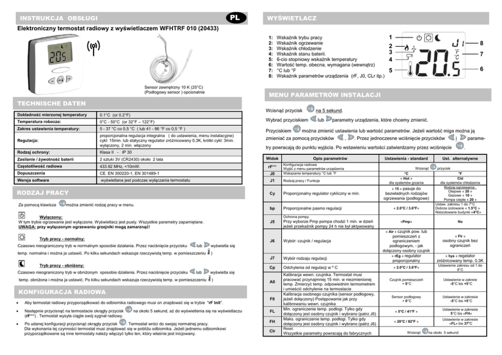 PL INSTRUKCJA OBSŁUGI WYŚWIETLACZ Elektroniczny termostat radiowy z wyświetlaczem WFHTRF 010 (20433) 1: 2: 3: 4: 5: 6: 7: 8: Sensor zewnętrzny 10 K (25°C) (Podłogowy sensor ) opcionalnie Wskaźnik trybu pracy Wskaźnik ogrzewanie Wskaźnik chłodzenie Wskaźnik stanu baterii. 6-cio stopniowy wskaźnik temperatury Wartość temp. obecna, wymagana (wewnątrz) °C lub °F Wskaźnik parametrów urządzenia (rF, J0, CLr itp.) 1 2 3 4 8 7 6 5 MENU PARAMETRÓW INSTALACJI TECHNISCHE DATEN Wcisnąć przycisk na 5 sekund. Dokładność mierzonej temperatury 0.1°C (or 0.2°F) Temperatura robocza: 0°C - 50°C (or 32°F – 122°F) Zakres ustawienia temperatury: 5 - 37 °C co 0,5 °C ( lub 41 - 86 °F co 0,5 °F ) Regulacja: proporcjonalna regulacja integralna ( do ustawienia, menu instalacyjne) cykl: 15min. lub statyczny regulator zróżnicowany 0,3K, krótki cykl: 3min. wyłączony, 2 min. włączony Rodzaj ochrony: Klasa II - IP 30 Zasilanie / żywotność baterii 2 sztuki 3V (CR2430) około 2 lata Częstotliwość radiowa 433.92 MHz, <10mW. Dopuszczenia CE. EN 300220-1, EN 301489-1 J0 Konfiguracja radiowa Wyjść z menu parametrów urządzenia Wskazanie temperatury °C lub °F Wersja software wyświetlana jest podczas wyłączania termostatu J1 Rodzaj pracy / Funkcja Cy Proporcjonalny regulator cykliczny w min. bp Proporcjonalne pasmo regulacji Wybrać przyciskiem Przyciskiem Za pomocą klawisza można zmienić ustawienia lub wartość parametrów. Jeżeli wartość miga można ją Wyłączony: W tym trybie ogrzewanie jest wyłączone. Wyświetlacz jest pusty. Wszystkie parametry zapamiętane. UWAGA: przy wyłączonym ogrzewaniu grzejniki mogą zamarznąć! , . Przez jednoczesne wciśnięcie przycisków i parame- try powracają do punktu wyjścia. Po wstawieniu wartości zatwierdzamy przez wciśnięcie rF““ można zmienić rodzaj pracy w menu. parametry urządzenia, które chcemy zmienić. zmieniać za pomocą przycisków Opis parametrów Widok RODZAJ PRACY lub Ustawienia - standard . Ust. alternatywne Wcisnąć °C « Hot » dla systemów grzania « 15 » pasuje do bezwładnych rodzajów ogrzewania (podłogowe) « 2.0°C / 3.6°F» przycisk °F Cld dla systemów chłodzenia Rodzaj ogrzewania : Olejowe « 20 » Gazowe « 10 » Pompa ciepła « 20 » Ustaw. zakresu 1 do 7°C Dobrze izolowane « 1.5°C » Nieizolowane budynki «4°C» Ochrona pompy. J5 Przy wyborze Pmp pompa chodzi 1 min. w dzień jeżeli przekaźnik pompy 24 h nie był aktywowany «Pmp» No « Air » czujnik pow. lub Tryb pracy - normalny: Czasowo nieograniczony tryb w normalnym sposobie działania. Przez naciśnięcie przycisku lub temp. normalna i można ja ustawić. Po kilku sekundach wskazuje rzeczywistą temp. w pomieszczeniu lub temp. obniżona i można ja ustawić. Po kilku sekundach wskazuje rzeczywistą temp. w pomieszczeniu Wybór: czujnik / regulacja J7 Wybór rodzaju regulacji Cp Odchylenia od regulacji w º C wyświetla się ) Tryb pracy - obniżony: Czasowo nieograniczony tryb w obniżonym sposobie działania. Przez naciśnięcie przycisku J6 wyświetla się ) A0 KONFIGURACJA RADIOWA Aby termostat radiowy przyporządkować do odbiornika radiowego musi on znajdować się w trybie "rF Init". Następnie przycisnąć na termostacie okrągły przycisk (rF““) . Termostat wysyła ciągle swój sygnał radiowy. Po udanej konfiguracji przycisnąć okrągły przycisk . Termostat wróci do swojej normalnej pracy. Dla wykonania tej czynności termostat musi znajdować się w pobliżu odbiornika. Jeżeli jednemu odbiornikowi przyporządkowane są inne termostaty należy włączyć tylko ten, który właśnie jest inicjowany. na około 5 sekund, aż do wyświetlenia się na wyświetlaczu F0 FL FH Clr Kalibracja wewn. czujnika. Termostat musi pracować przynajmniej 15 min. w niezmienionej temp. Zmierzyć temp. odpowiednim termometrem i umieścić odchylenie na termostacie Kalibracja osobnego czujnika (sensor podłogowy, jeżeli dołączony) Postępowanie jak przy kalibrowaniu wewn. czujnika Min. ograniczenie temp. podłogi. Tylko gdy dołączony jest osobny czujnik i wybrano (patrz J6) Maks. ograniczenie temp. podłogi. Tylko gdy dołączony jest osobny czujnik i wybrano (patrz J6) pomieszczeń z ograniczeniem podłogowym, - jak dołączony osobny czujnik « rEg » regulator proporcjonalny « Flr » osobny czujnik bez ograniczeń « hys » regelator zróżnicowany temp. 0,3K « 2.0°C / 3.6°F» Ustawienie zakresu od 1 do 8°C Czujnik pomieszczeń + 0°C Ustawienie w zakreie -5°C bis +5°C Sensor podłogowy + 0°C Ustawienie w zakresie -5°C bis +5°C « 5°C / 41°F » Ustawienie w zakresie 5°C bis «FH» « 28°C / 82°F » Ustawienie w zakresie «FL» bis 37°C Reset. Wszystkie parametry powracają do fabrycznych Wcisnąć na około 5 sekund