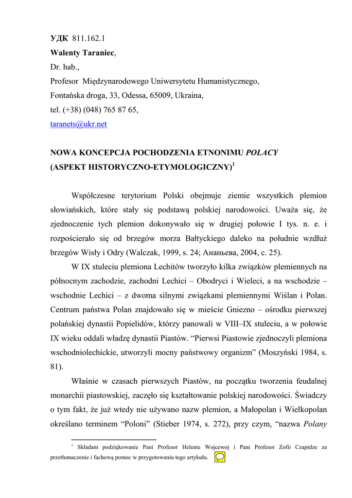 УДК 811.162.1 Walenty Taraniec, Dr. hab., Profesor Międzynarodowego Uniwersytetu Humanistycznego, Fontańska droga, 33, Оdessa, 65009, Ukraina, tel. (+38) (048) 765 87 65, [email protected] NOWA KONCEPCJA POCHODZENIA ЕТNОNІМU POLACY (ASPEKT HISTORYCZNO-ETYMOLOGICZNY)1 Współczesne terytorium Polski obejmuje ziemie wszystkich plemion słowiańskich, które stały się podstawą polskiej narodowości. Uważa się, że zjednoczenie tych plemion dokonywało się w drugiej połowie I tys. n. e. i rozpościerało się od brzegów morza Bałtyckiego daleko na południe wzdłuż brzegów Wisły i Odry (Walczak, 1999, s. 24; Ананьева, 2004, с. 25). W ІХ stuleciu plemiona Lechitów tworzyło kilka związków plemiennych na północnym zachodzie, zachodni Lechici – Obodryci i Wieleci, a na wschodzie – wschodnie Lechici – z dwoma silnymi związkami plemiennymi Wiślan i Polan. Centrum państwa Polan znajdowało się w mieście Gniezno – ośrodku pierwszej polańskiej dynastii Popielidów, którzy panowali w VIII–IX stuleciu, a w połowie ІХ wieku oddali władzę dynastii Piastów. “Pierwsi Piastowie zjednoczyli plemiona wschodniolechickie, utworzyli mocny państwowy organizm” (Moszyński 1984, s. 81). Właśnie w czasach pierwszych Piastów, na początku tworzenia feudalnej monarchii piastowskiej, zaczęło się kształtowanie polskiej narodowości. Świadczy o tym fakt, że już wtedy nie używano nazw plemion, a Małopolan i Wielkopolan określano terminem “Poloni” (Stieber 1974, s. 272), przy czym, “nazwa Polany 1 Składam podziękowanie Pani Profesor Helenie Wojcewoj i Pani Profesor Zofii Czapidze za przetłumaczenie i fachową pomoc w przygotowaniu tego artykułu. używała się nie w stosunku do jednego plemienia, a do związku plemion, które pierwotnie mieszkały na terytorium późniejszej Wielkopolski” (Stieber 1974, s. 273). N. Ananjewa również uważa, że Polanie, Wiślanie, Ślężanie, Mazowszanie i Pomorzanie byli zjednoczeni pod nazwą Polanie (Ананьева, 2004, с. 25). Po raz pierwszy omawiany etnonim pojawia się w “Żywocie świętego Wojciecha”, w którym Bolesław Chrobry określany jest jako “dux Palaniorum”, czyli “przywódca Polan” (Х–XI w.) (Klemensiewicz 1985, s. 20). Później termin powtarza się w kronikach, listach, dokumentach niemieckiego pochodzenia w różnych zlatynizowanych wariantach: Polania, Polani; Polenia, Poleni, Polenii; Polliana; Bulana, Boloni, a najczęściej Polonia, Poloni, również Polska, Polacy (Klemensiewicz 1985, c. 33). W “Powieści minionych lat” Nestor zaznacza, że nazwa Polany wywodzi się od imienia Lachy (Лѧховѣ), jednak, naszym zdaniem, etnonim Lachy historycznie utracił początkową nieakcentowaną sylabę i dlatego ma identyczny rdzeń, jak i etnonim Polany / Polacy (Лаврент. летоп., с. 5). Taki wniosek wynika z badania słowiańskiego etnonimikonu (Таранець, 2013, с. 51), dlatego pochodzenie zapowiedzianego w tytule artykułu etnonimu wywodzimy z jego pierwotnego rdzenia *pol-. W polonistyce dominuje punkt widzenia konwergencyjnego rozwoju narodów (por., na przykład, opinię Z. Klemensiewicza o kształtowaniu państwa polskiego: “Organizacji państwa polskiego towarzyszył proces zjednoczenia plemiennych wspólnot terytorialnych, które, nie uwzględniając trudności w obcowaniu i inne niesprzyjające warunki odwiecznie były bliskie dzięki terytorium i podobnemu rozwojowi języka”) (Klemensiewicz 1985, s. 32), według którego, uważa się, że pierwotnie heterogeniczny całokształt etnojęzyczny formował się na podstawie bliskości terytorialnej i pogańskiej w stosunkowo jedyny etnos i ponadjęzyk (koine) (Таранець, 2013). Taka koncepcja przewija się w pracach wielu czołowych uczonych (J. N. I. Baudouina de Courtenay, Z. Klemensiewicza, F. de Saussura, W. Porziga, G. Piwtoraka, O. Trubaczowa, J. Szewelowa). W takim kierunku kształtowały się narodziny narodowości i tworzenie jedynego języka, co potwierdzają badania dotyczące historii języków słowiańskich (О. Trubaczow, W. Baran, L. Мoszyński, В. Nimczuk, H. Schuster-Šewc), języka ukraińskiego (S. Smal-Stocki, J. Tymczenko), języków germańskich (J. Kuzmenko), języka polskiego (Z. Stieber) oraz niemieckiego (H. Eggers). Oczywiście termin Polska w znaczeniu dialektu, nazwy mieszkańców, państwowości istniał znacznie wcześniej przed zjednoczeniem plemion przyszłego państwa polskiego. Wymienione wyżej plemiona polskie istniały jako słowiańskie w czasach, kiedy nad Wisłą i Odrą pojawili się pierwsi Słowianie. Potwierdzają to badania poświęcone etymologii hydronimu Wisła (Таранець, 2009, с. 209-210). Przypomnimy, że w tej nazwie strukturalnie wydzielają się formanty Wi-sla, Wi-skla, przy czym te ostatnie przypominają odpowiednio rdzenie Sla-wen, Skla-wen w znaczeniu „Słowianie, słowiański”. Z badań diachronicznych wiadomo, że pierwotnie granica fonetyczna (sylabowa) i morfologiczna pokrywały się (W. Kołomijec, W. Taranec), jednak z czasem wskutek przemian w strukturze słowa indoeuropejskiego i przekształcenia struktury trójmorfemowej na dwumorfemową zmieniły się też granice morfologiczne. W tym wypadku dosyć często do rdzenia dodawano następną spółgłoskę sufiksalną (czy samogłoskę), w efekcie rdzeń zmieniał się strukturalnie i przyjmował postać współczesną (M. Guchman, O. Bilecki, J. Tumanian). Tak, współczesne niem. Land miało rdzeń Lan-, jak w ukr. лан, o tym świadczy (lm) niem. Län-der, analogicznie niem. Fel-der i ukr. поле. Wymieniony proces fonetyczny nazywa się „fonetyczną atrakcją”. Oczywiście przed tymi przemianami etnonim Słowian miał strukturę Sla-wen, Skla-wen, przy czym rdzeń w postaci sla/skla- mógł się z czasem desemantyzować i być używany w znaczeniu przyrostka, jak w nazwach Ві-сла, Вор-скла. Stąd dawna nazwy rzeki W