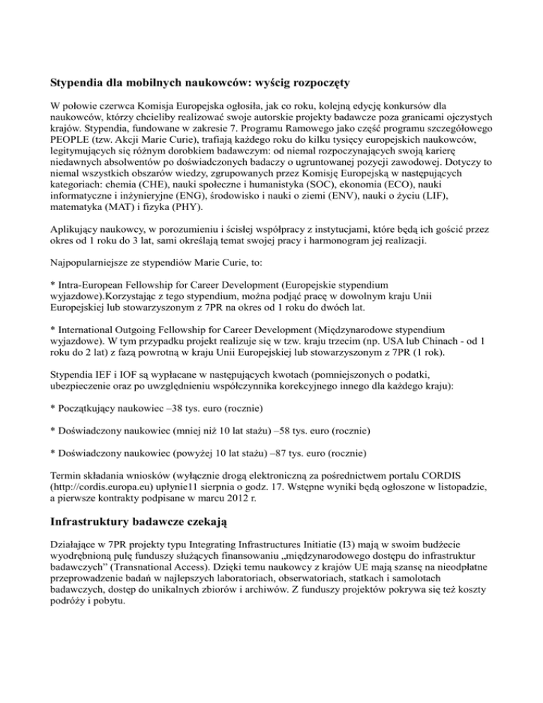 Stypendia dla mobilnych naukowców: wyścig rozpoczęty W połowie czerwca Komisja Europejska ogłosiła, jak co roku, kolejną edycję konkursów dla naukowców, którzy chcieliby realizować swoje autorskie projekty badawcze poza granicami ojczystych krajów. Stypendia, fundowane w zakresie 7. Programu Ramowego jako część programu szczegółowego PEOPLE (tzw. Akcji Marie Curie), trafiają każdego roku do kilku tysięcy europejskich naukowców, legitymujących się różnym dorobkiem badawczym: od niemal rozpoczynających swoją karierę niedawnych absolwentów po doświadczonych badaczy o ugruntowanej pozycji zawodowej. Dotyczy to niemal wszystkich obszarów wiedzy, zgrupowanych przez Komisję Europejską w następujących kategoriach: chemia (CHE), nauki społeczne i humanistyka (SOC), ekonomia (ECO), nauki informatyczne i inżynieryjne (ENG), środowisko i nauki o ziemi (ENV), nauki o życiu (LIF), matematyka (MAT) i fizyka (PHY). Aplikujący naukowcy, w porozumieniu i ścisłej współpracy z instytucjami, które będą ich gościć przez okres od 1 roku do 3 lat, sami określają temat swojej pracy i harmonogram jej realizacji. Najpopularniejsze ze stypendiów Marie Curie, to: * Intra-European Fellowship for Career Development (Europejskie stypendium wyjazdowe).Korzystając z tego stypendium, można podjąć pracę w dowolnym kraju Unii Europejskiej lub stowarzyszonym z 7PR na okres od 1 roku do dwóch lat. * International Outgoing Fellowship for Career Development (Międzynarodowe stypendium wyjazdowe). W tym przypadku projekt realizuje się w tzw. kraju trzecim (np. USA lub Chinach - od 1 roku do 2 lat) z fazą powrotną w kraju Unii Europejskiej lub stowarzyszonym z 7PR (1 rok). Stypendia IEF i IOF są wypłacane w następujących kwotach (pomniejszonych o podatki, ubezpieczenie oraz po uwzględnieniu współczynnika korekcyjnego innego dla każdego kraju): * Początkujący naukowiec –38 tys. euro (rocznie) * Doświadczony naukowiec (mniej niż 10 lat stażu) –58 tys. euro (rocznie) * Doświadczony naukowiec (powyżej 10 lat stażu) –87 tys. euro (rocznie) Termin składania wniosków (wyłącznie drogą elektroniczną za pośrednictwem portalu CORDIS (http://cordis.europa.eu) upłynie11 sierpnia o godz. 17. Wstępne wyniki będą ogłoszone w listopadzie, a pierwsze kontrakty podpisane w marcu 2012 r. Infrastruktury badawcze czekają Działające w 7PR projekty typu Integrating Infrastructures Initiatie (I3) mają w swoim budżecie wyodrębnioną pulę funduszy służących finansowaniu „międzynarodowego dostępu do infrastruktur badawczych” (Transnational Access). Dzięki temu naukowcy z krajów UE mają szansę na nieodpłatne przeprowadzenie badań w najlepszych laboratoriach, obserwatoriach, statkach i samolotach badawczych, dostęp do unikalnych zbiorów i archiwów. Z funduszy projektów pokrywa się też koszty podróży i pobytu. Obecnie funkcjonuje ok. 60 projektów typu I3 oraz kilkadziesiąt kolejnych projektów finansujących dostęp do e-infrastruktury. Informacje o wszystkich tych projektach dostępne są przez stronę http://ec.europa.eu/research/infrastructures/index_en.cfm?pg=projects Na stronach wszystkich projektów typu I3 pojawiają się co pewien czas ogłoszenia dotyczące możliwości zgłaszania propozycji badań przez naukowców zainteresowanych skorzystaniem z infrastruktur określonego typu. Pani astronom z Wrocławia w „Wysokich Obcasach Extra” Z przyjemnością informujemy, że w najnowszym wydaniu„Wysokich Obcasów Extra” ukazał się obszerny wywiad z dr Joanną Molendą-Żakowicz z Instytutu Astronomicznego Uniwersytetu Wrocławskiego. Dr Molenda-Żakowicz jest koordynatorem rozpoczętego z początkiem kwietnia projektu ASK (Sounding Stars with Kepler) w ramach 7. Programu Ramowego. Razem z astronomami z trzynastu uczelni na całym świecie będzie badać wnętrza gwiazd pulsujących (tzn. takich, które okresowo zmieniają swój kształt i jasność), które są obserwowane przez teleskop Kepler. Czteroletni projekt jest realizowany w ramach Marie Curie International Research Staff Exchange Scheme (IRSES), akcji umożliwiającej wymianę pracowników naukowych z ośrodków z całego świata. Fundacja Lanckorońskich wspiera humanistów Humaniści, którzy chcą przeprowadzić badania naukowe np. w Rzymie, Wiedniu, Londynie oraz innych ośrodkach naukowych w Europie mogą starać się o przyznanie stypendium Fundacji Lanckorońskich. Jest ono przyznawane na okres od 1 do 3 miesięcy naukowcom zajmującym się archeologią śródziemnomorską, historią, historią sztuki oraz historią filozofii. Ważne jest, żeby zakres poruszanej przez nich tematyki nie wykraczał poza 1939 rok. Stypendyści wyjeżdżający do Rzymu otrzymają dodatkowo od Fundacji zakwaterowanie na okres wyjazdu w tym mieście. Wyjeżdżającym do Wiednia Fundacja ułatwia znalezienie lokum. Stypendia przyznawane są w trybie konkursowym. Wnioski należy składać do 15 maja br. Konkursy MNiSW dla humanistów Minister Nauki i Szkolnictwa Wyższego ogłosił pięć nowych konkursów na realizację projektów w ramach poszczególnych modułów Narodowego Programu Rozwoju Humanistyki, który ma za zadanie kierować dodatkowe środki finansowe na badania z zakresu humanistyki. Celem Programu jest rozwijanie i kontynuowanie kierunków badawczych o istotnym znaczeniu dla kultury narodowej. NPRH ma umożliwić lepszą integrację polskiej humanistyki z humanistyką europejską, a w konsekwencji światową. Działania mają również zapewnić młodym naukowcom specjalizującym się w badaniach humanistycznych najlepsze możliwości rozwoju kariery naukowej we współpracy z zagranicznymi ośrodkami naukowymi oraz doprowadzić do upowszechnienia osiągnięć polskiej humanistyki. Nowy przewodnik finansowy Na portalu CORDIS opublikowany został uaktualniony przewodnik finansowy, przydatny dla realizatorów projektów w ramach 7. Programu Ramowego. Dokument znale